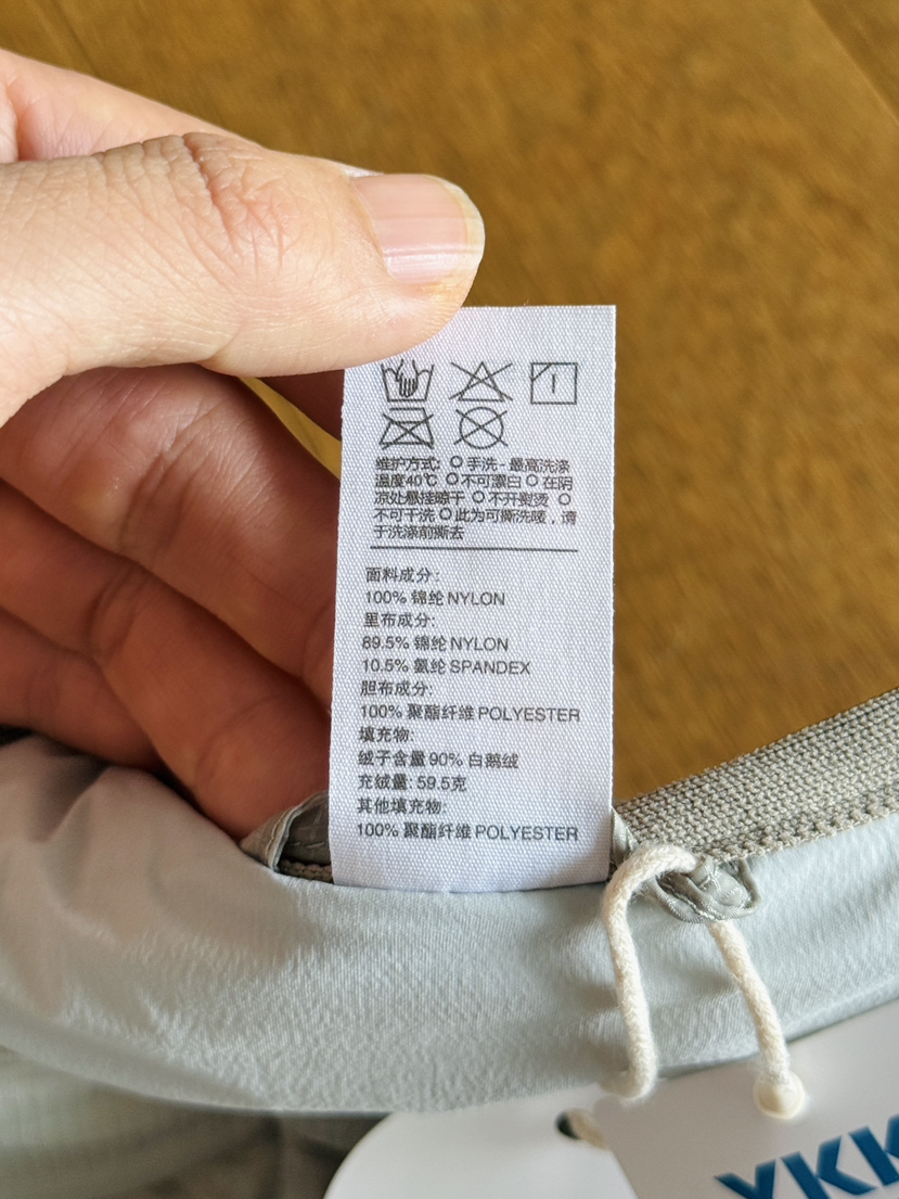 面料:100%锦纶【外层做了三防,搞点油/粉底之类的湿巾擦一下就干净】,尽可能的减少清洗次数,羽绒服会更保暖。如选择机洗最好是羽绒服模式,烘干机烘后会很蓬松!