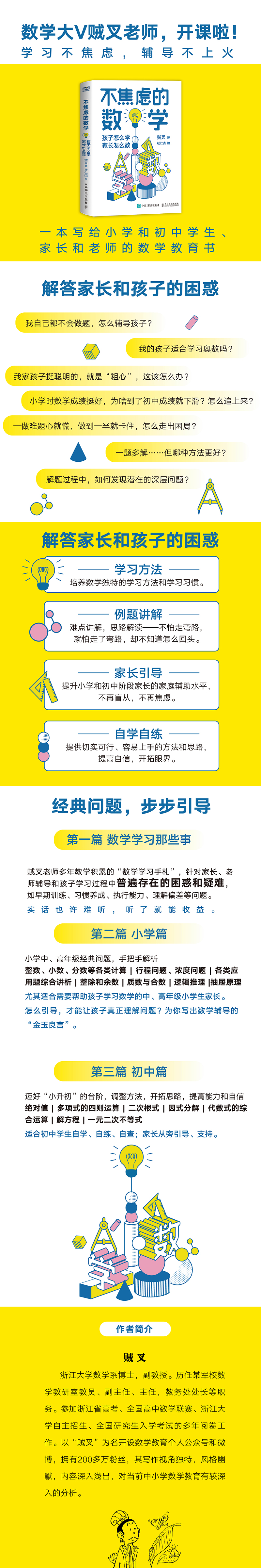 《不焦虑的数学 孩子怎么学 家长怎么教》 博士毕业于浙江大学数学系,副教授。历任某军校数学教研室教员、副主任、主任,教务处处长等职务。参加过多年浙江省高考、*高中数学联赛、浙江大学自主招生、*研究生入学考试的阅卷工作。现开设数学教育个人*贼叉,粉丝数*过5万人,对于当前的中小数学教育有较为深入的研究,视角独特,写作风格风趣幽默,深入浅出。 《不焦虑的几何:孩子怎么学,家长怎么教》 贼叉,博士毕业于浙江大学数学系,副教授。历任某军校数学教研室教员、副主任、主任,教务处处长等职务。参加过多年浙江省高考、*高中数学联赛、浙江大学自主招生、*研究生入学考试的阅卷工作。 《不焦虑的函数:从中考到高考》 贼叉,博士毕业于浙江大学数学系,副教授。参加过多年浙江省高考、*高中数学联赛、浙江大学自主招生、研究生入学考试的阅卷工作。开设数学科普和教育个人账号,对于当前的中小数学教育有较为深入的研究,视角独特,写作风格风趣幽默,深入浅出。著有热销书《不焦虑的数学:孩子怎么学,家长怎么教》《不焦虑的几何:孩子怎么学,家长怎么教》,被评为“当当第八届影响力作家”。