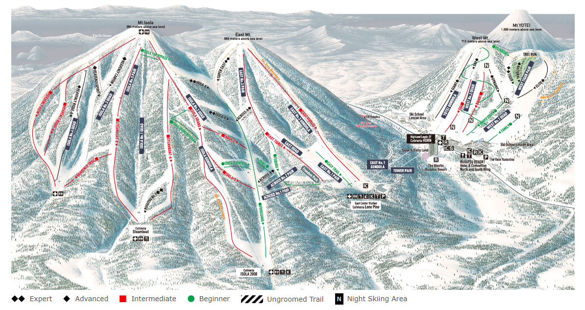 Rusutsu,由3座山头组成的超大滑雪场,在这里可以同时将羊蹄山和洞爷湖尽收眼底,这里也有非常丰富的雪道组成和树林野雪线路