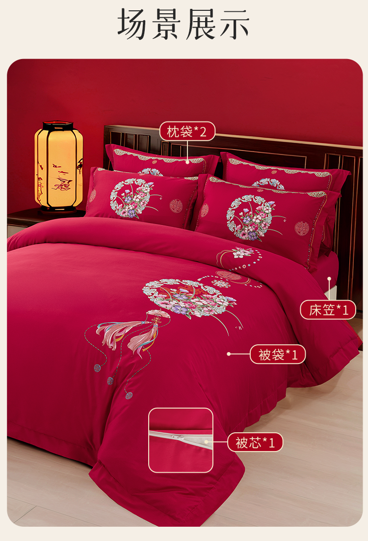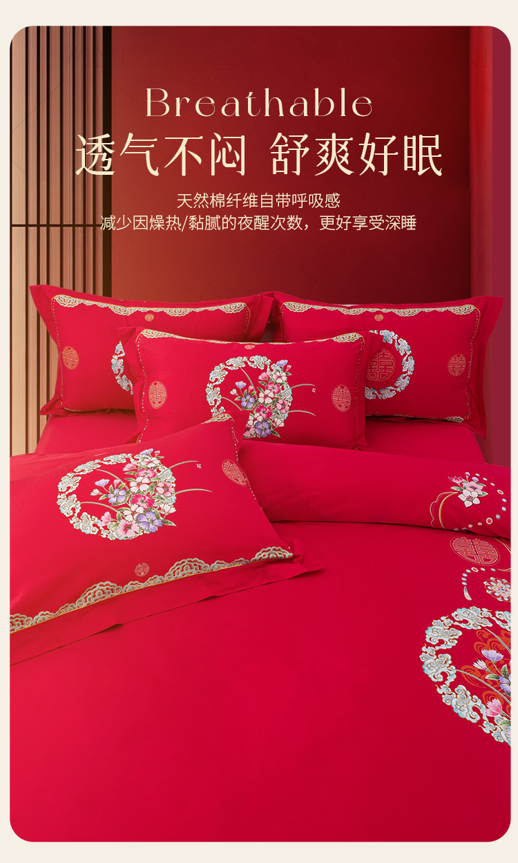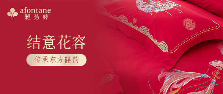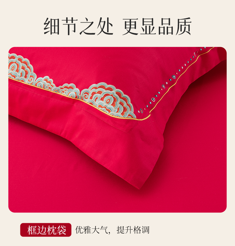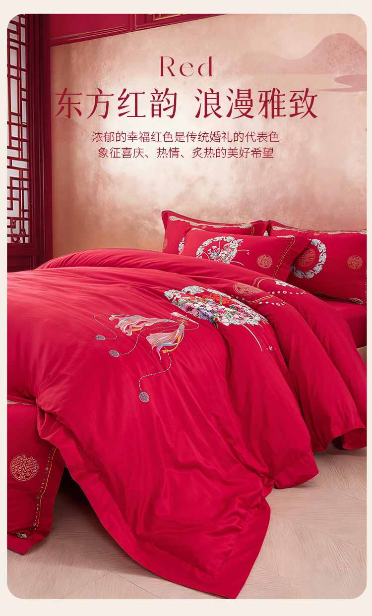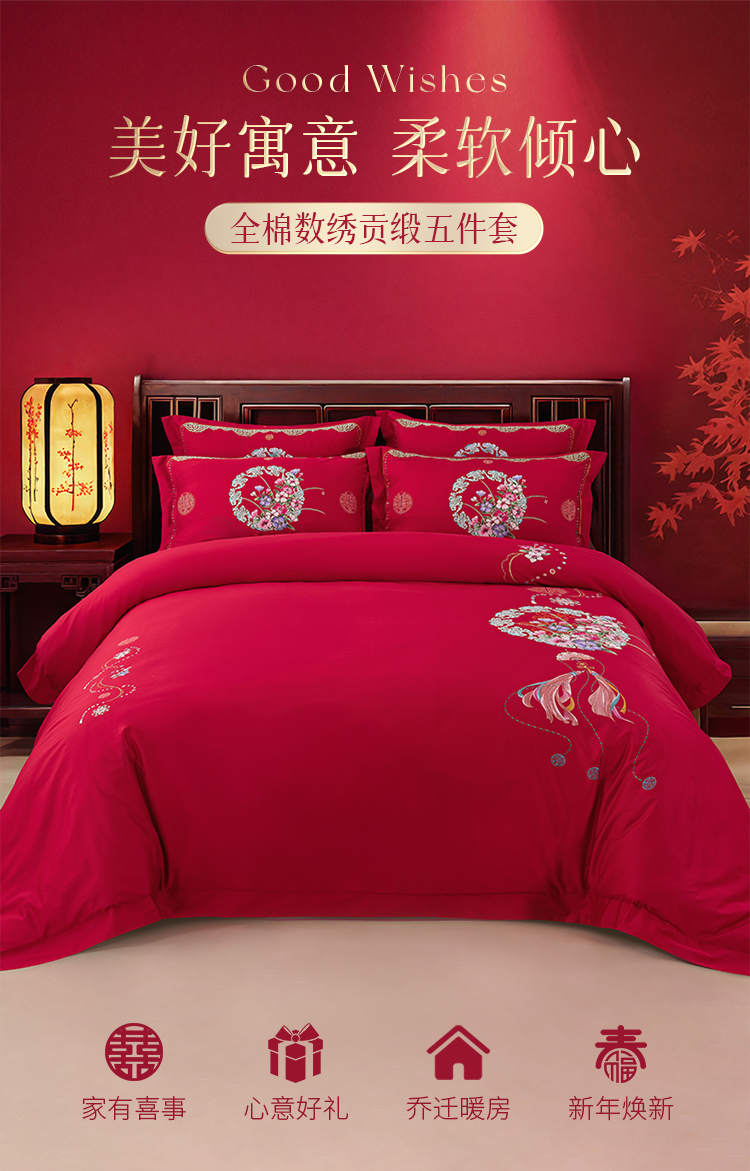 2025年新款雅芳婷全棉婚庆五件套床笠款贡缎数绣被套结婚床上用品