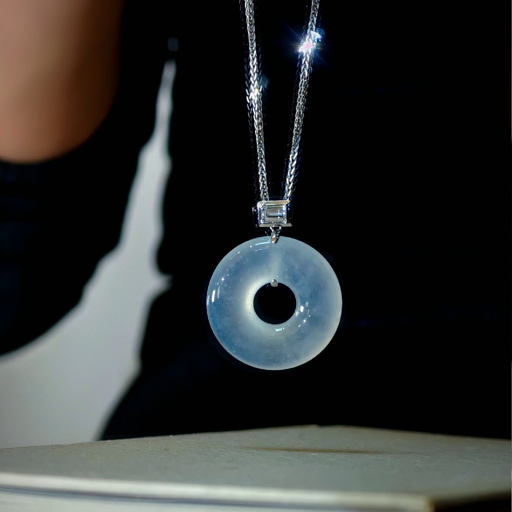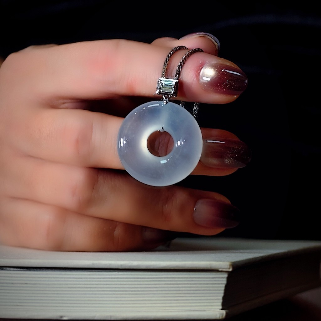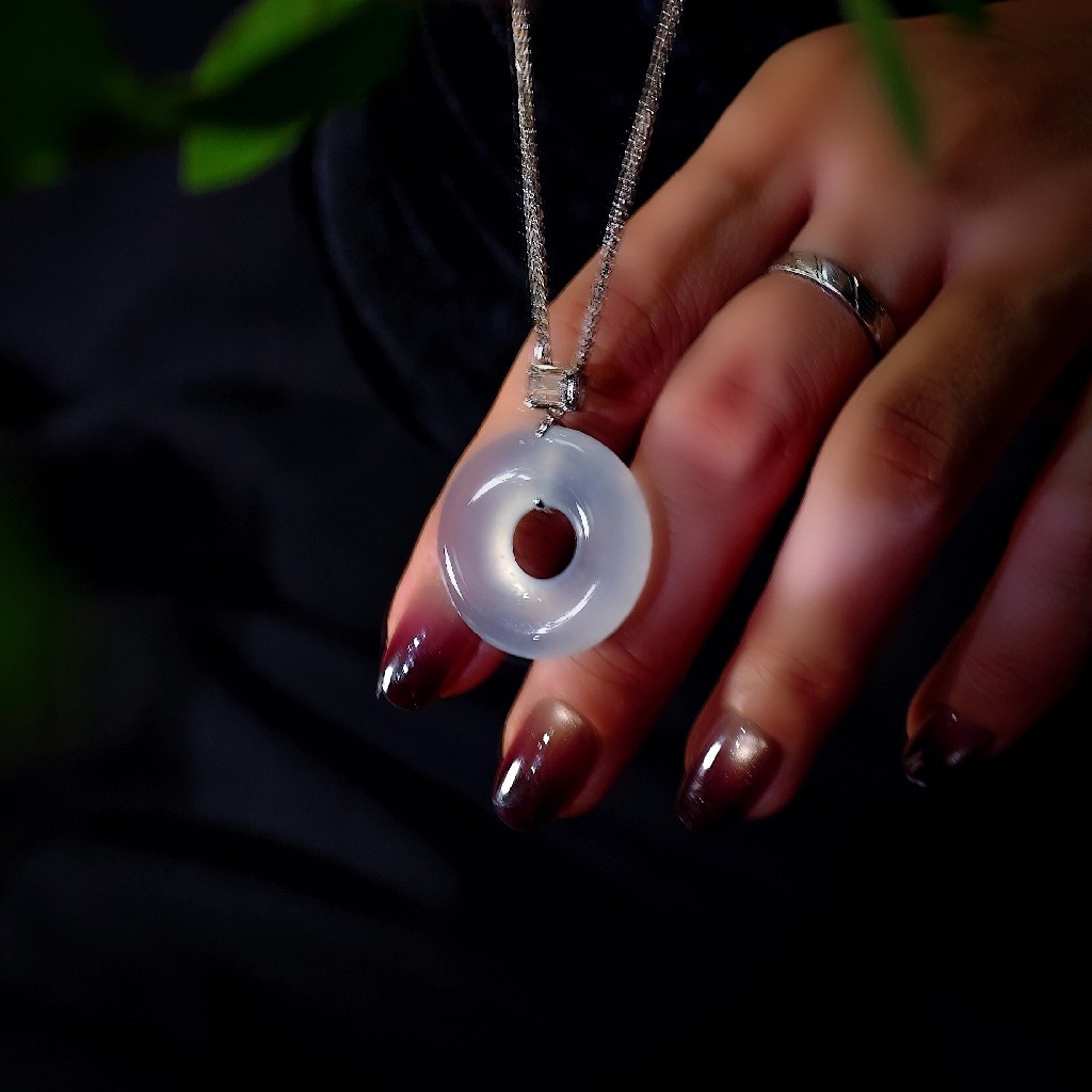 这枚蛋清种翡翠甜甜圈扣,是时光赠予的凝萃之礼。它的白,不是素然寡淡的白,是蛋清初凝时的柔润,带着化不开的胶质感,在光下泛着朦胧的光晕缓缓流淌。那是一种“近看无物,远观有韵”的通透,仿佛将一汪春水凝练成玉,触手温润,目之所及皆是含蓄的奢美。