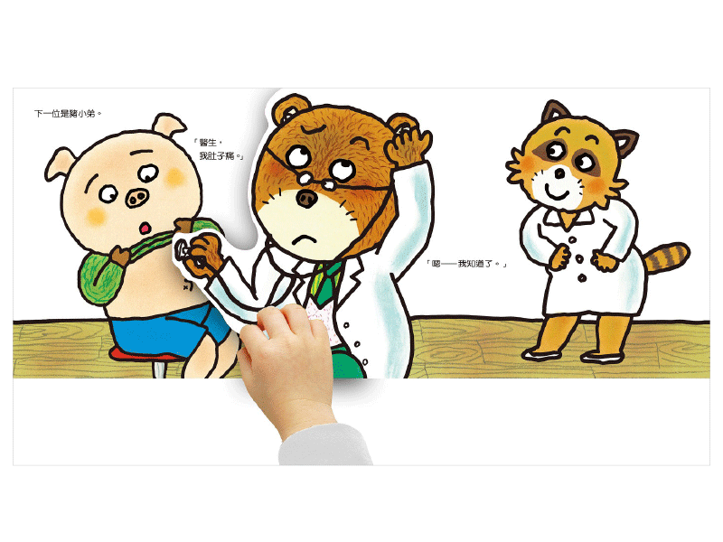 《加油!熊医生》利用有趣的轧型翻页,让孩子反复模拟看医生的情景,了解儿科诊所里的情形,以及常见的儿童疾病及检查方法,让孩子不害怕就医。