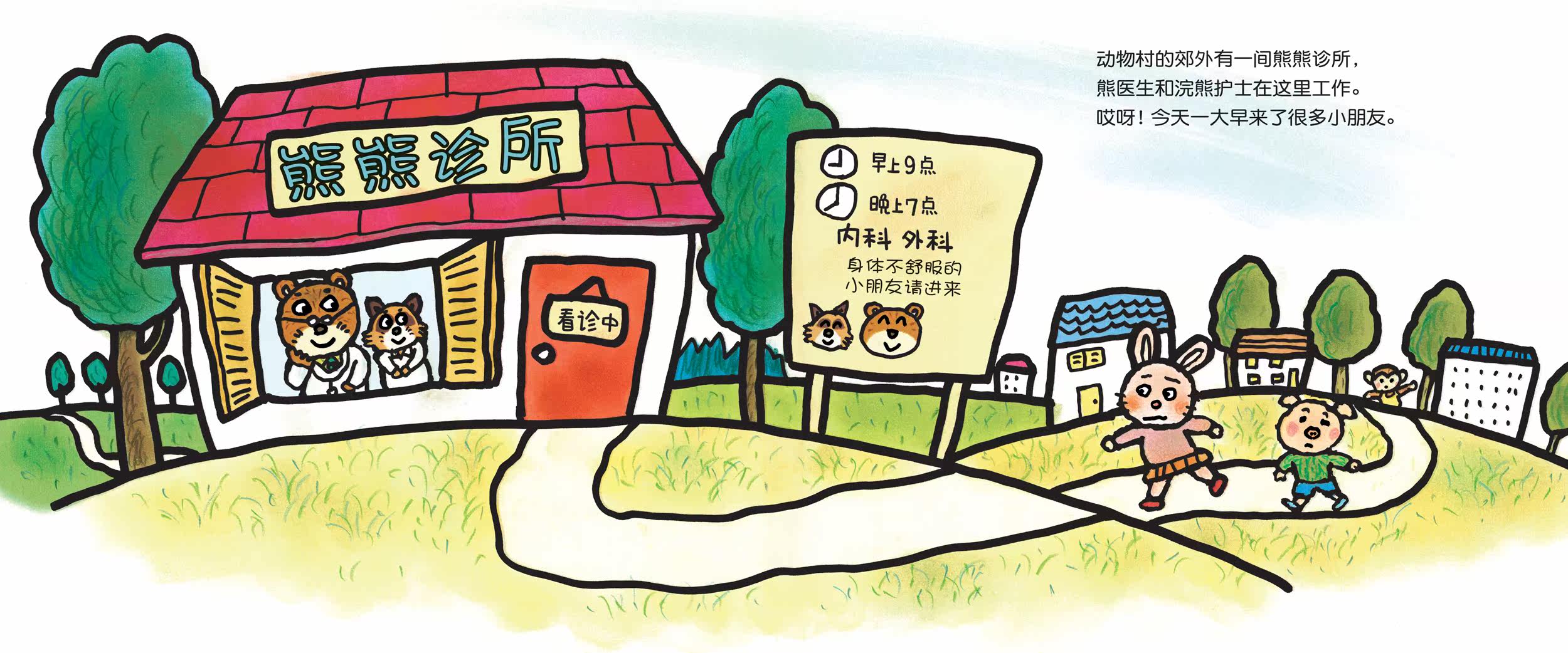 动物村的郊外有一间熊熊诊所,浣熊小姐是这里的护士,今天一大早就有好多小朋友来看病。第一位病人是喉咙痛的小兔子,熊医生说:“把嘴巴张开,啊——”原来小兔子是喉咙发炎,好好漱口、喝药水就会康复。下一位病人是猪小弟,他说:“医生,我肚子痛。”熊医生用听诊器仔细检查,发现猪小弟肚子痛是感冒引起的,交代猪小弟好好吃药、休息。第三个病人是小猴子,他要来打流感疫苗,看到又粗又大的针筒,忍不住紧张地发抖……看医生,是许多孩子的恶梦,一想到吃药的可怕之处,许多孩子宁可忍着身体的不舒服,任凭爸妈好说歹说,也不愿上诊所去看医生,如果要打针,更是抵死不从。可是,再怎么不想去还是得去,爸妈是不是可以做些什么,减轻孩子看医生的焦虑呢?