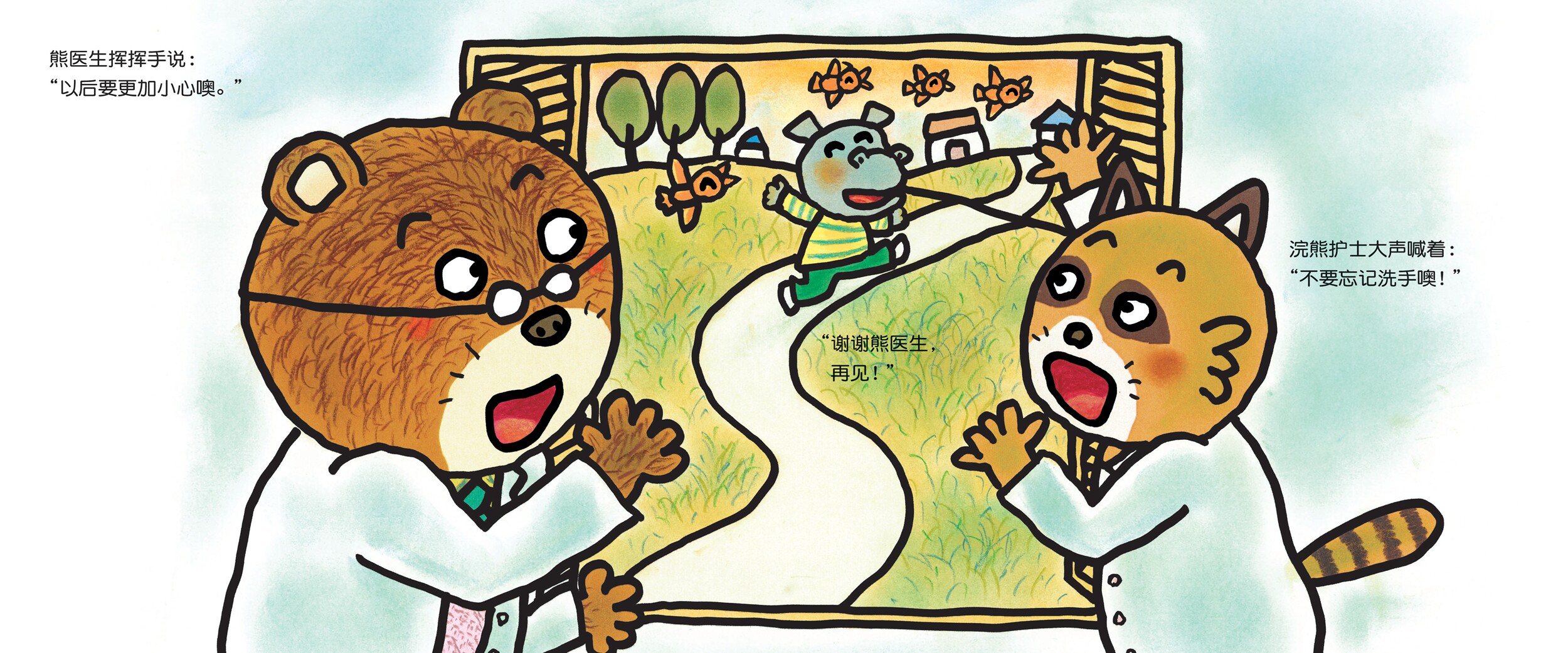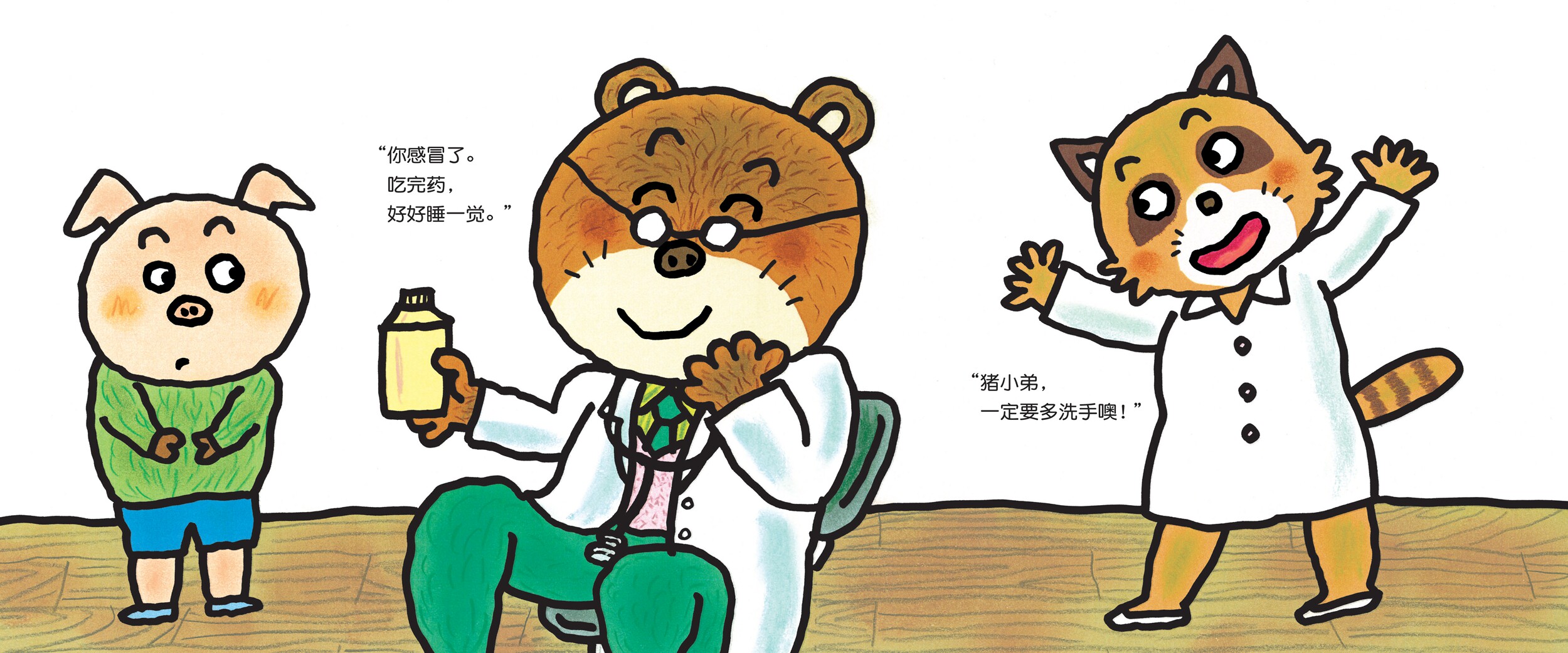 书中还提到医院的几个常规功能,如喉咙痛、肚子痛时,医生能替病人诊断、开药,也可以打流感疫苗、预防感冒,这些都是孩子去医院会遇到的情况。最后,还通过浣熊护士的话反复提醒“一定要常洗手噢!”,增强生活中的卫生保健意识。