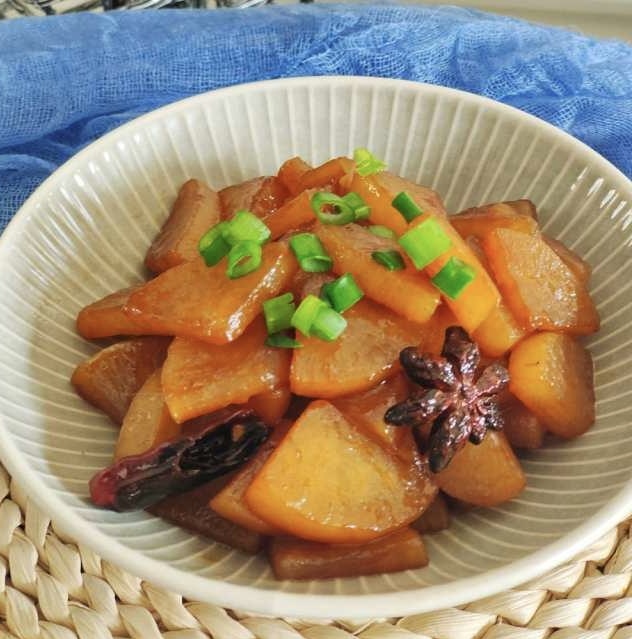 或者,你也可以将它切成稍厚一点的片,与五花肉一同红烧,猪肉的油香渗入萝卜中,更能映衬出萝卜的清甜,回味甘爽。