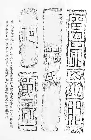 “万岁不败”四字篆书,间饰以卷云纹,虽多具装饰趣味,然结字多求对称,取平正方直之势,唯此砖线条直中寓曲、正中寓奇,体势圆转流畅,似更耐品味。其背面多模印几何纹画像,纹饰古朴简约。此砖曾著录于《千甓亭古砖图释》(见下图),而且曾多次拍出高价,极具观赏和收藏价值。