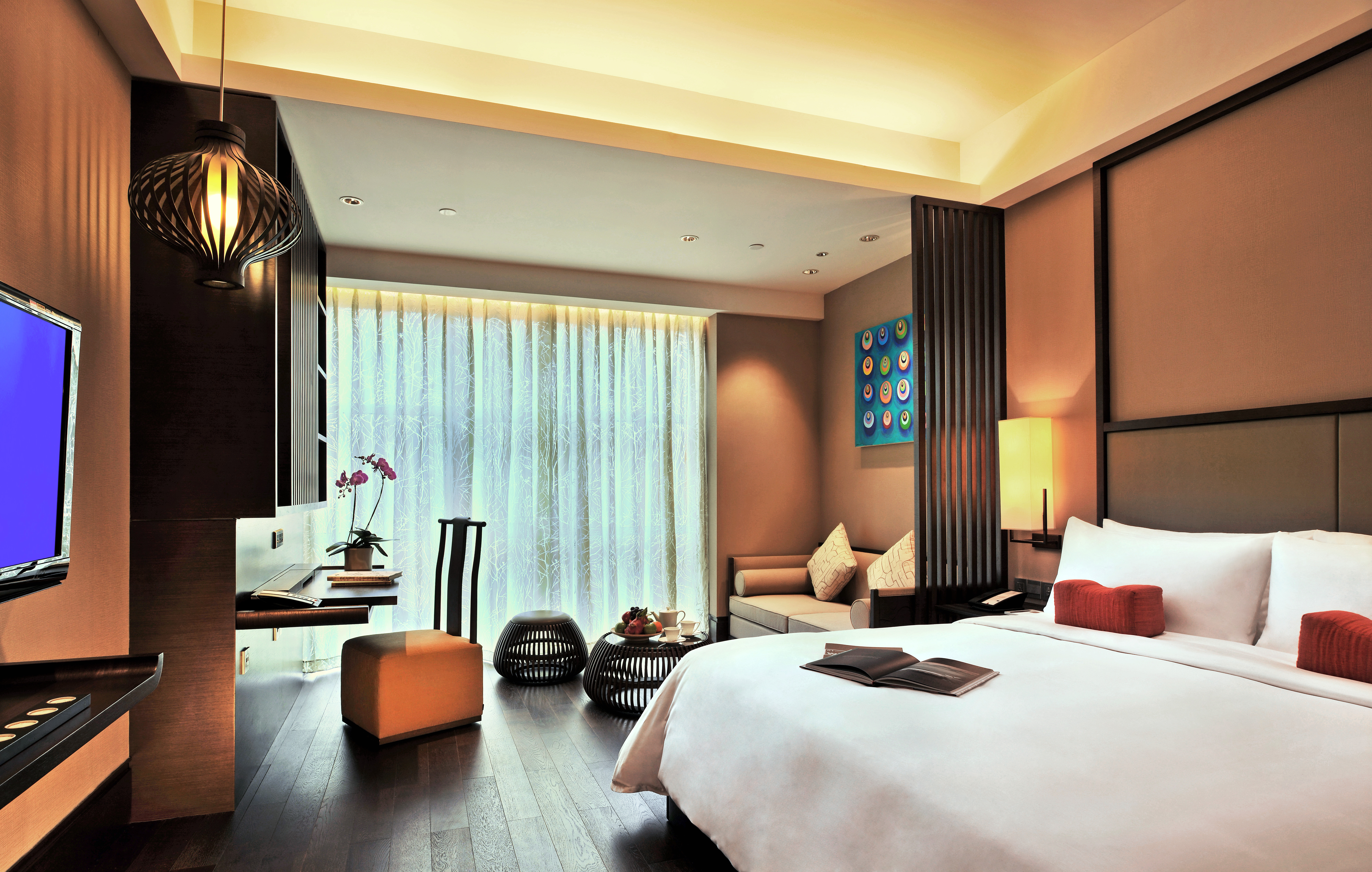 整个酒店拥有412 间客房,设计风格整体偏中式,古色古香格调感十足,但是在硬件设施配套上又完全体现出了奢华气质:定制的深木雕琢陈设品、实木地板、中式学者桌椅以及艺术品的摆设都令客房耳目一新。