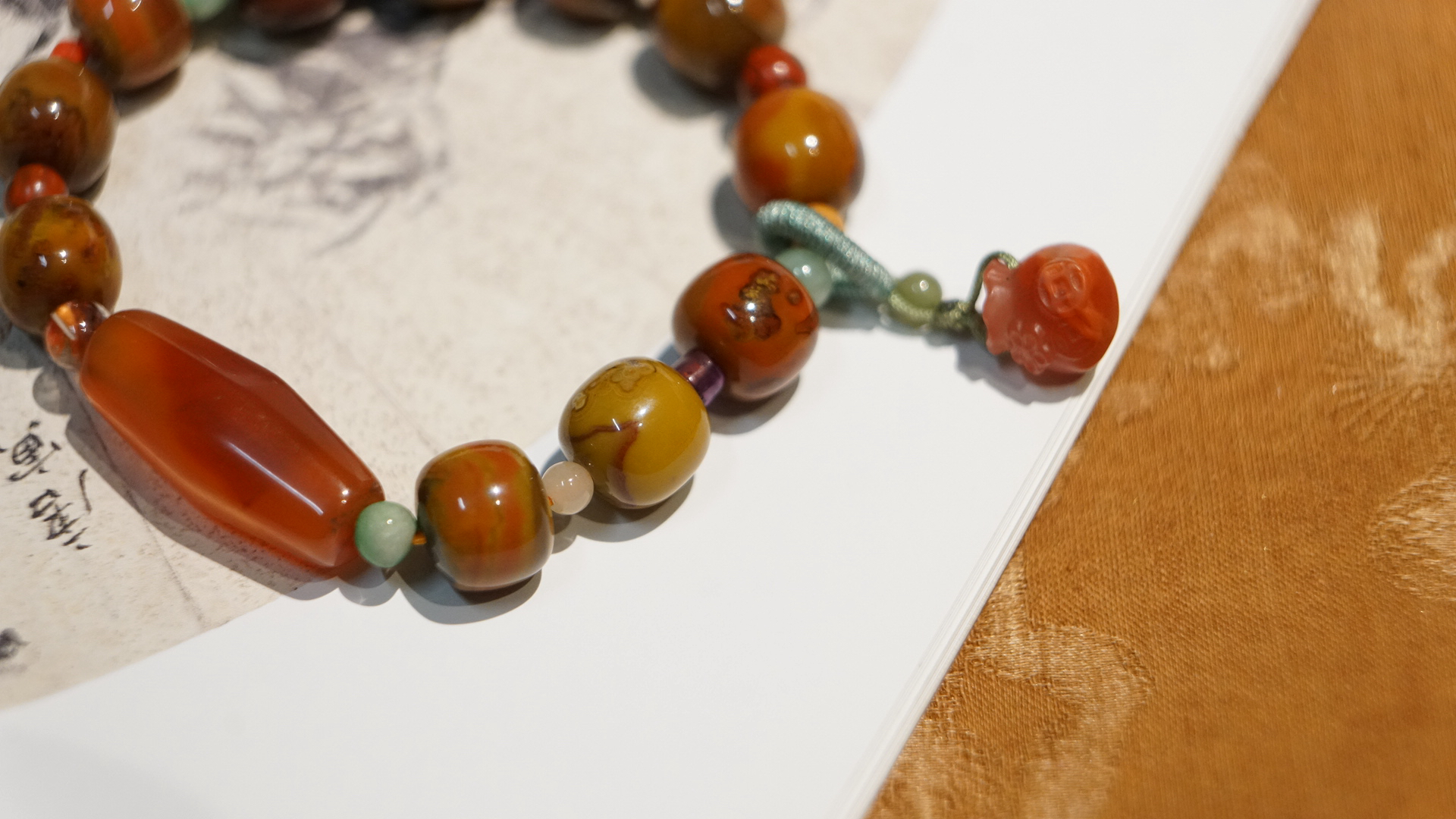料子非常油润细腻,鸡油黄质感,润润的!一直很爱战国红玛瑙,因为其玛瑙的颜色花纹很美很美,自然落成~像大地像秋色~精品的战国红玛瑙越来越少,这几年我是没看到!!!
