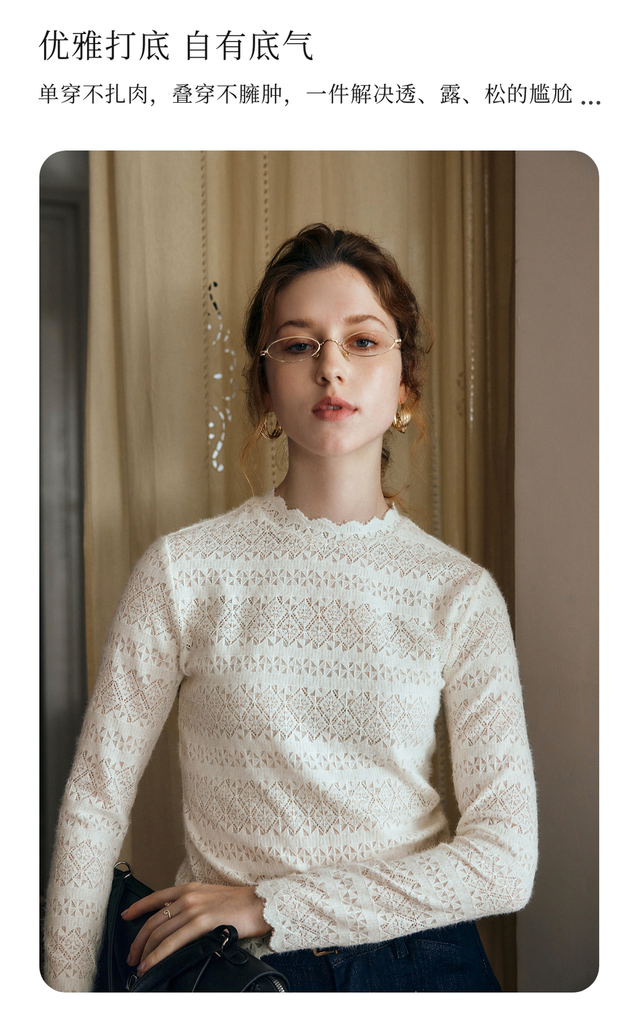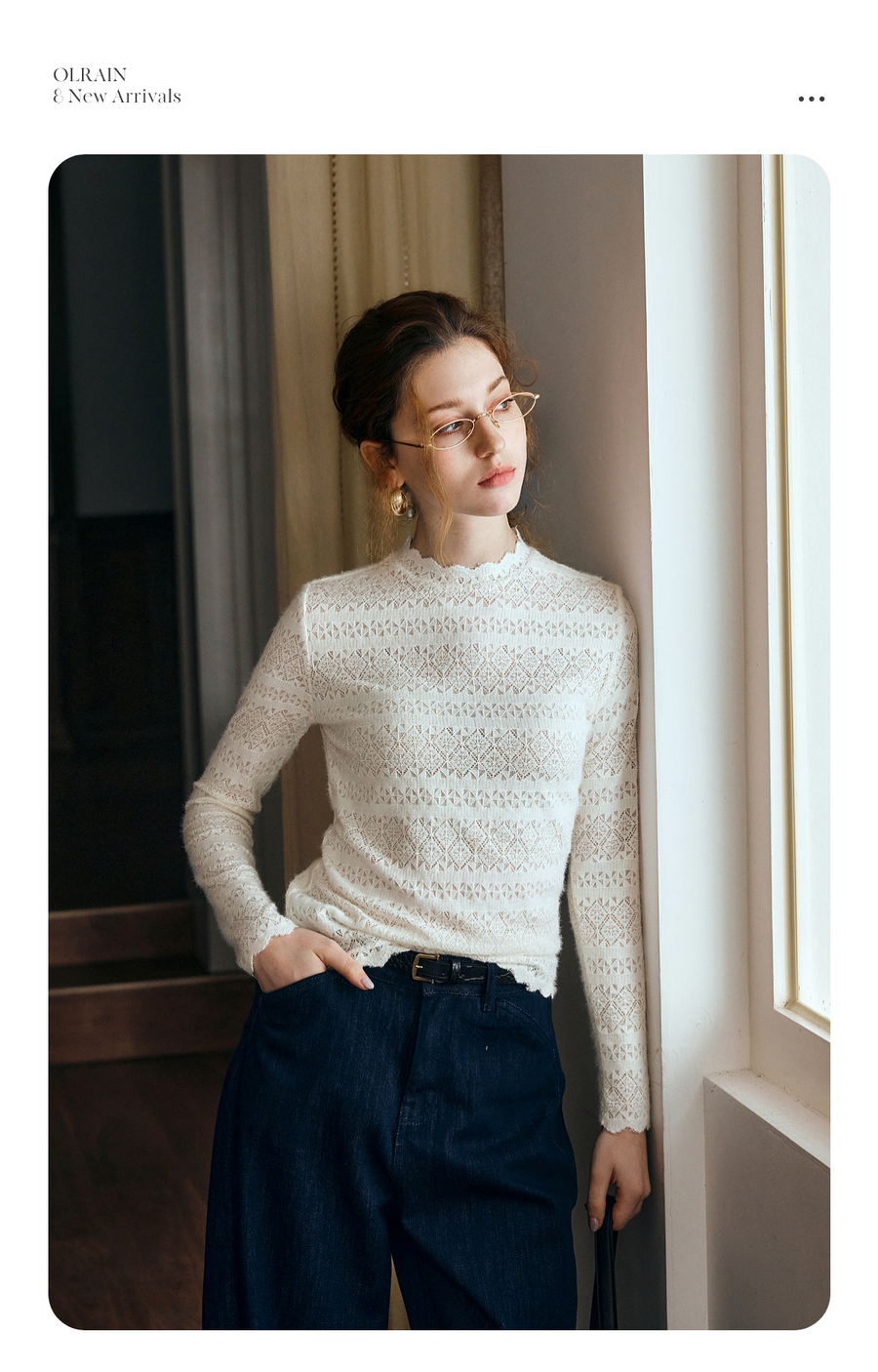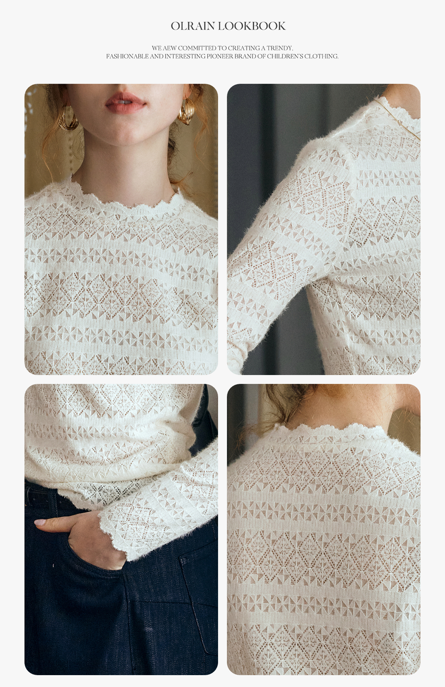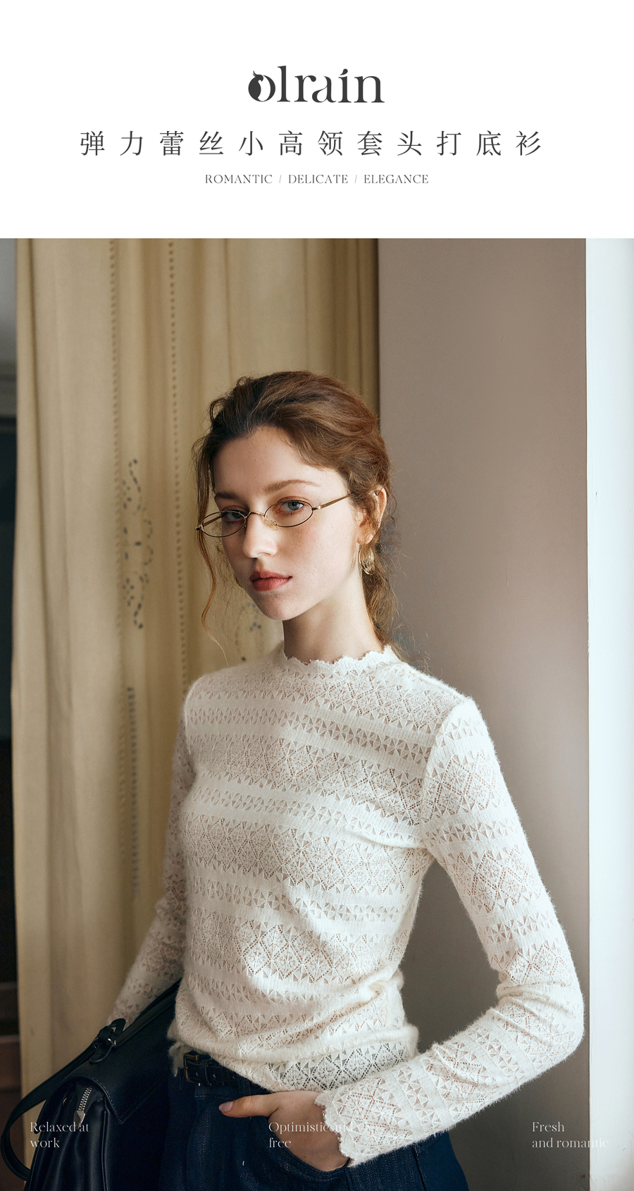 OLrain欧芮儿小高领套头蕾丝打底衫2025秋季新款法式长袖打底上衣