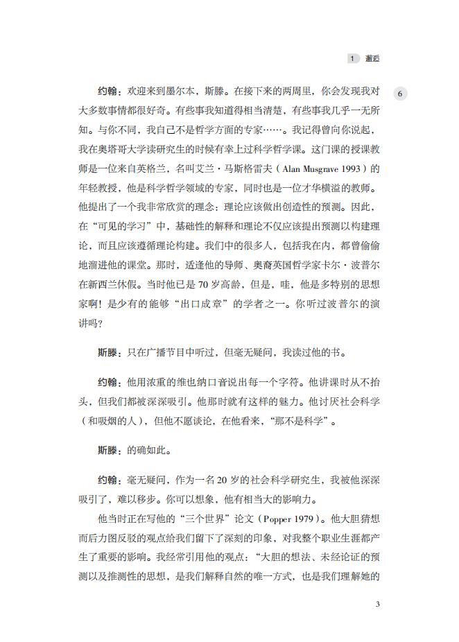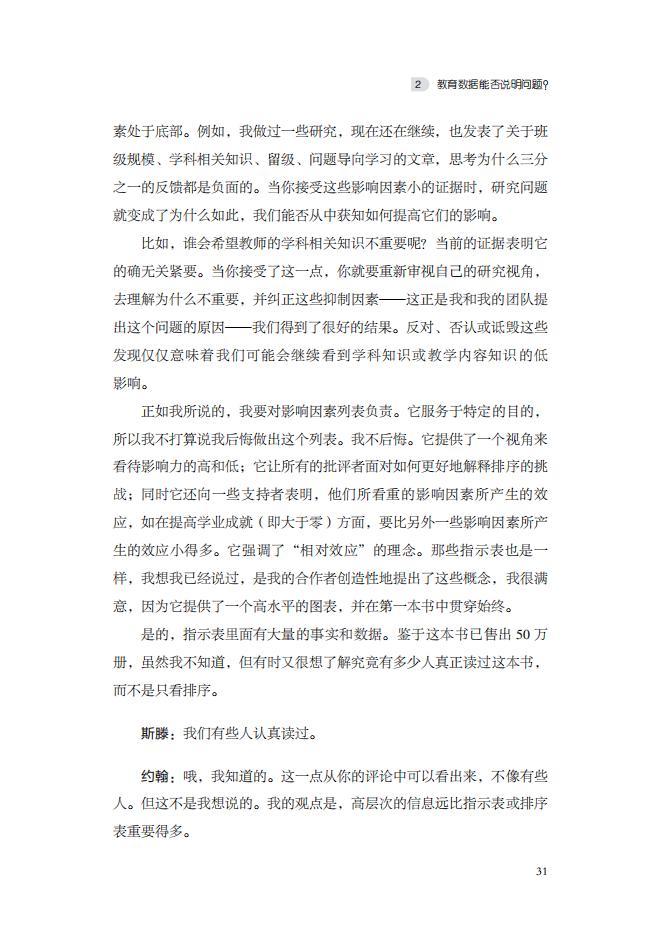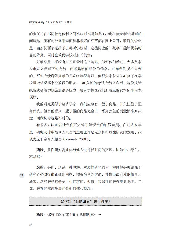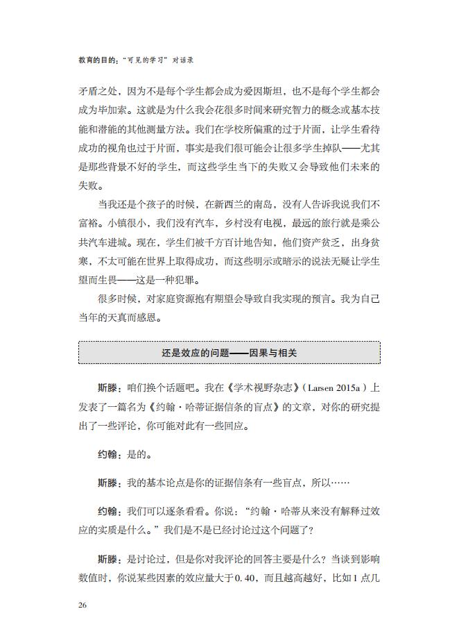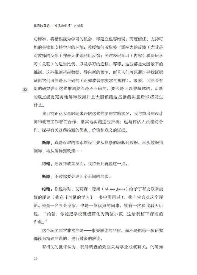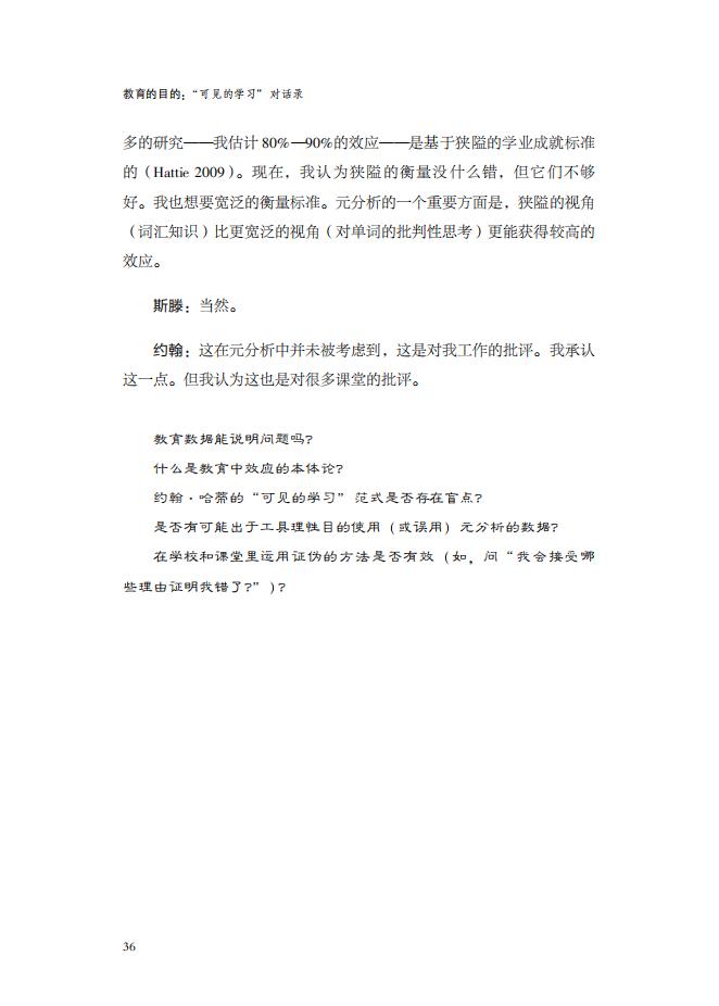 他整理了一些关键的话题:一起来谈谈教育的目的。这远不止是好奇,而是探讨可见的学习的范式和结果之外的回答,其中大部分内容目前都包含在本书中。他写道:;我们可能会互相挑战和挑衅,我们思想的碰撞很可能会促成彼此自我反思的更新、将教育的未知视角公之于众。我们可以讨论教育的目的、人类为什么需要教育、教化的精髓、教育中的自主性、研究与政治的关系、学习的概念、学习的(不)可见性、教育在社会中的作用、教育的未来、网络学习和异化等等。