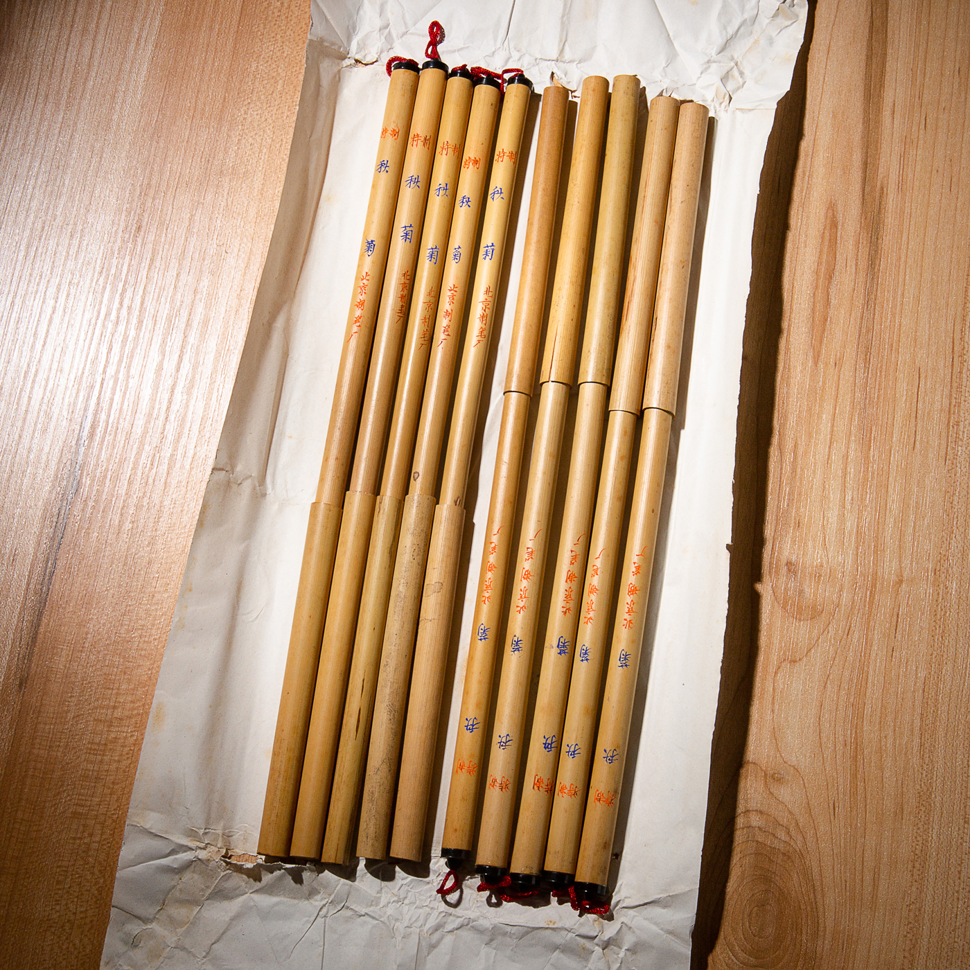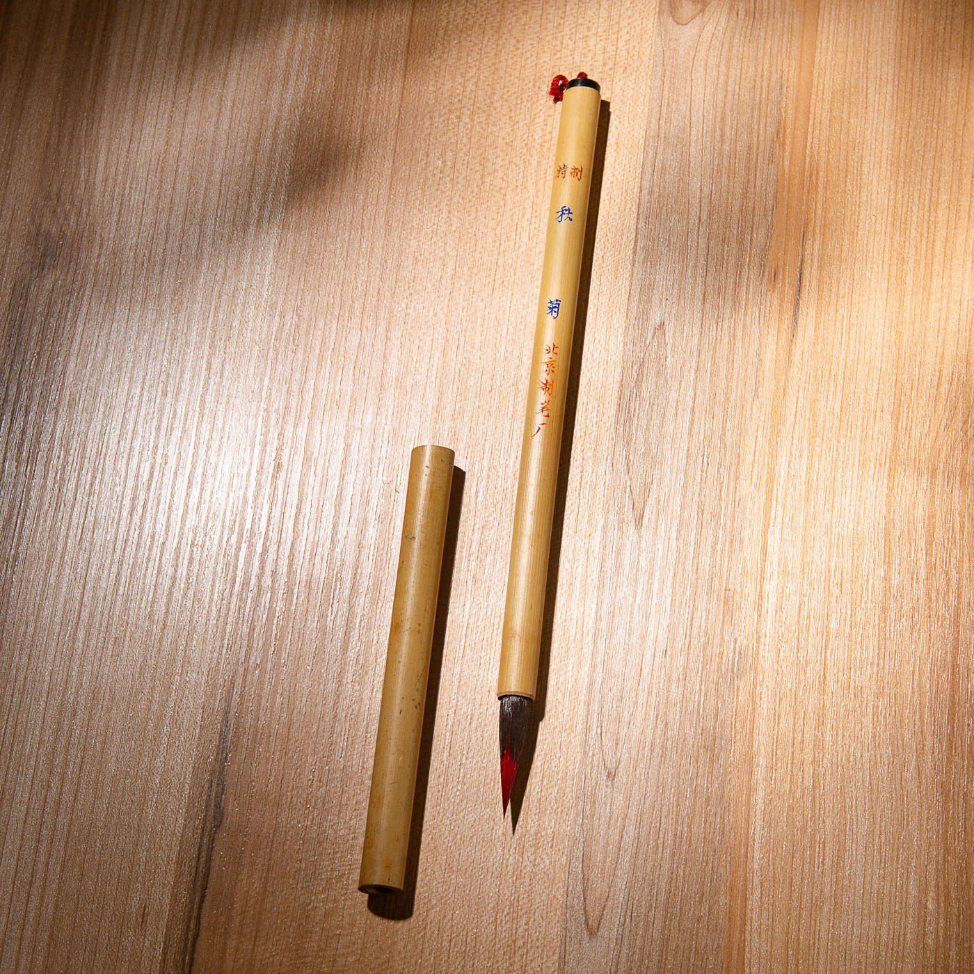 70-80年代北京市制笔厂(李福寿)精制“秋菊”老毛笔。笔锋配料及工艺颇为复杂,笔杆刻字极精美,带有竹制笔帽。此笔出锋犀利,蓄墨量强,书画皆宜。
