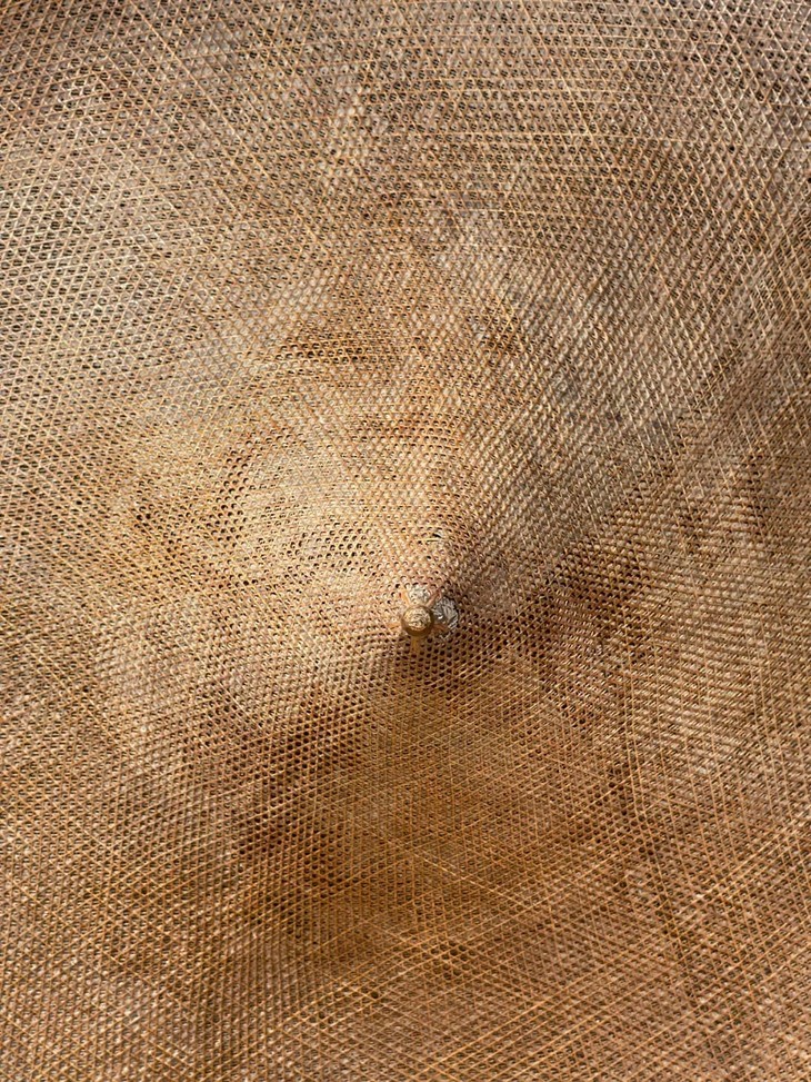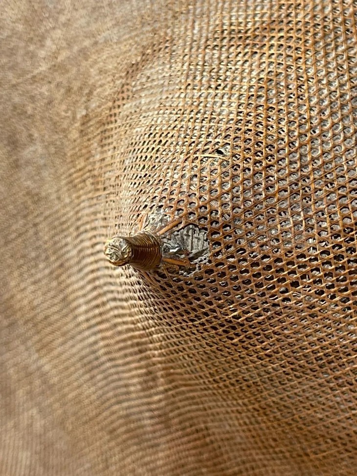 此竹编尖顶宽沿大斗笠如图所示,有除少数竹蓖断裂,以及表面自然磨损痕外,基本保存完好。