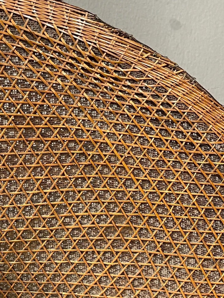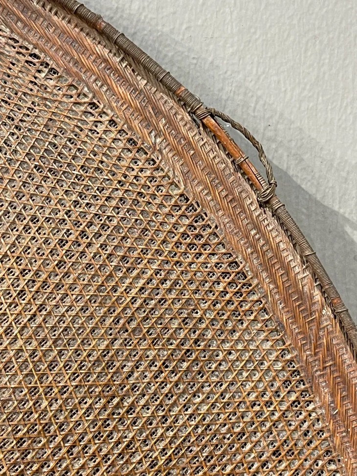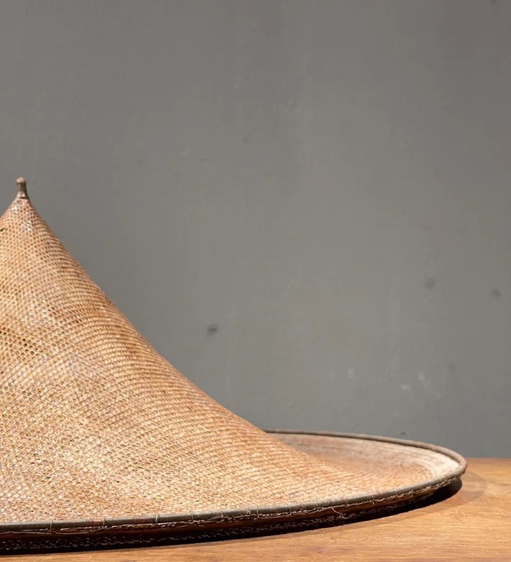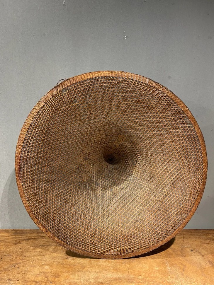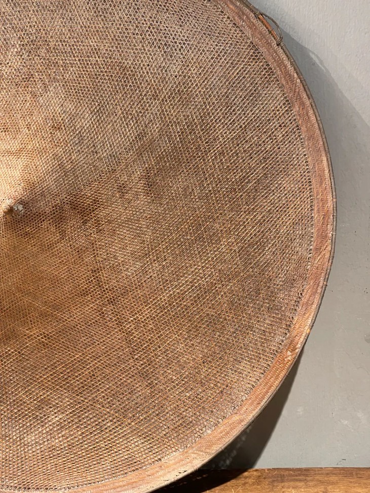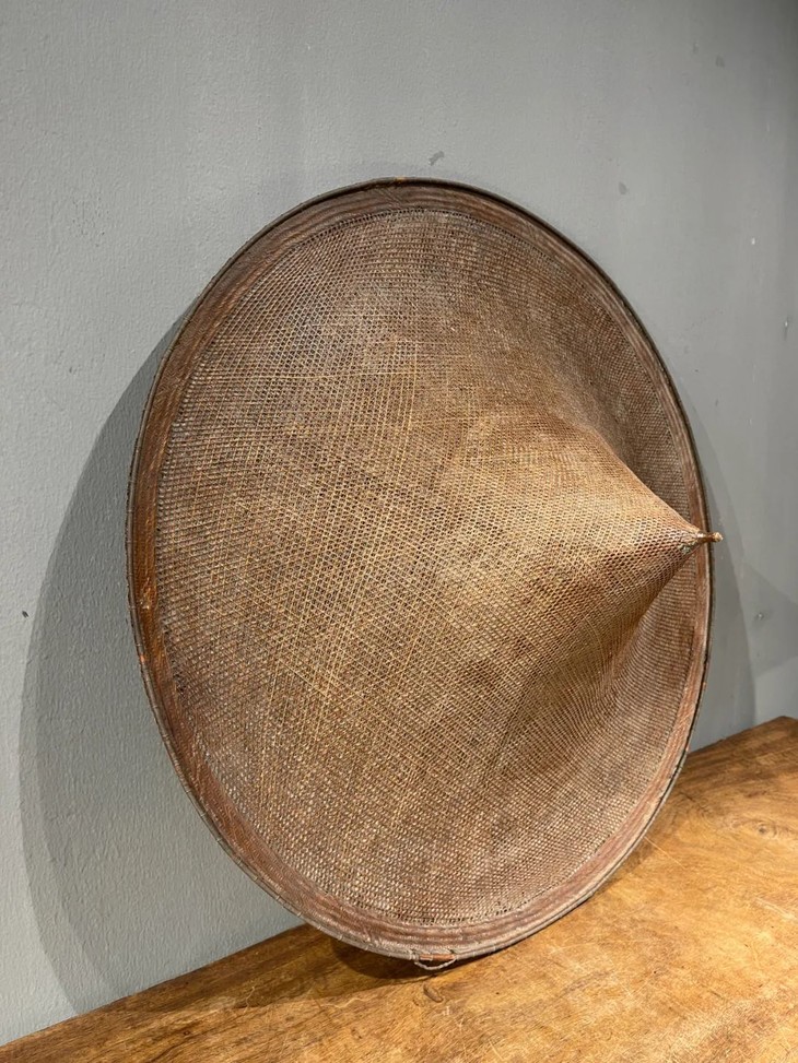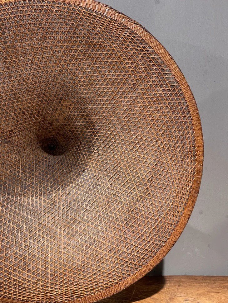 这是一件造型独特典雅,制作出奇精致的云南少数民族竹编尖顶宽沿大斗笠、年代久远斗笠,尺寸大的竹编宽沿斗笠,流线型尖顶往下开展成口沿微翘的圆形尖顶斗笠,整器以细竹条及边沿尖顶铜丝缠绕加固,几何结构双层编织成形,细网夹层以动物胶涂抹防水,设计精巧、风格独特、工艺细腻精緻,造型美观大气,媲美高端当代设计,老竹器逾百年之色泽褐红,包浆皮壳渾厚温润,优雅大方,气质非凡,应该是云南少数民族精心制作的实用或是祭祀用的大斗笠。帽沿编有钩环,可以挂墙上摆设,在当代空间内,因其艺术气质、独特风格与令人赞叹的细节,可以与各种空间搭配,是转转会女主人珍藏多年的精美老旧物。