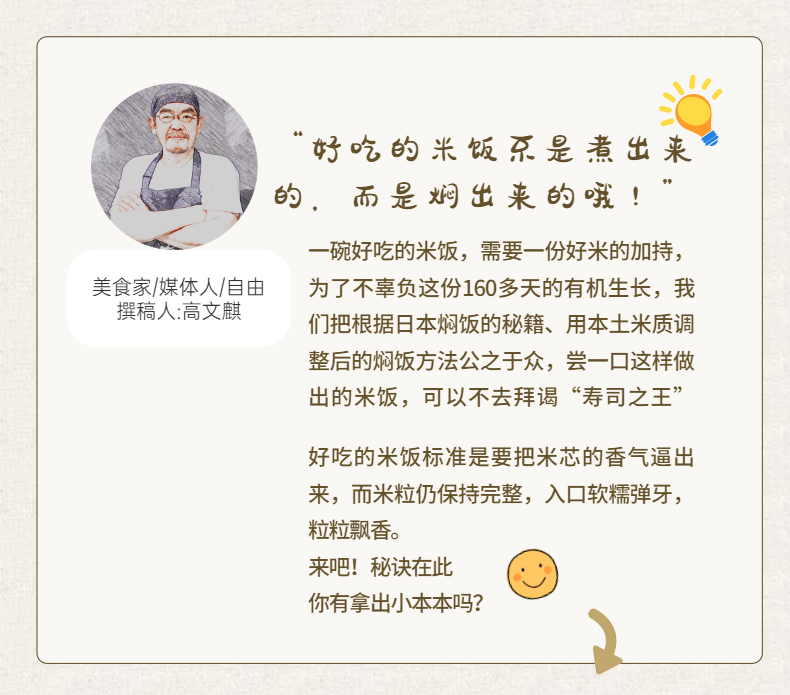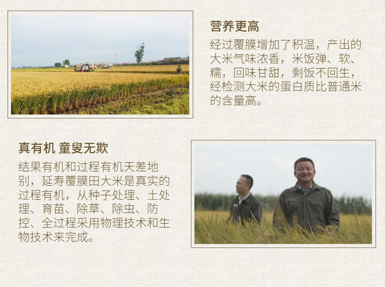 经过150多天生长的延寿覆膜有机大米,其米芯的蛋白质、糖类物质、氨基酸等都高于普通大米,做出来的有机米饭颗颗米粒润泽弹滑,香糯扑鼻。