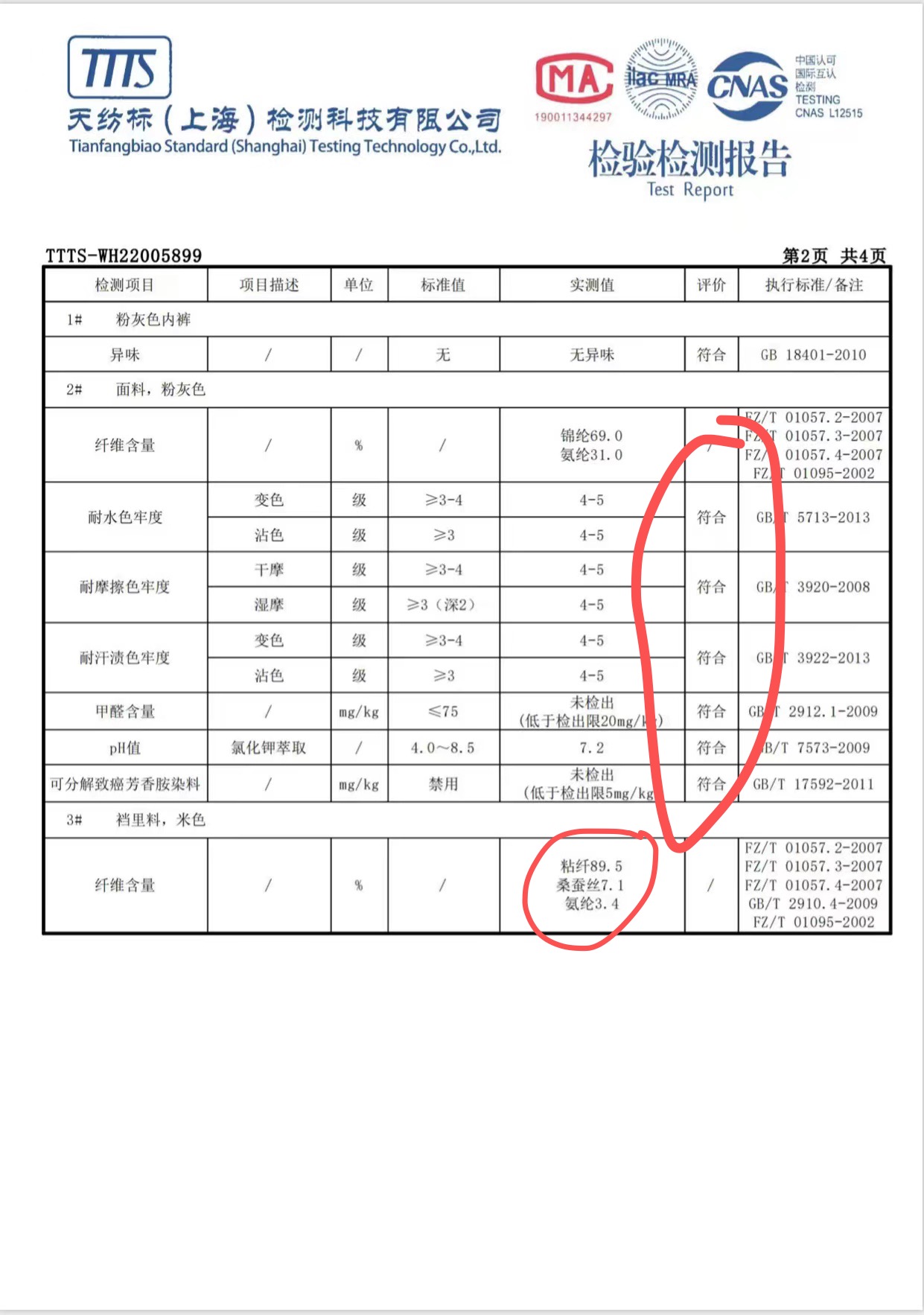 里裆面料:89.5%粘纤 7.1%桑蚕丝 3.4%氨纶