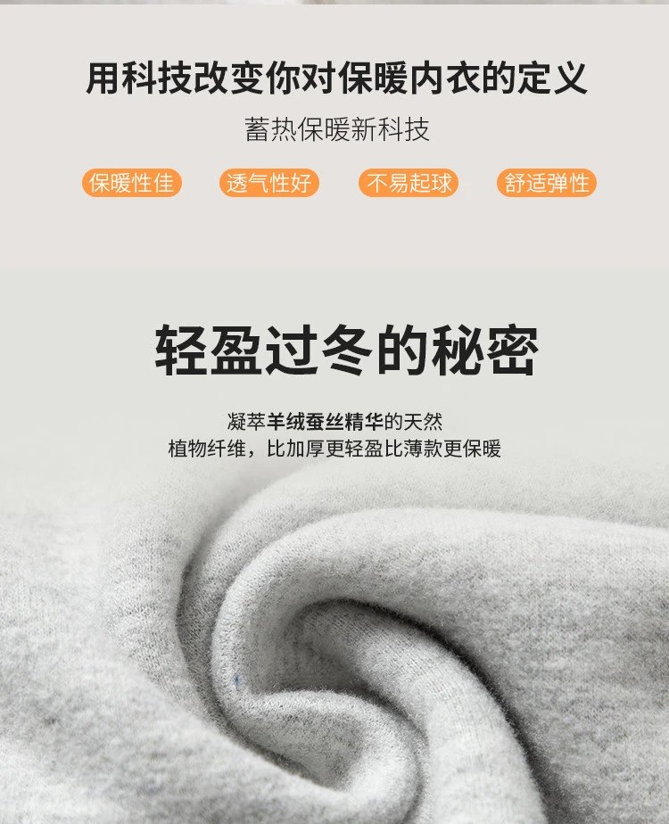 羊毛和蚕丝的加入,温暖加倍,厚度不加,裸感般☁️舒适,手感柔软,双面磨毛蓄热工艺更加保暖,有弹性,透气性强