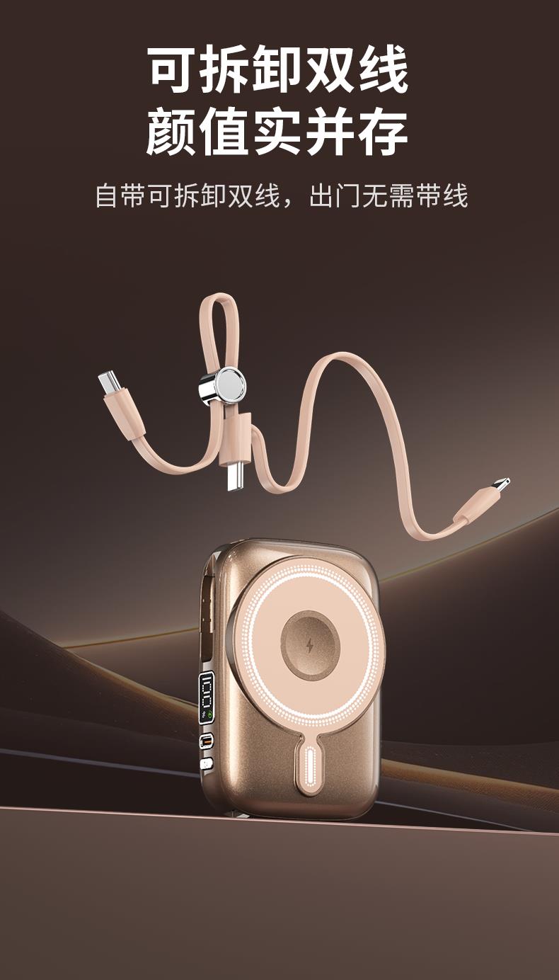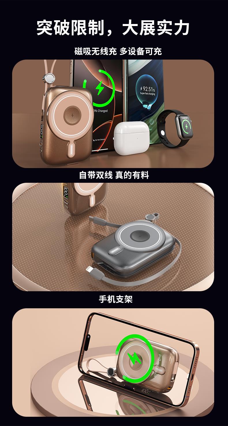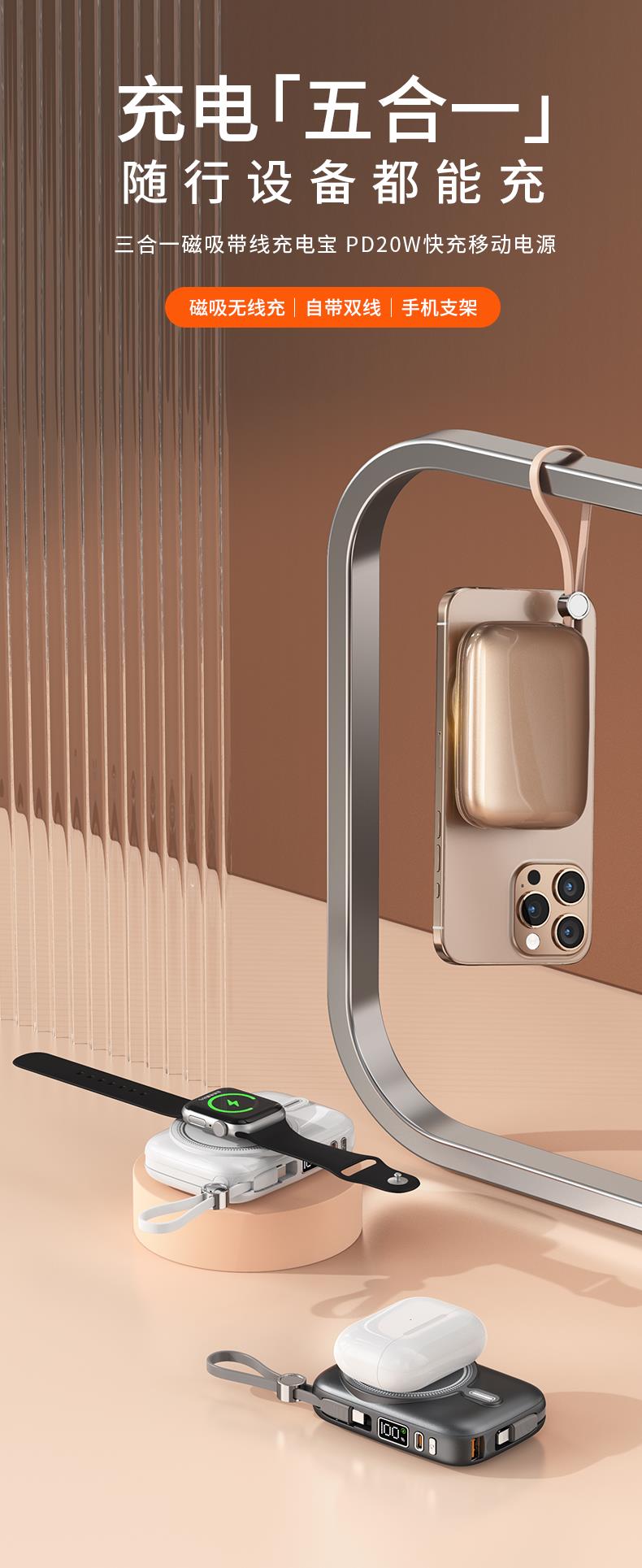 产品名称:三合一磁吸无线充移动电源(自带插拔线)
