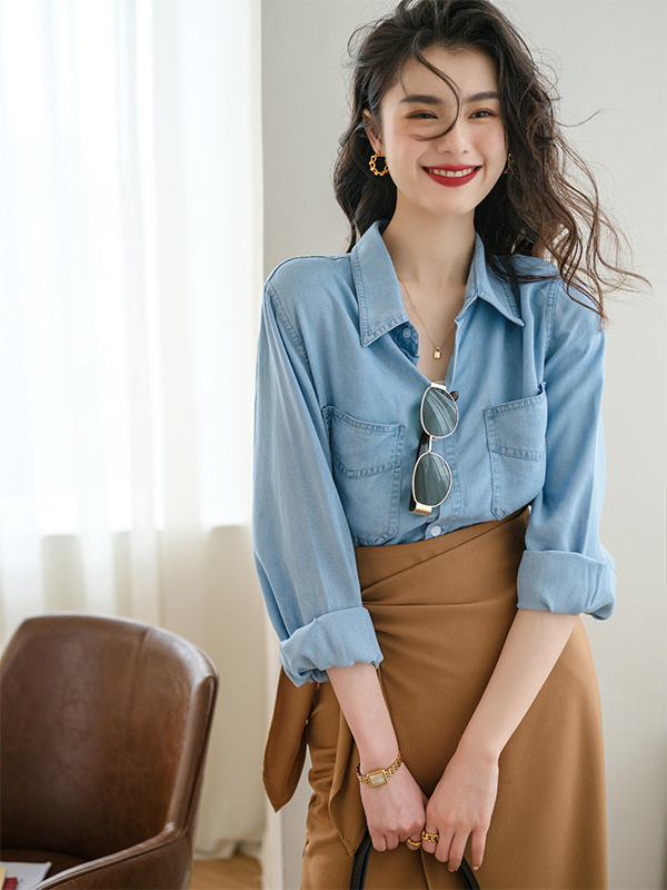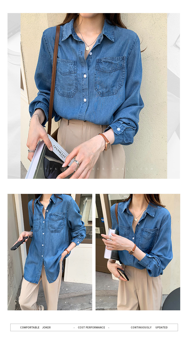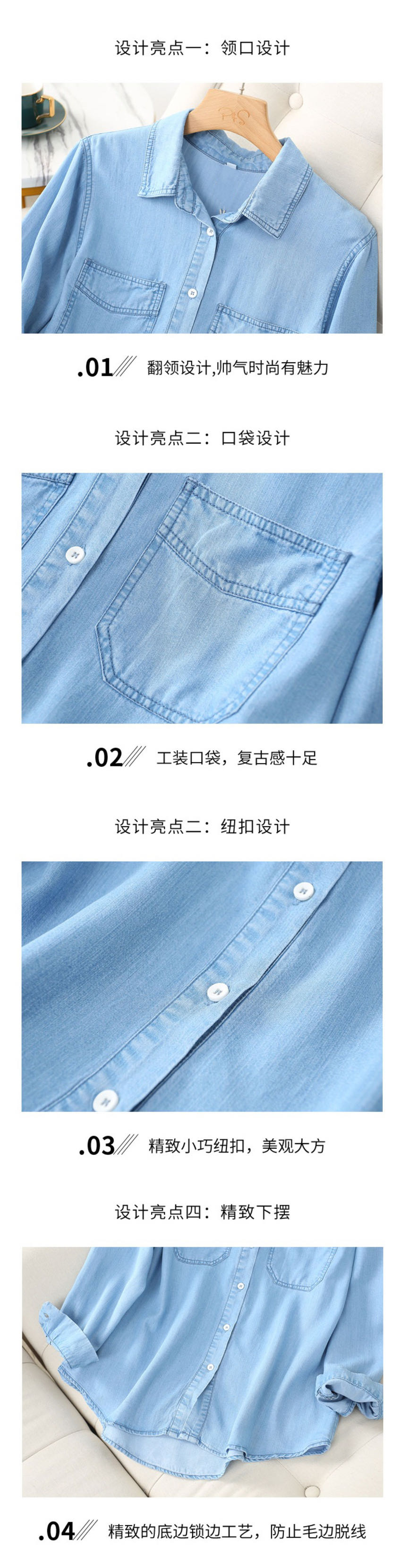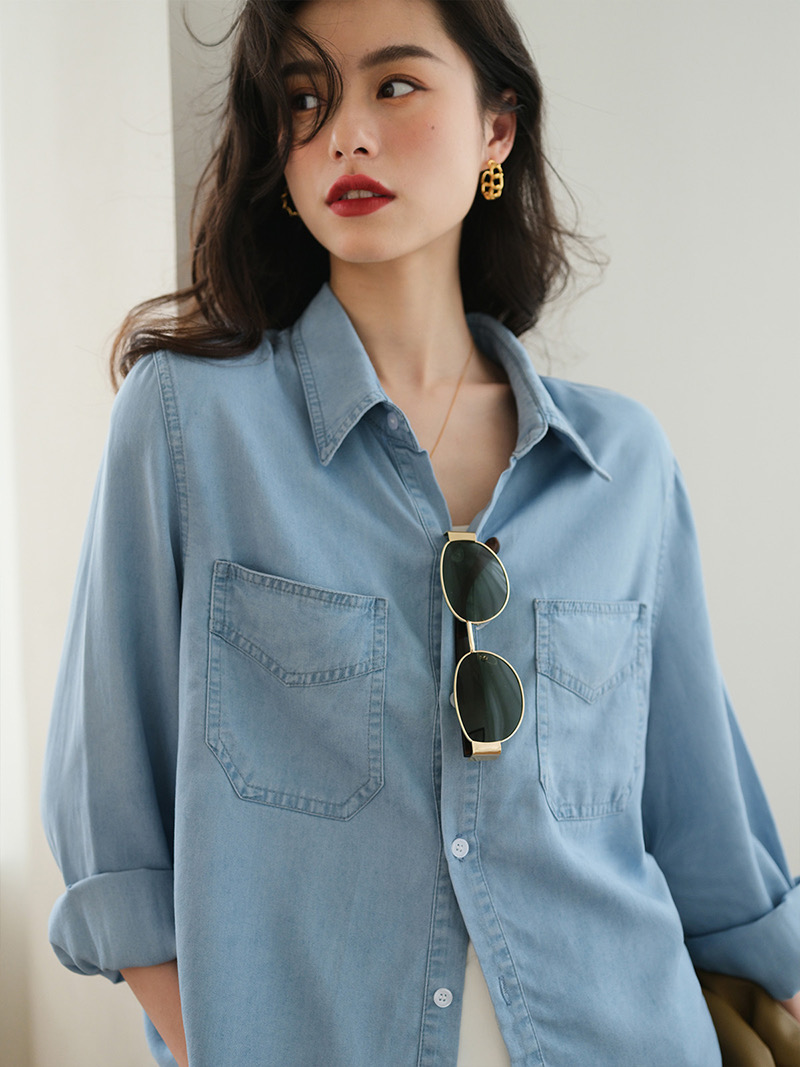 MOMMY KIKO 2024春款天丝莱赛尔蓝色薄款牛仔衬衫复古气质上衣-N2114