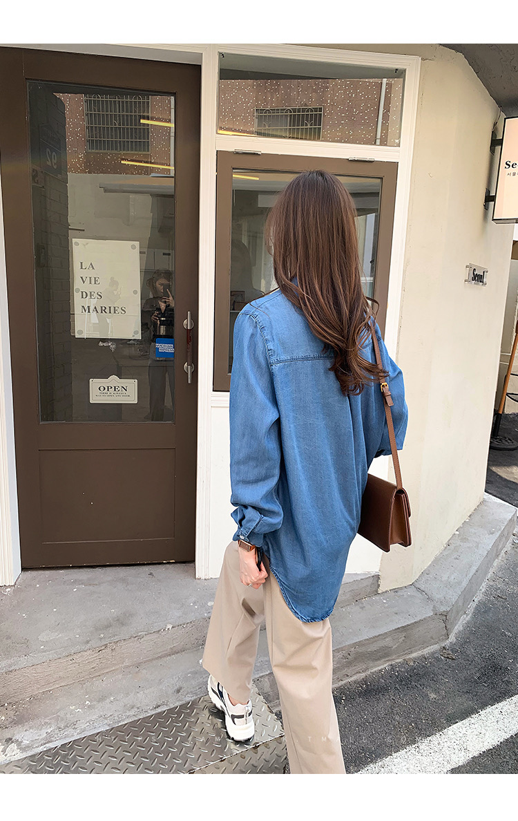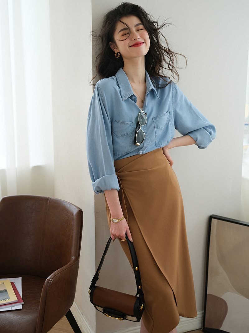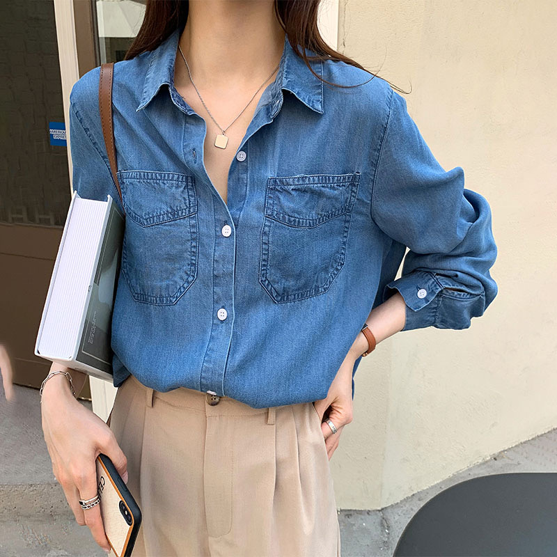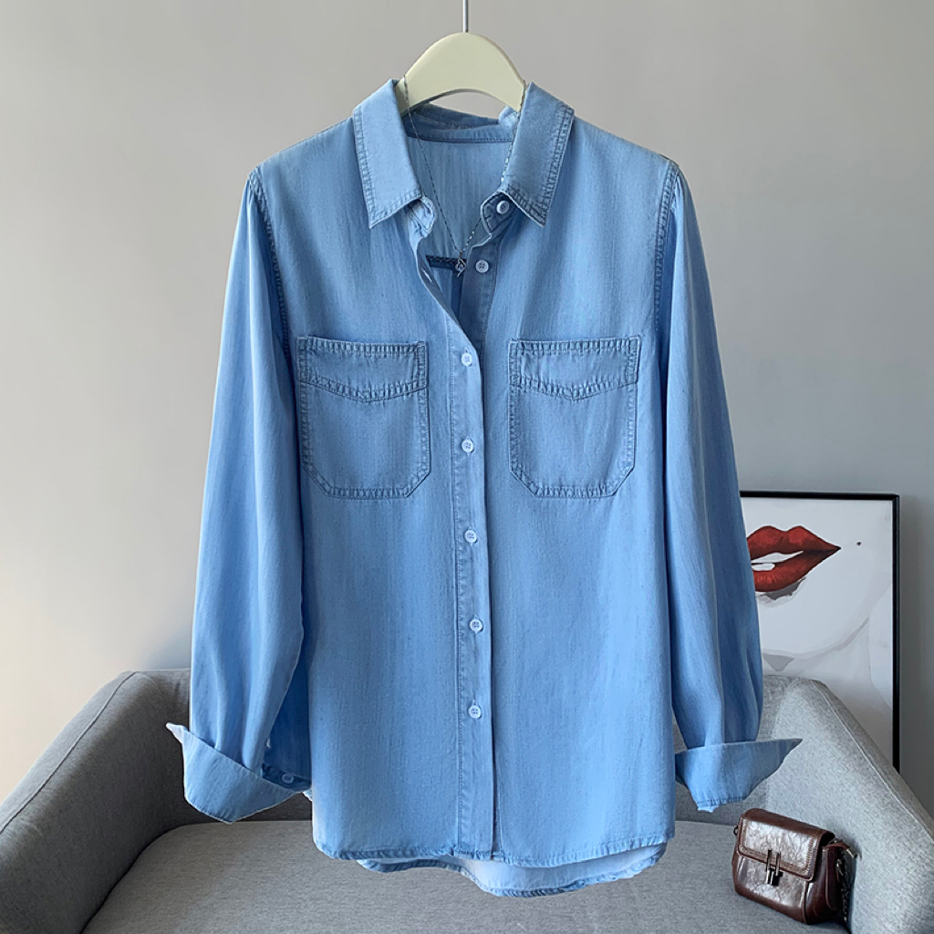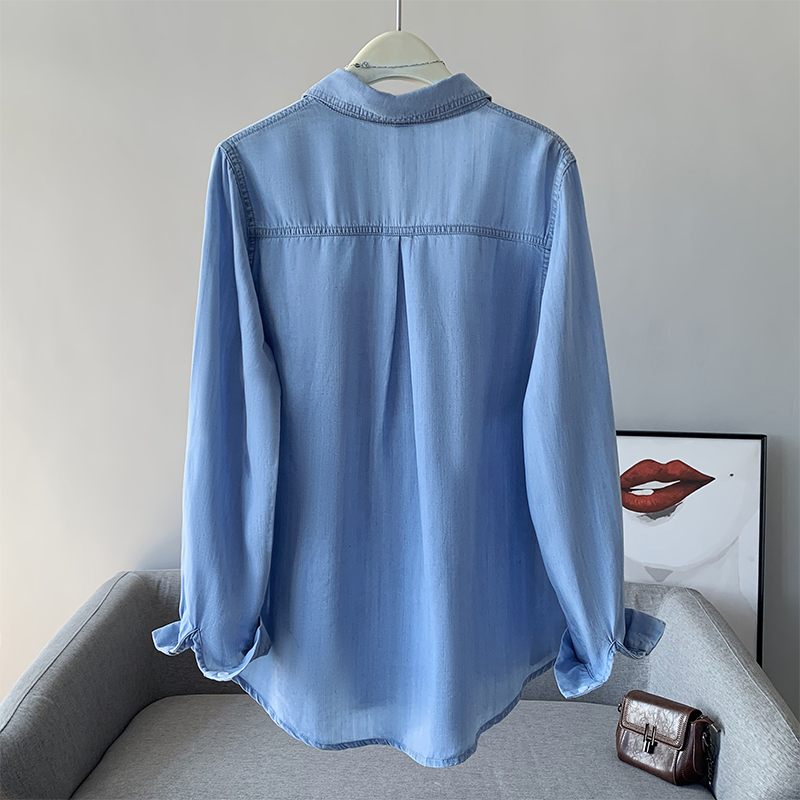 MOMMY KIKO 2024春款天丝莱赛尔蓝色薄款牛仔衬衫复古气质上衣-N2114