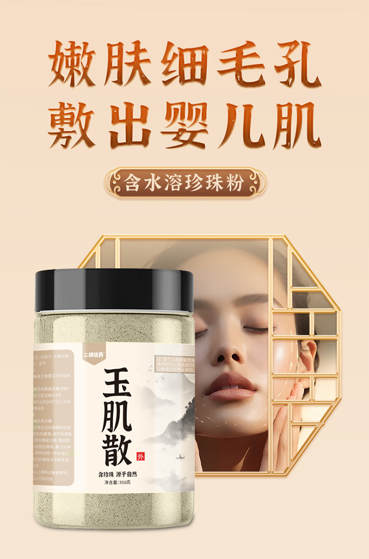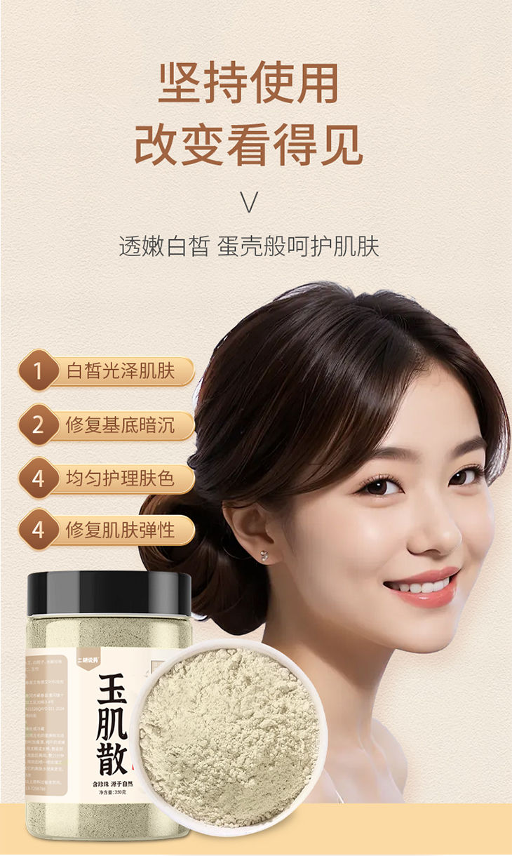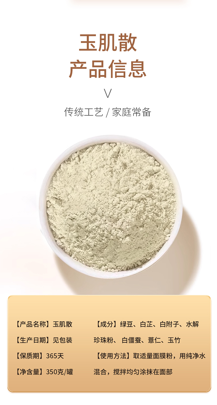 取约20克(也就是4勺)玉肌散,加入温水调和,还可以加入蛋清(紧致提升)、纯牛奶(滋养保湿)或蜂蜜(舒缓保湿),搅拌成糊状,然后用工具涂抹在脸上,眼睛和嘴巴不涂!