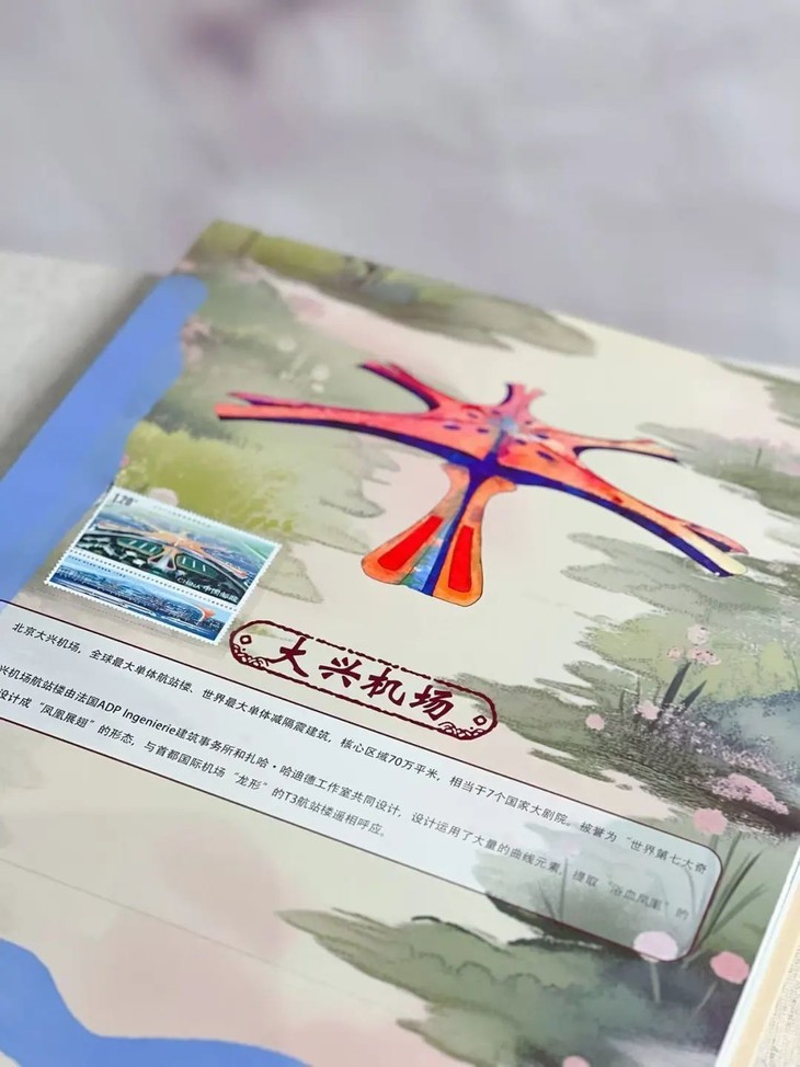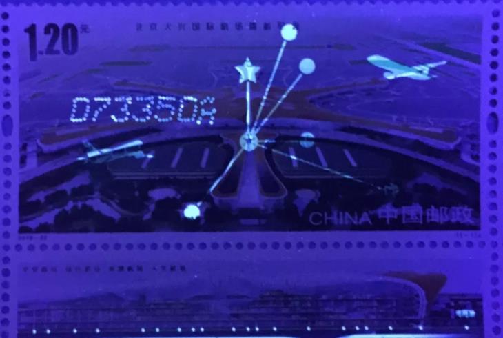 这枚邮票的特殊点在于,在紫光灯下,能看到飞机和北京大兴国际机场与天安门、首都机场、通州机场、天津滨海机场及廊坊市、雄安新区的示意图,非常精美!