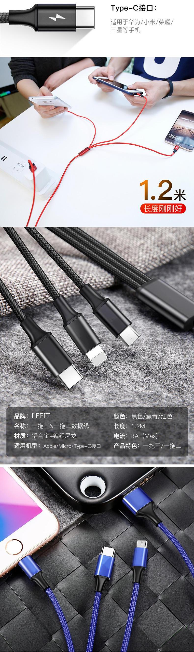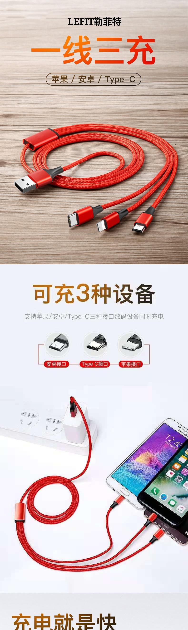 【自营】LEFIT勒菲特 L10 一拖三快充手机数据线三合一适用苹果安卓TYPE-C三头充电线