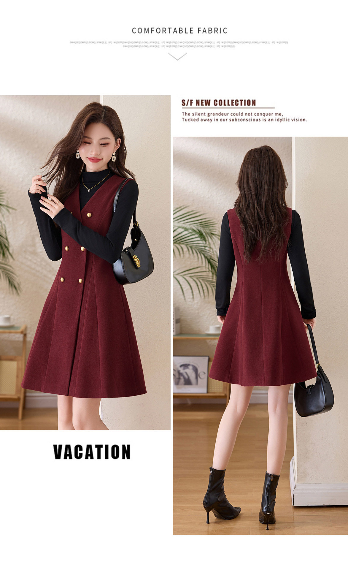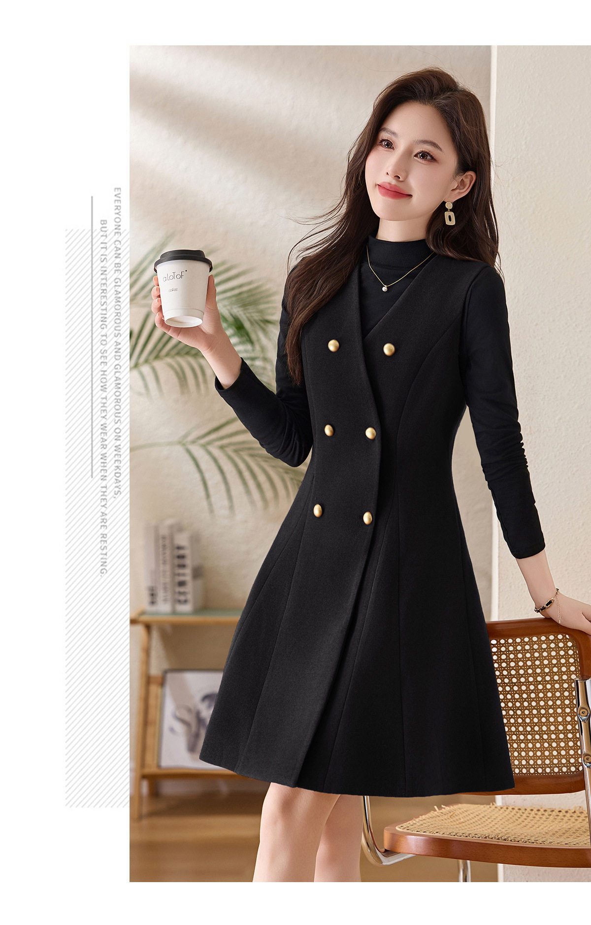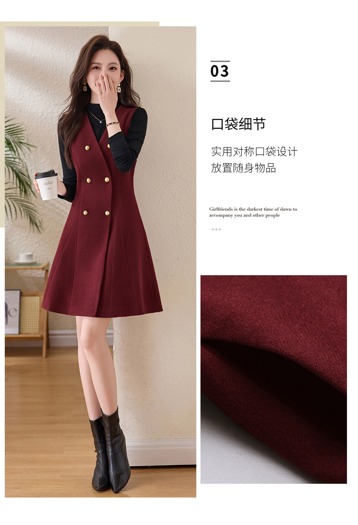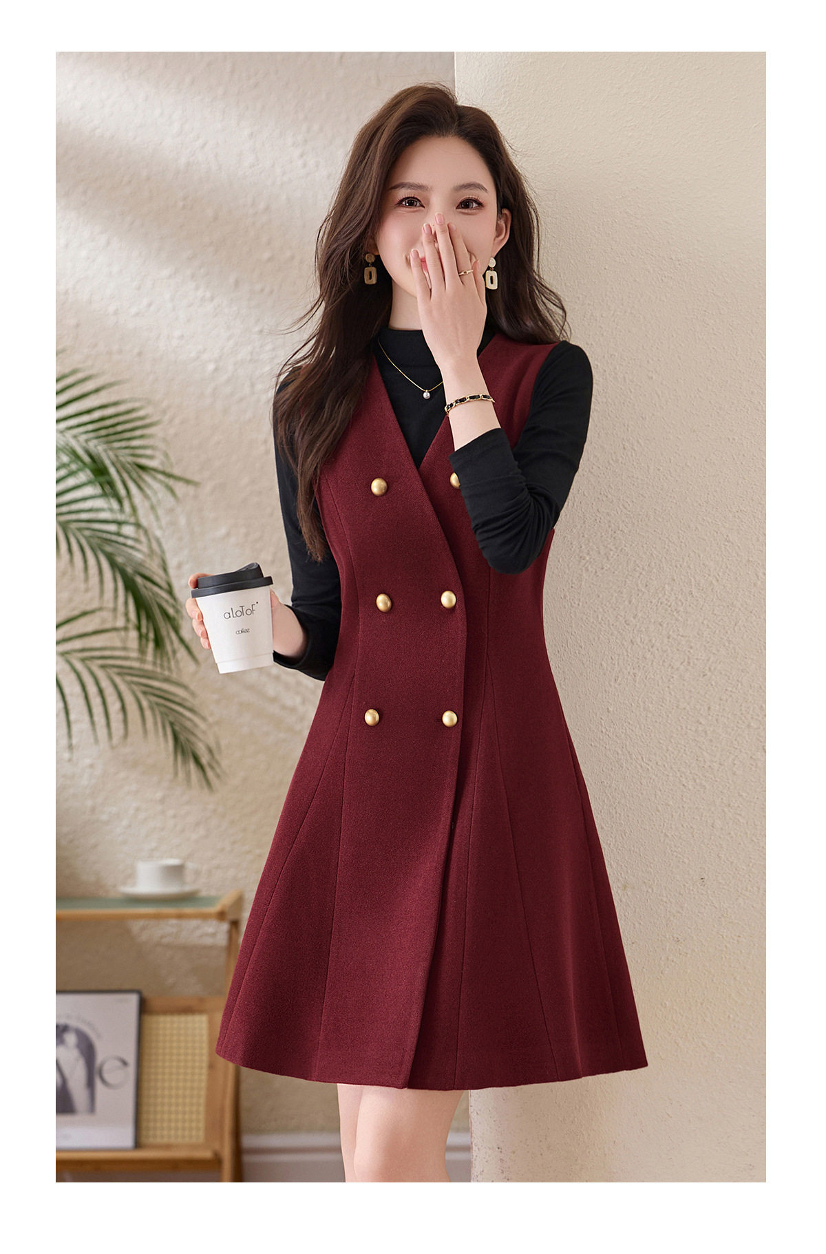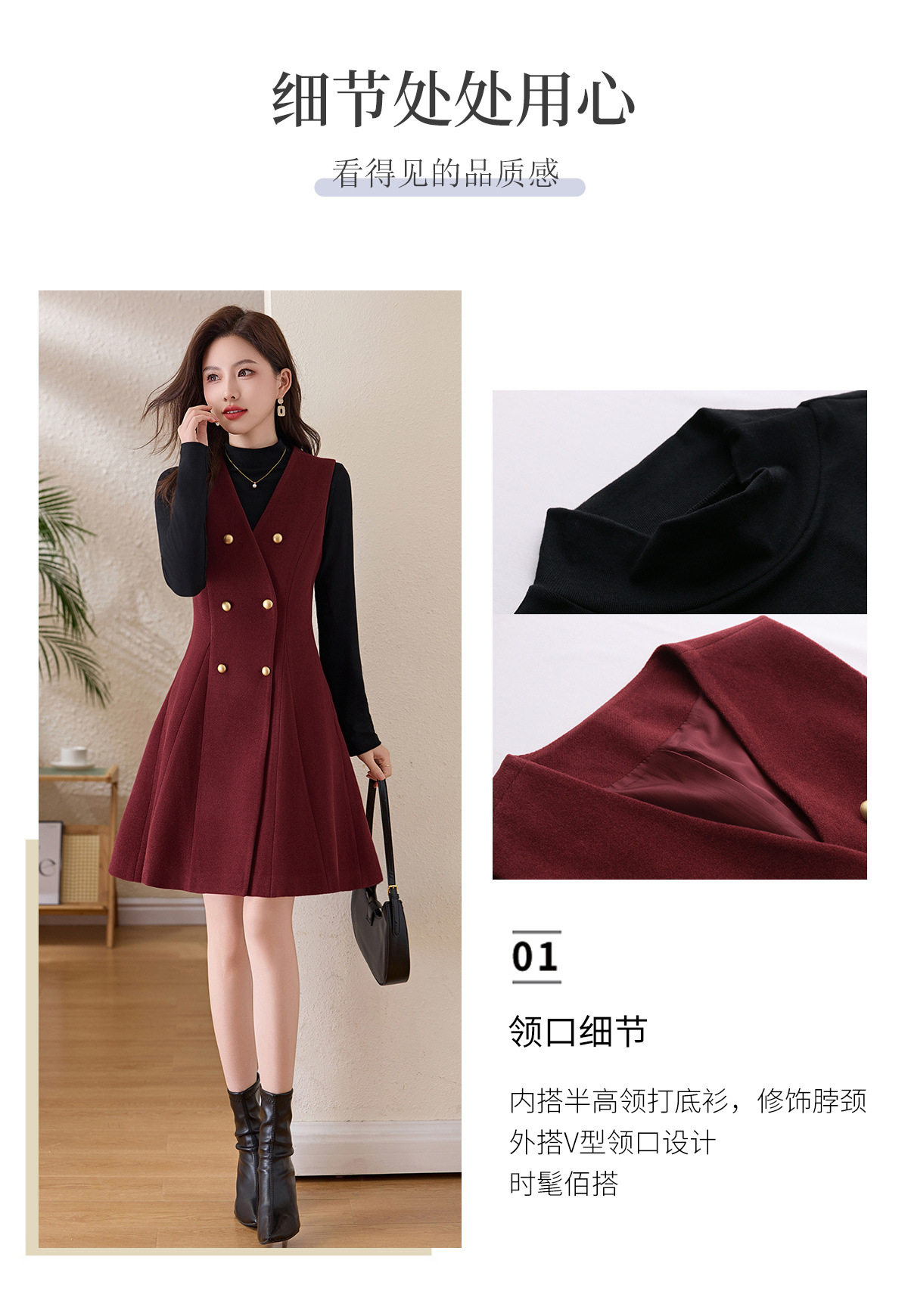「自」全新升级【铂金会员293/天猫389/差价96】(99112)洛诗琳气质双排扣无袖背心裙+半高领打底上衣两件套