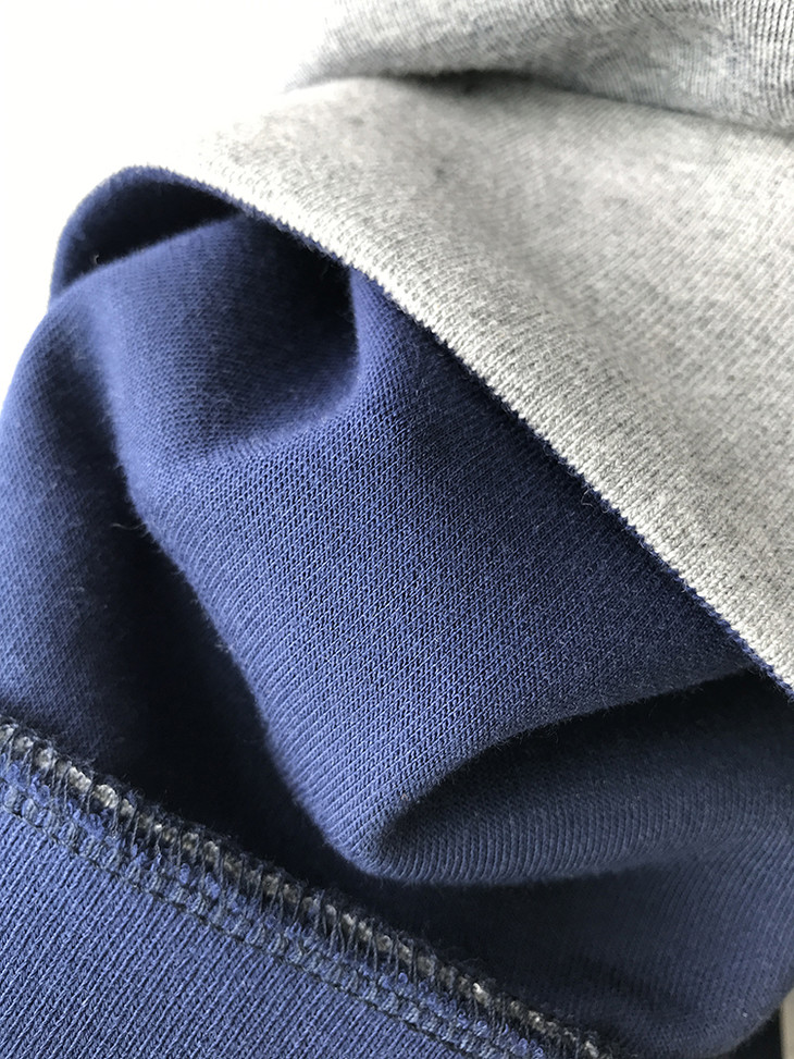 反面的宝蓝色,在织造时候的复合工艺,会让正面的灰