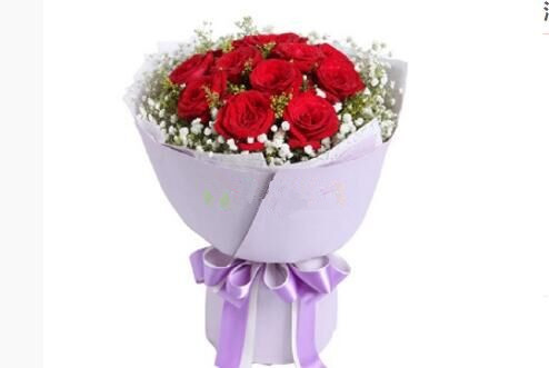 浪漫花开---11朵红色玫瑰,黄莺间插,满天星外围。8寸水果蛋糕 内衬白色网格雾面纸,外用紫色牛皮纸圆形包装,系紫色丝带(1330)