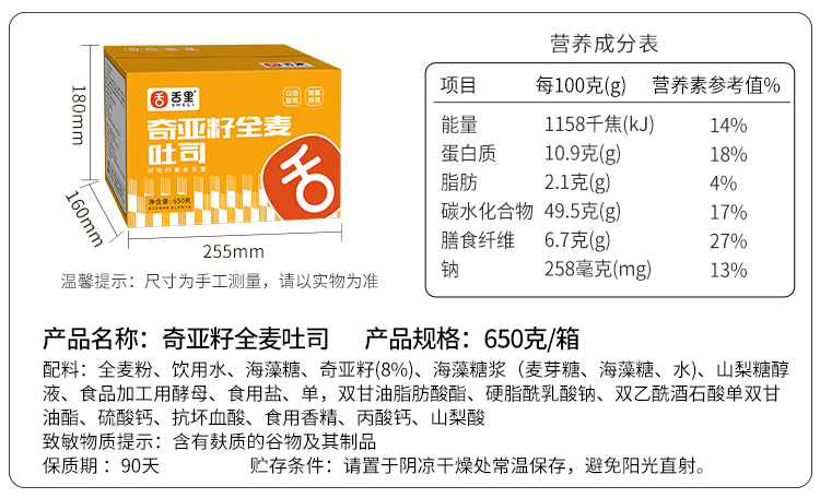 【限时秒杀】全麦奇亚籽吐司650g*箱 约13袋 代餐饱腹 开袋即食