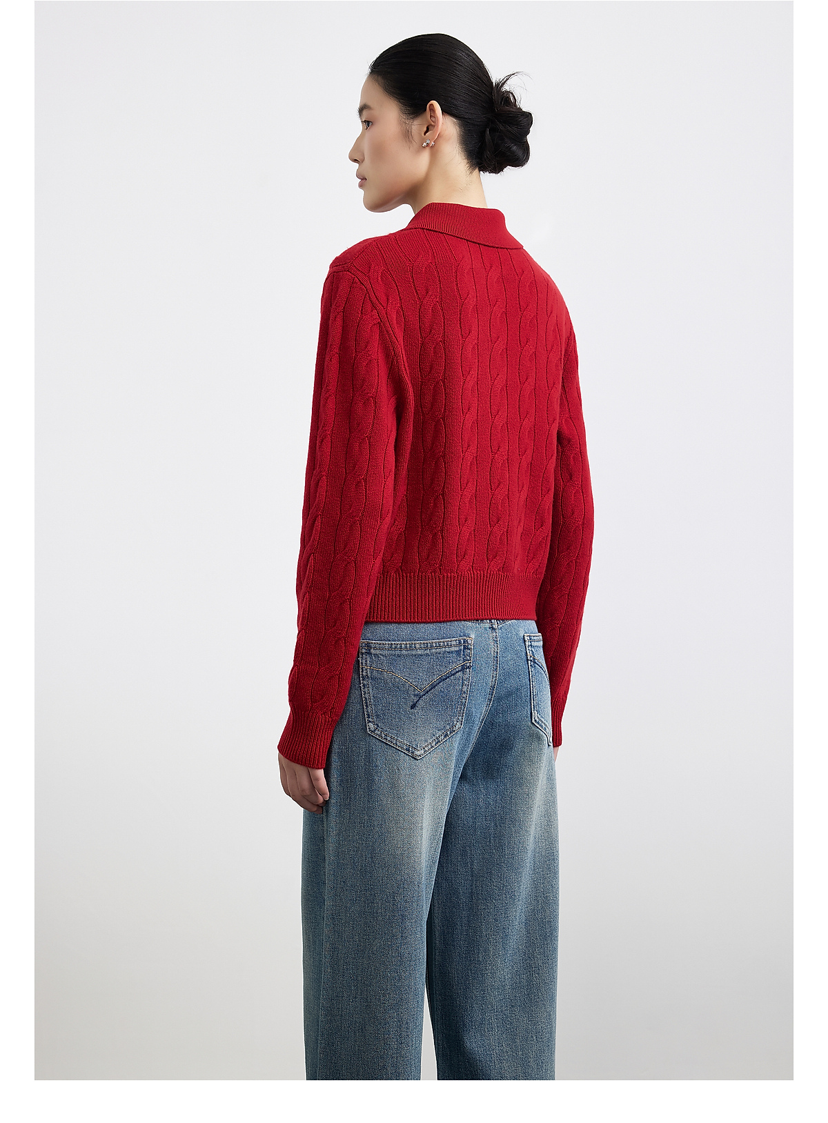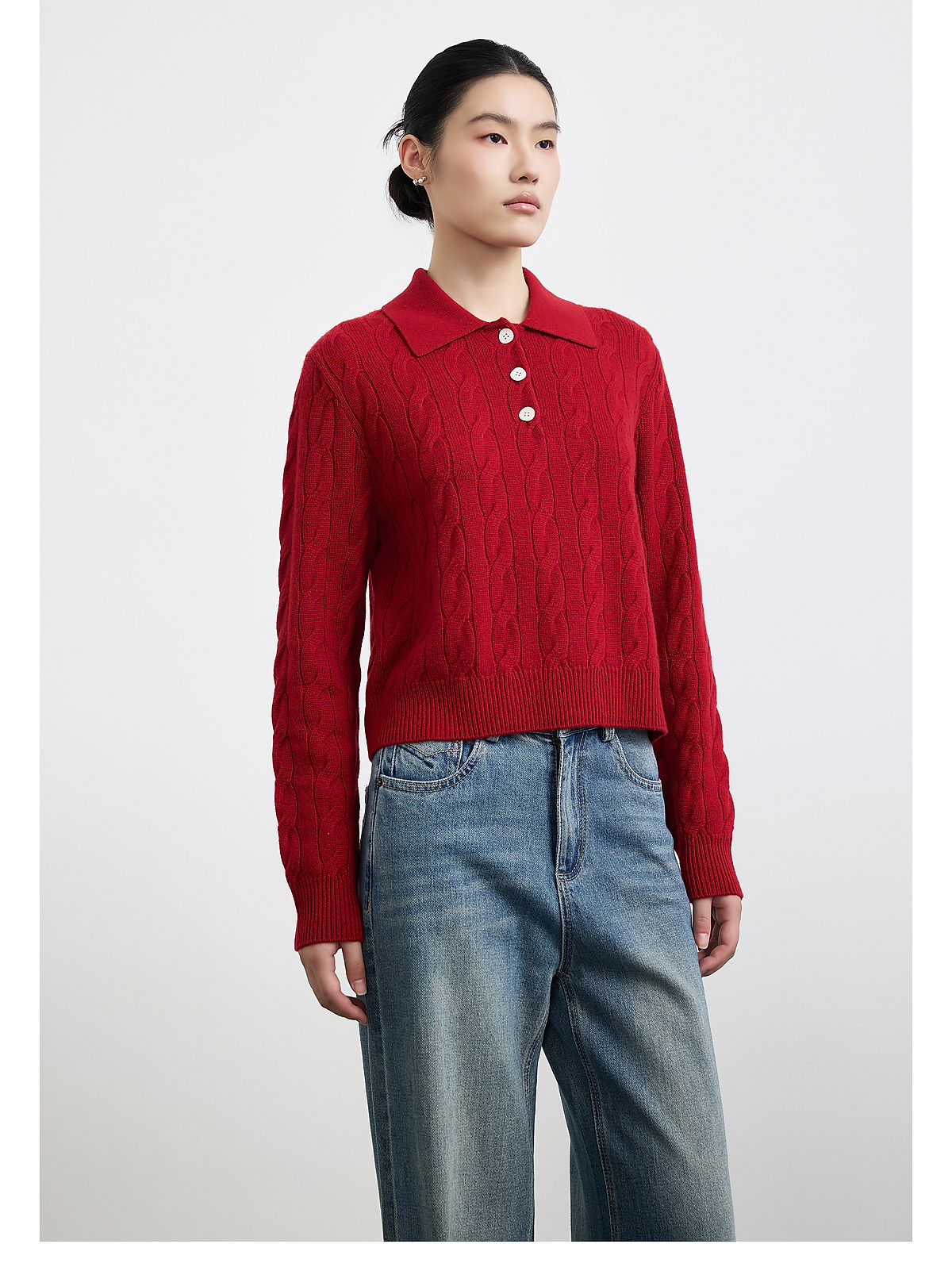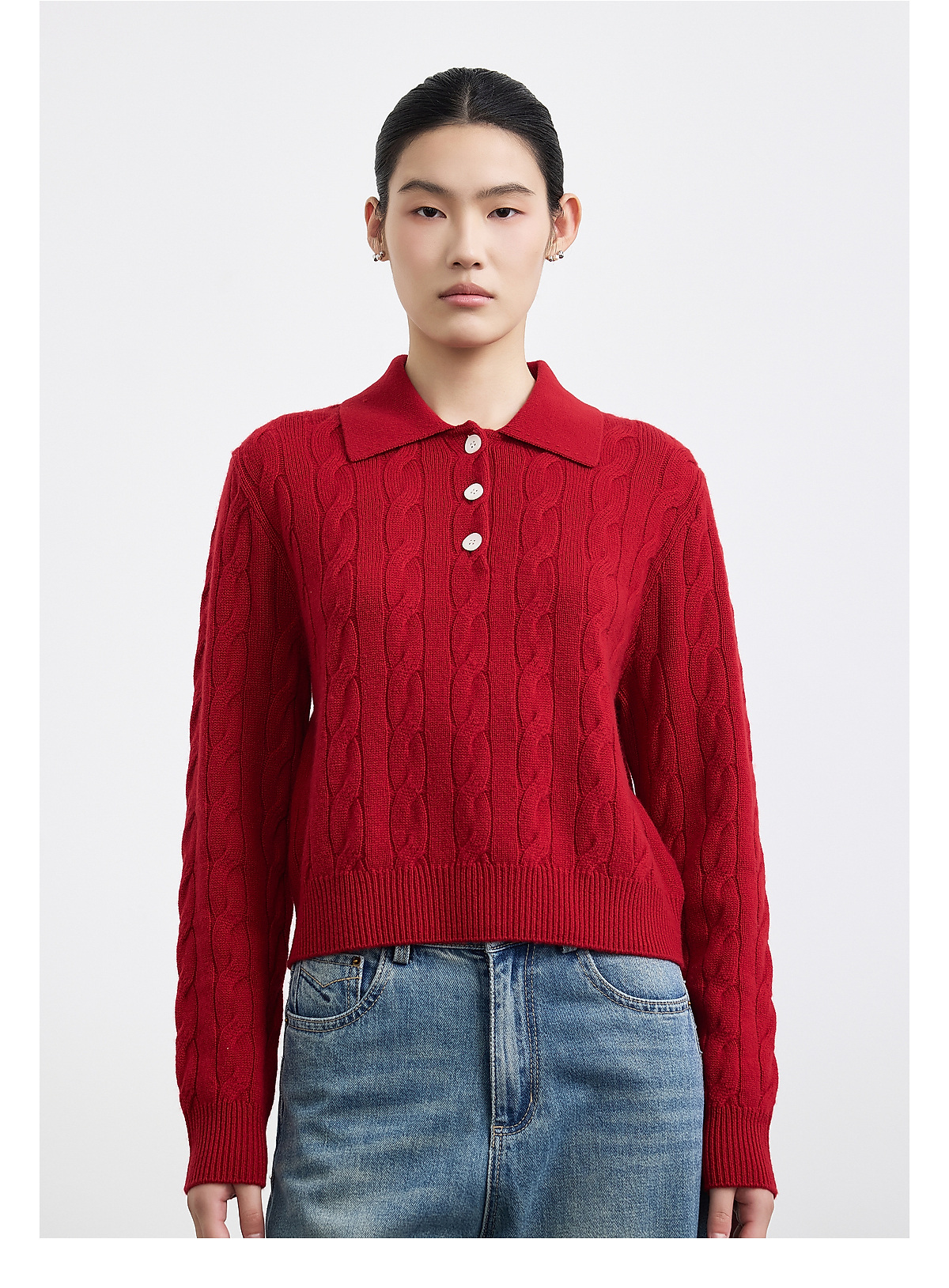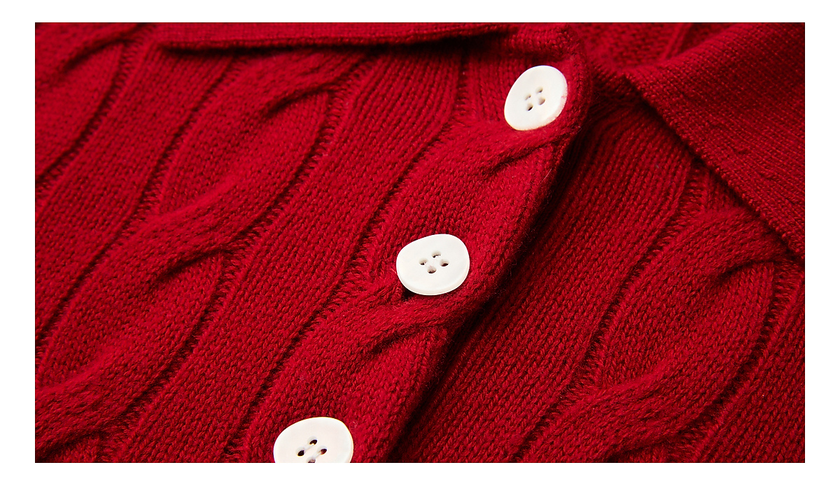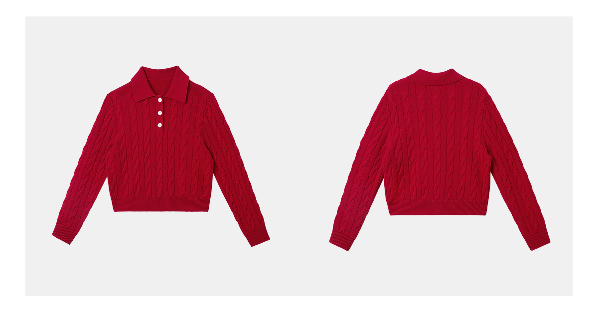 PURE TOUCH女装25秋冬新款Polo翻领羊毛针织衫新年红绞花宽松毛衣