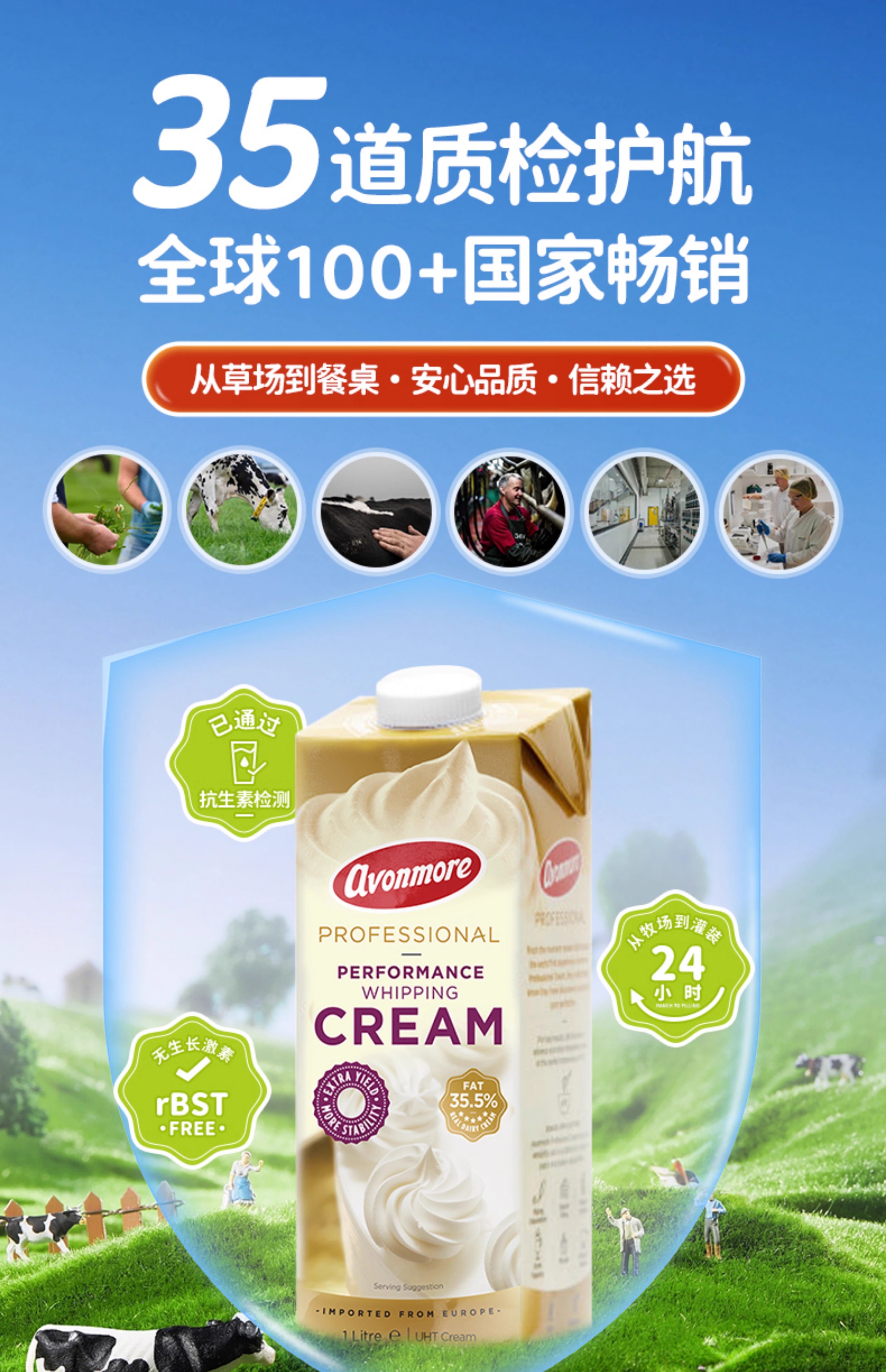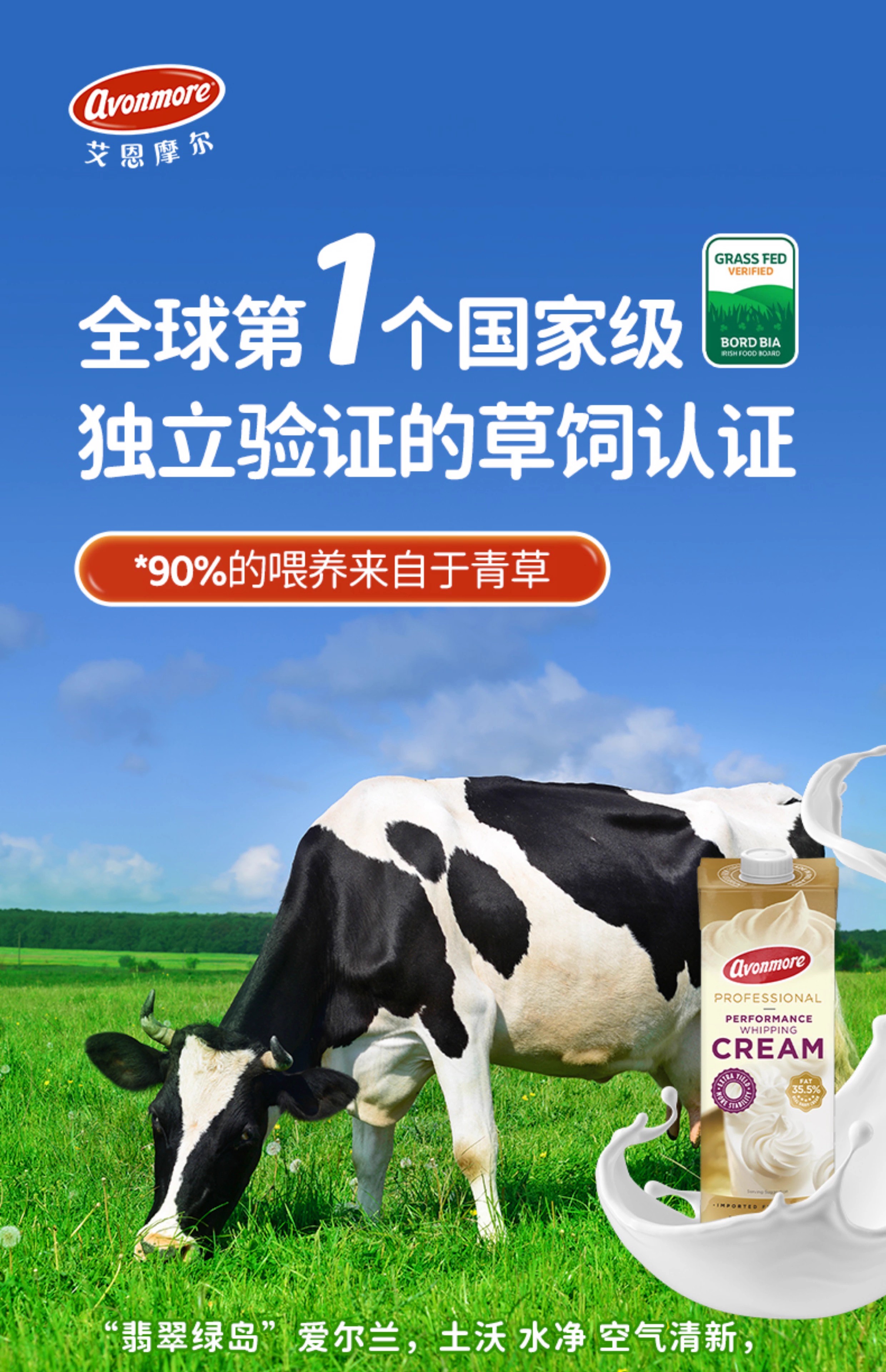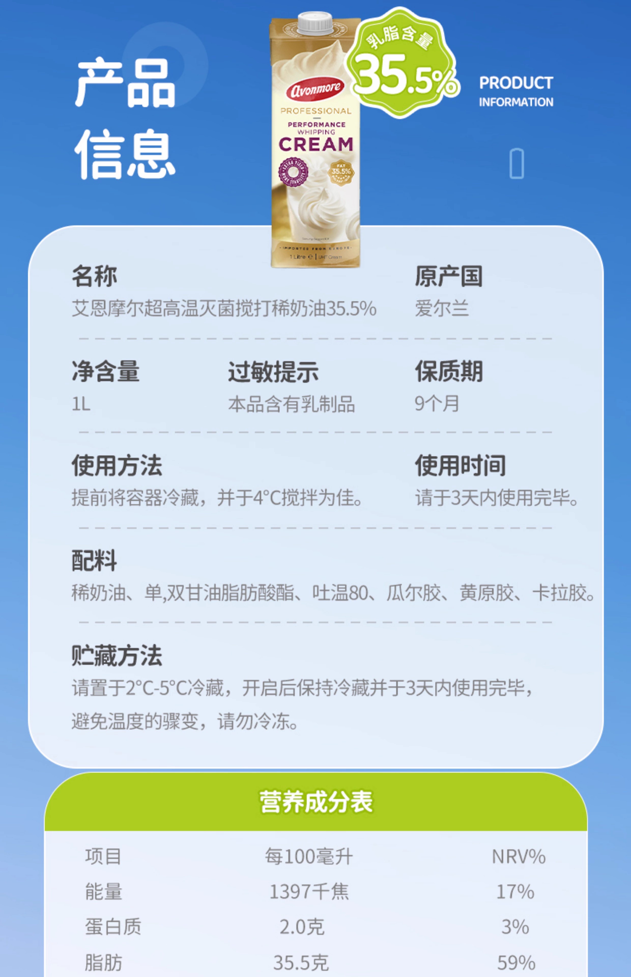 (乳脂含量35.5%)1L 艾恩摩尔稀奶油 动物性淡奶油 爱尔兰进口稀奶油