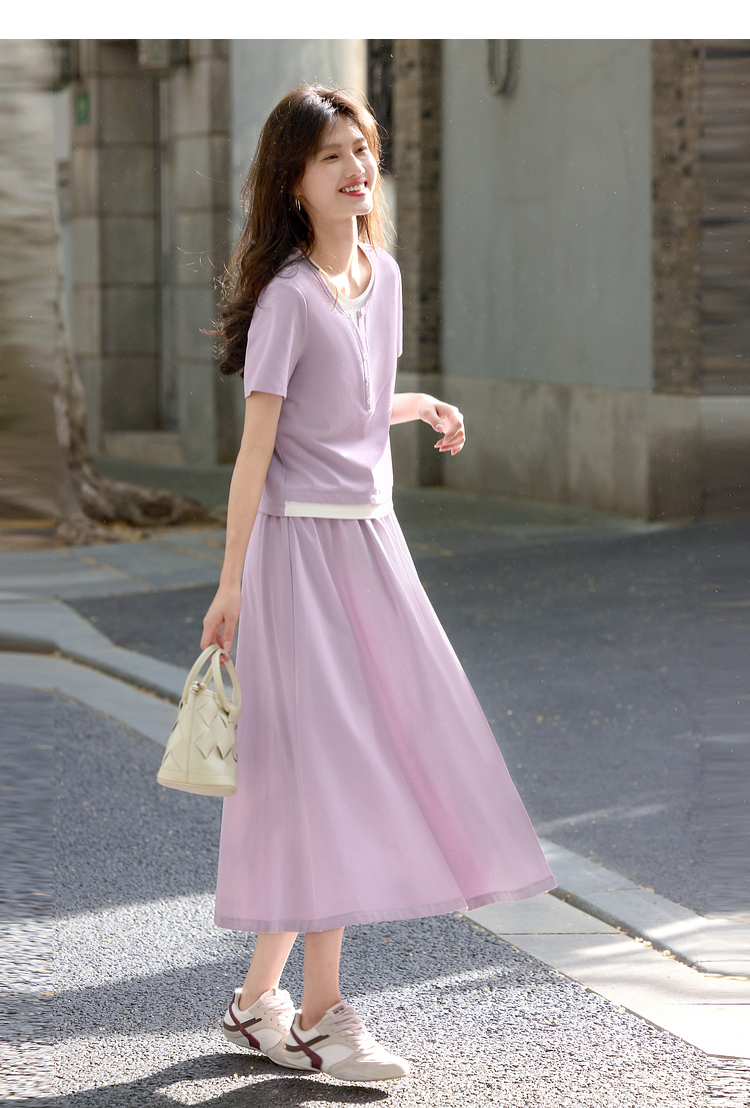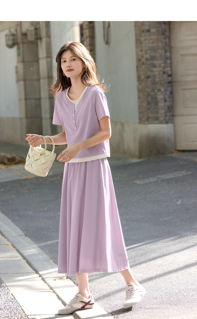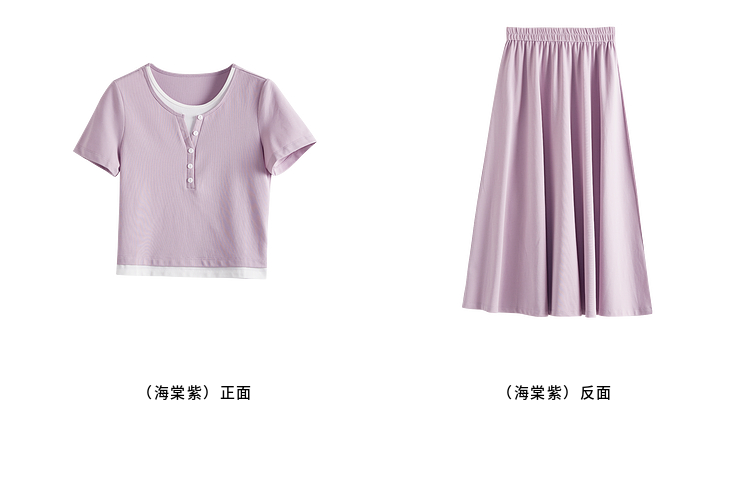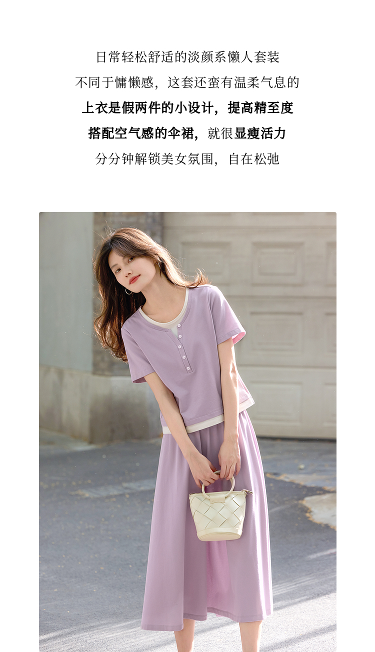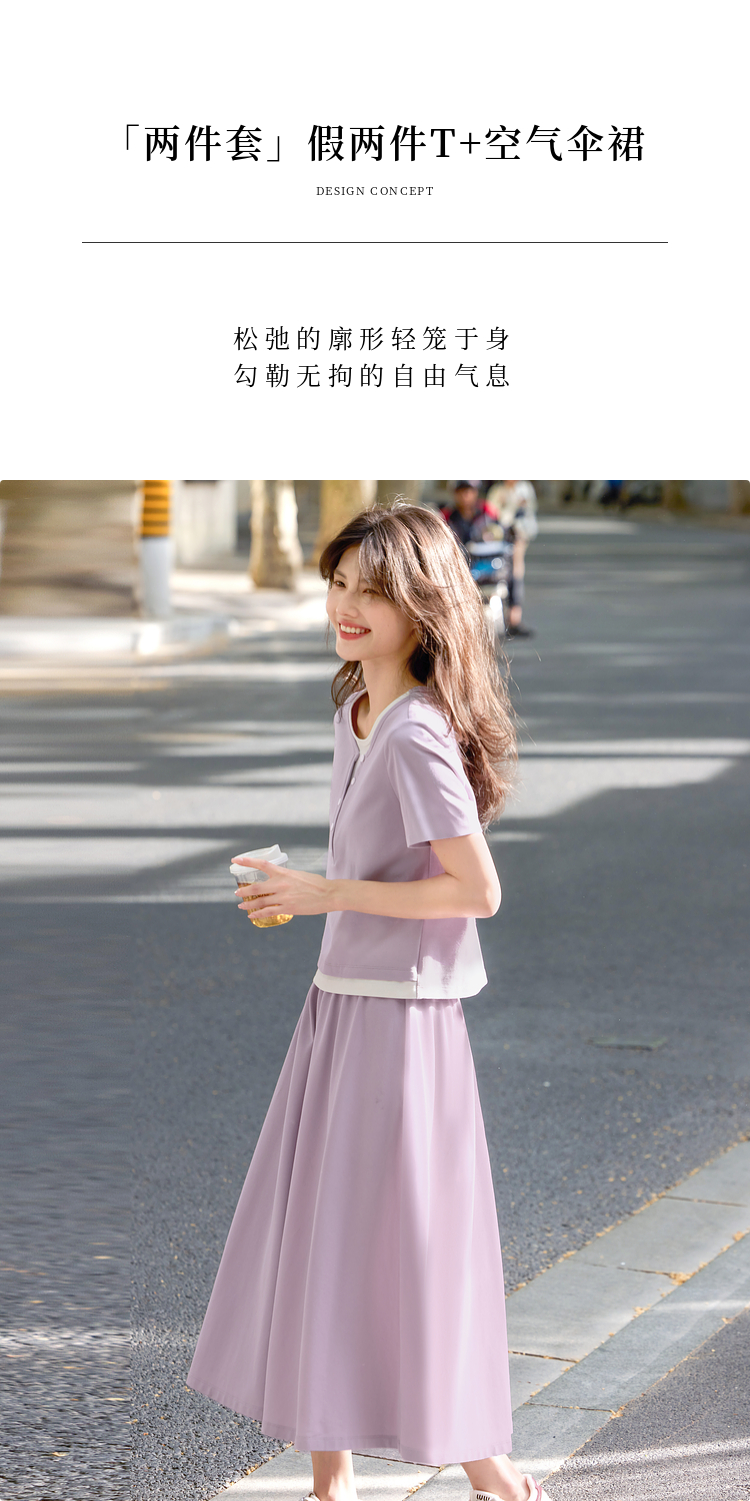 【周末秒杀】熙世界夏日休闲套装2025新款女装气质紫色假两件T恤半身裙两件套
