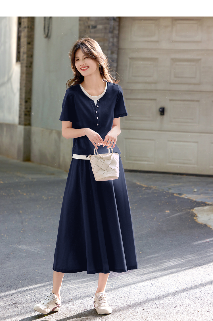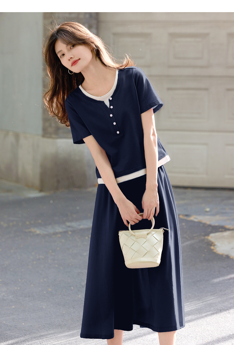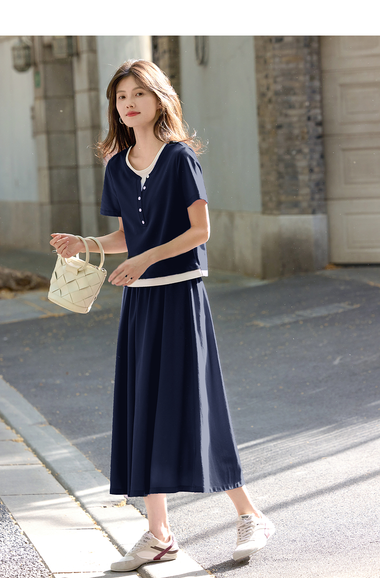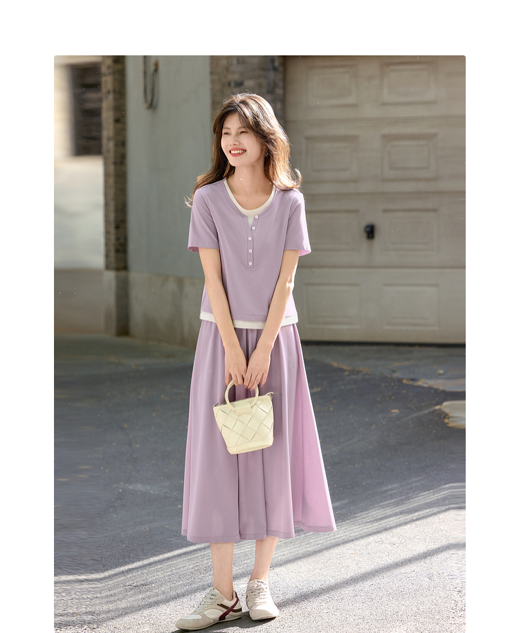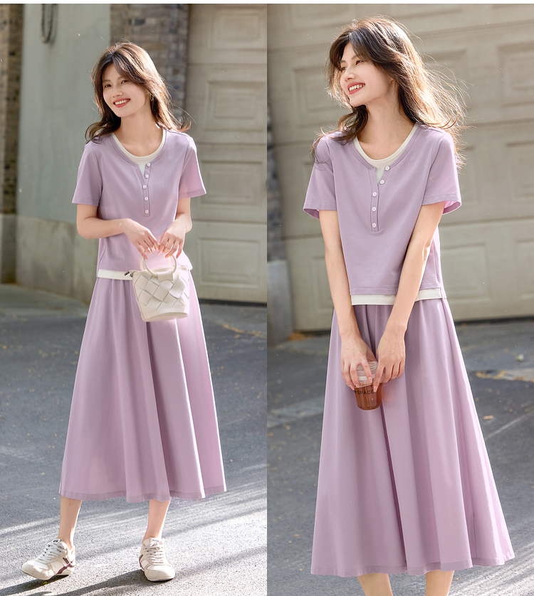 【周末秒杀】熙世界夏日休闲套装2025新款女装气质紫色假两件T恤半身裙两件套