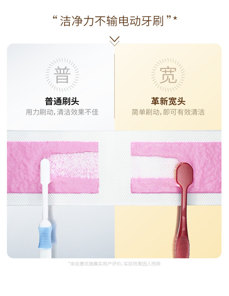 一般牙刷其实时刷不到牙龈和牙齿之间的牙龈沟,但是惠百施这个宽头牙刷就可以直接刷到牙龈!