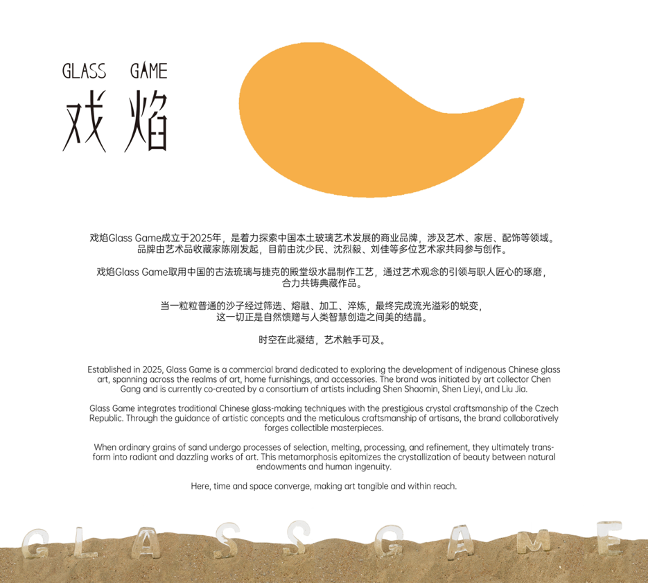 戏焰glass game成立于2025年,是着力探索中国本土玻璃艺术发展的商业品牌,涉及艺术、家居、配饰等领域。品牌由艺术品收藏家陈刚发起,目前由沈少民、沈烈毅、刘佳等多位艺术家共同参与创作。