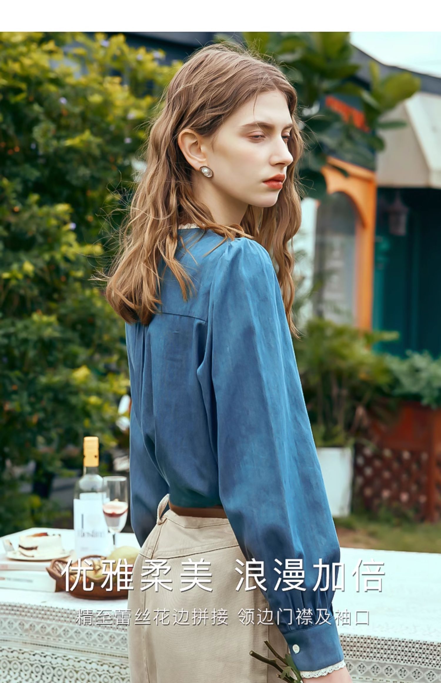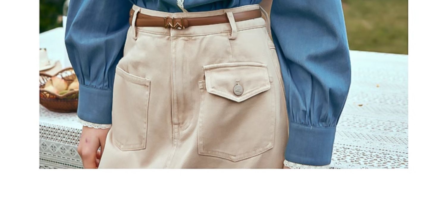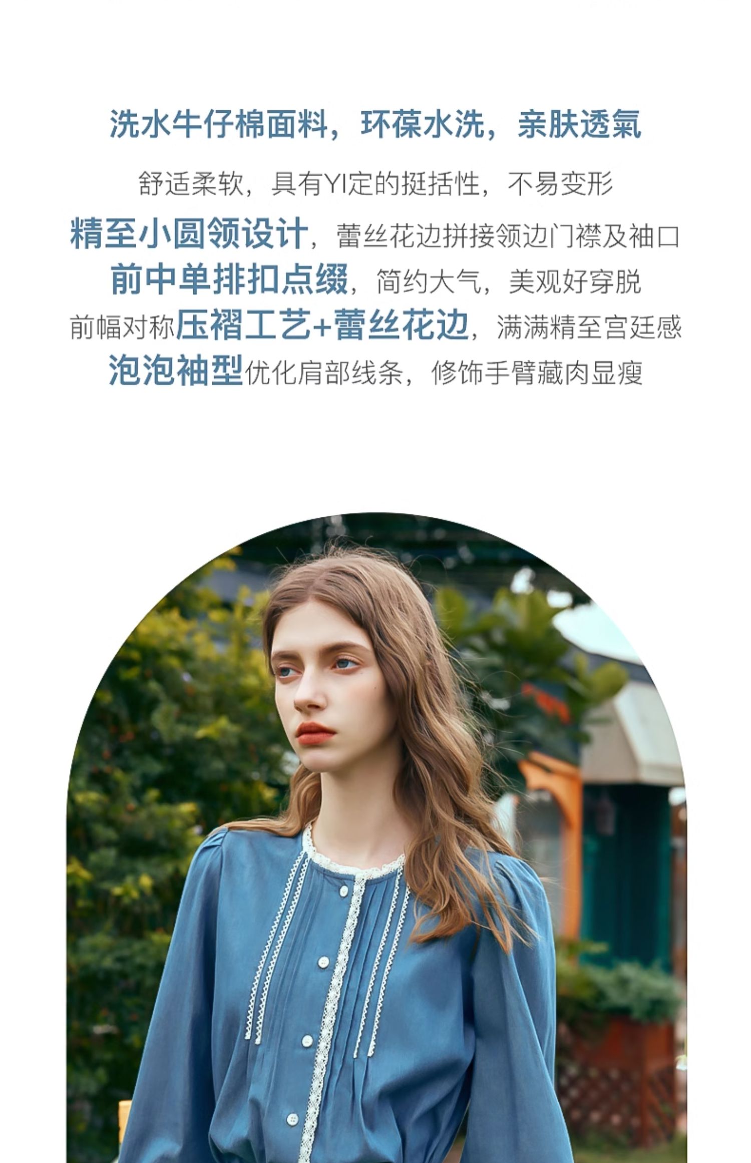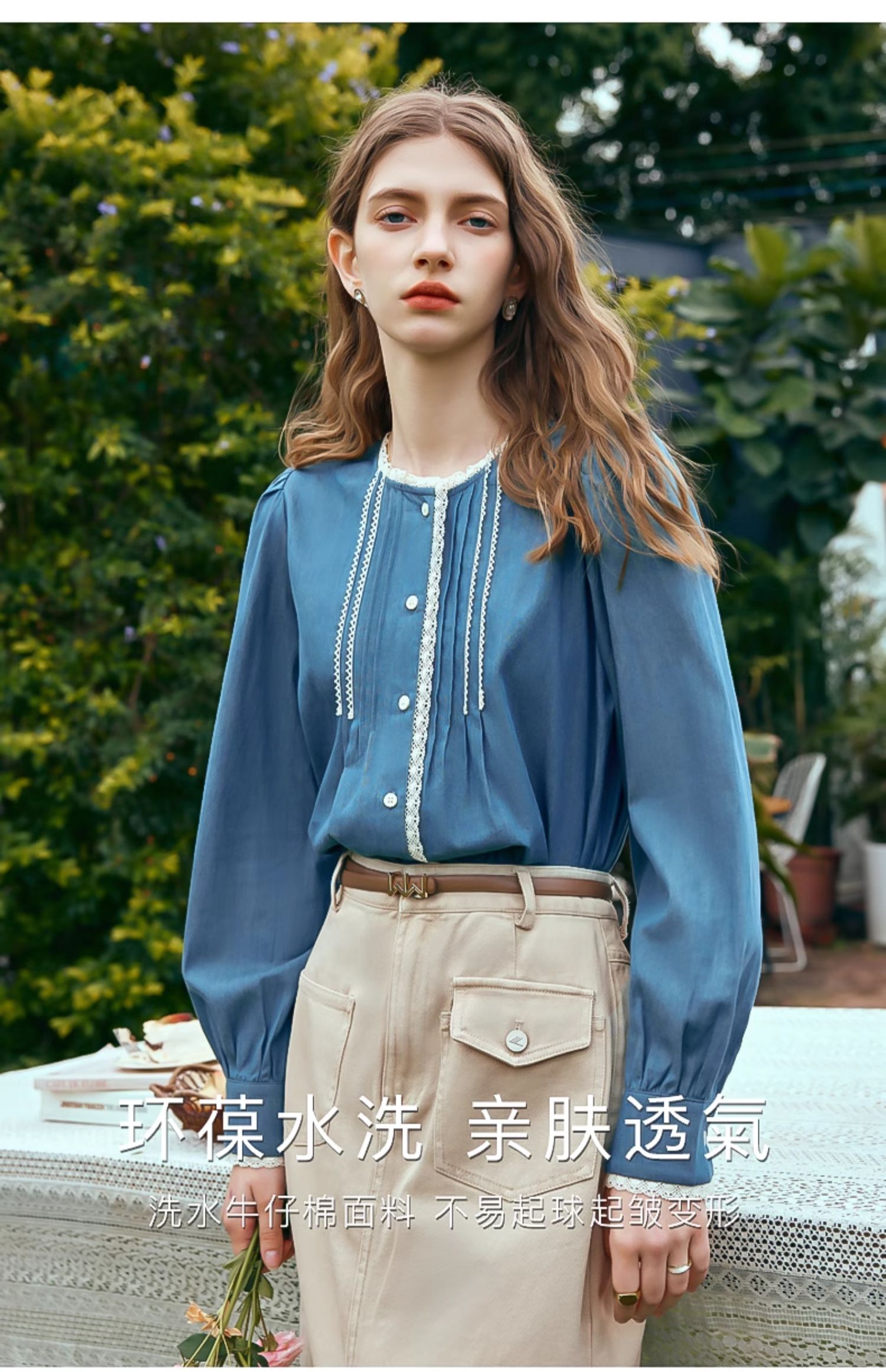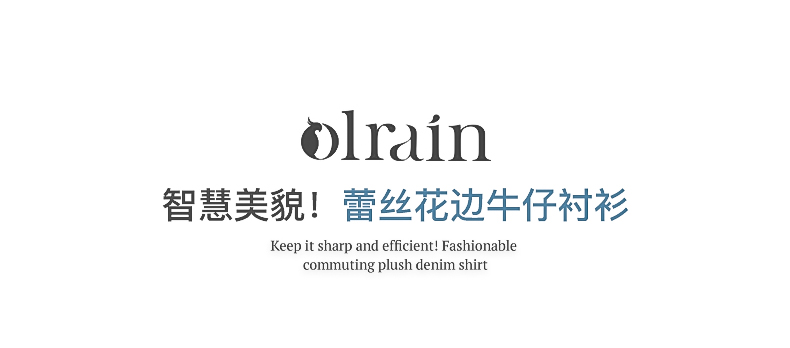 OLrain欧芮儿蓝色衬衫女春季2024年新款蕾丝花边水洗牛仔衬衣上衣