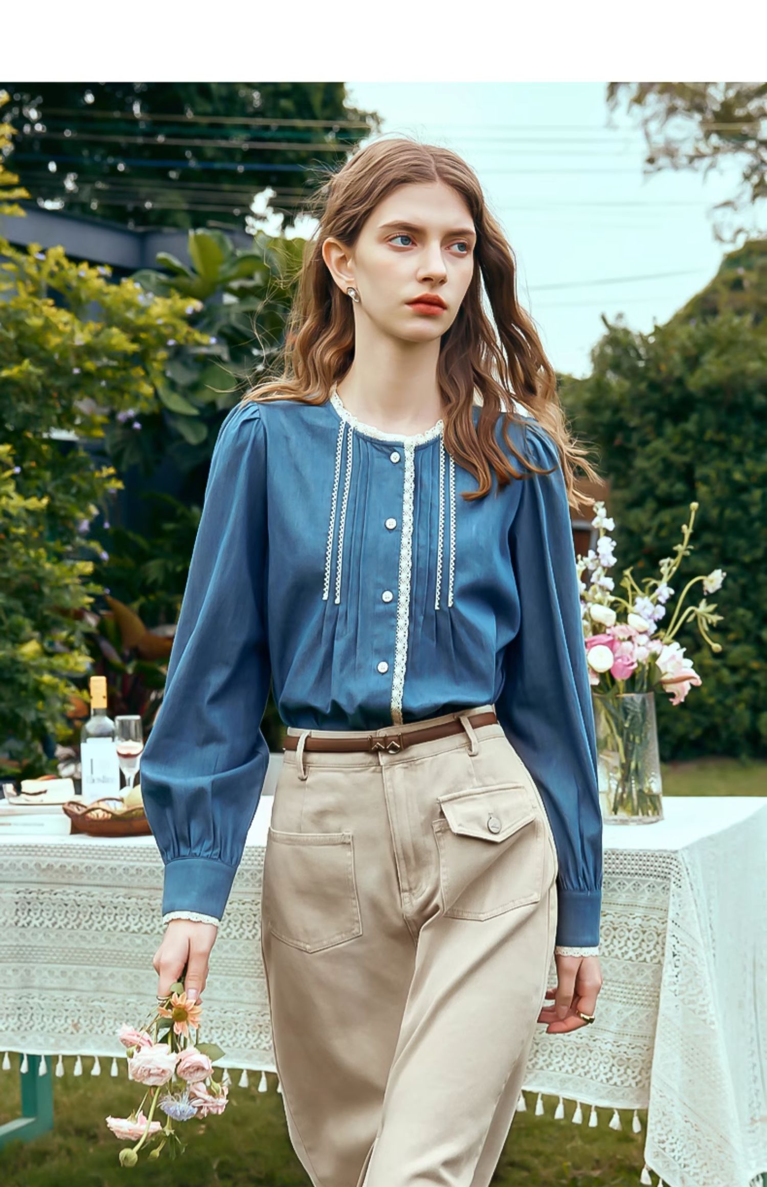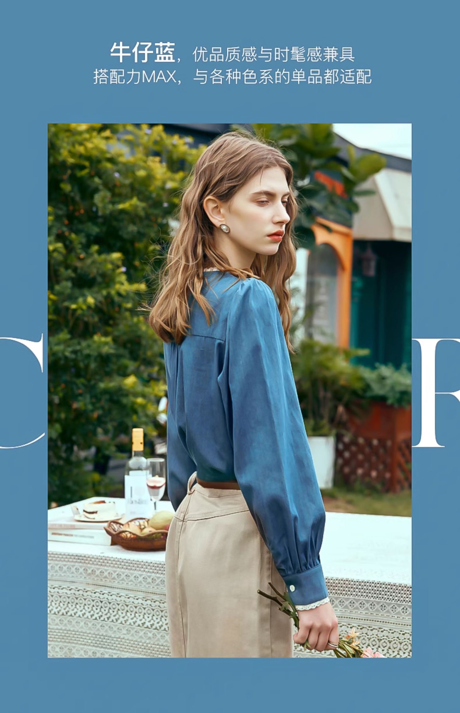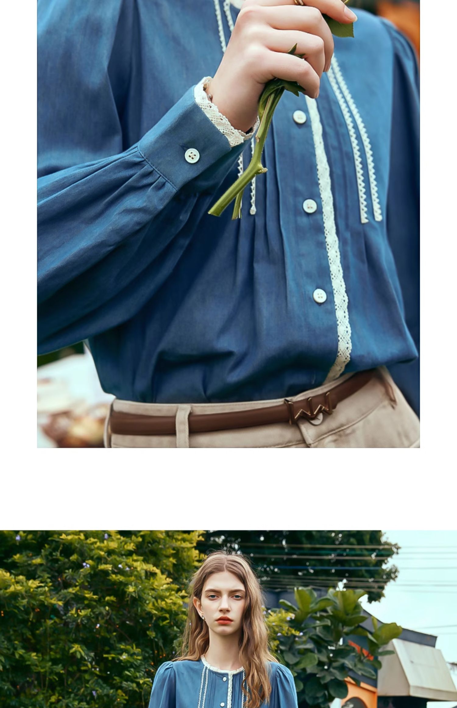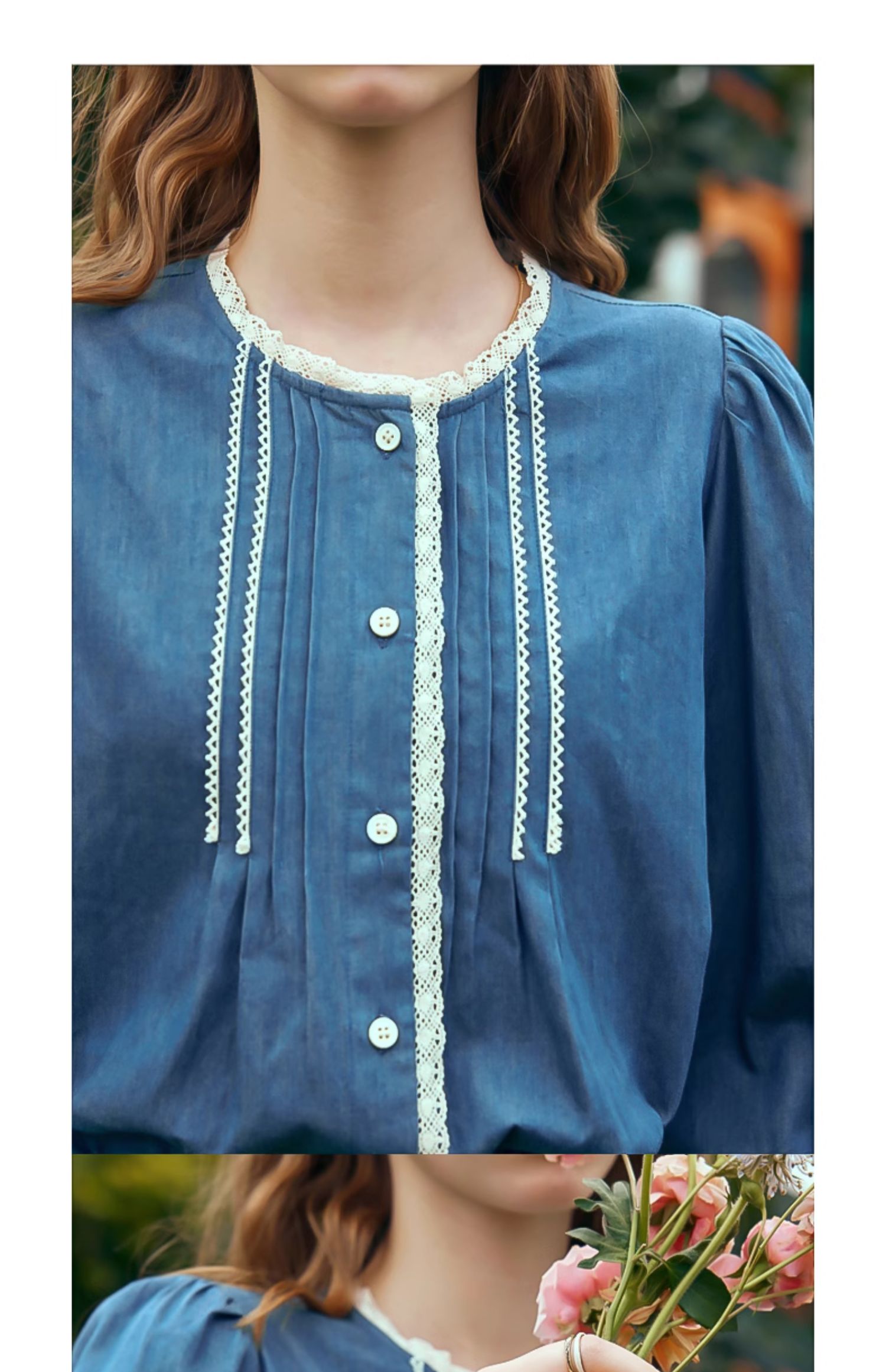 OLrain欧芮儿蓝色衬衫女春季2024年新款蕾丝花边水洗牛仔衬衣上衣
