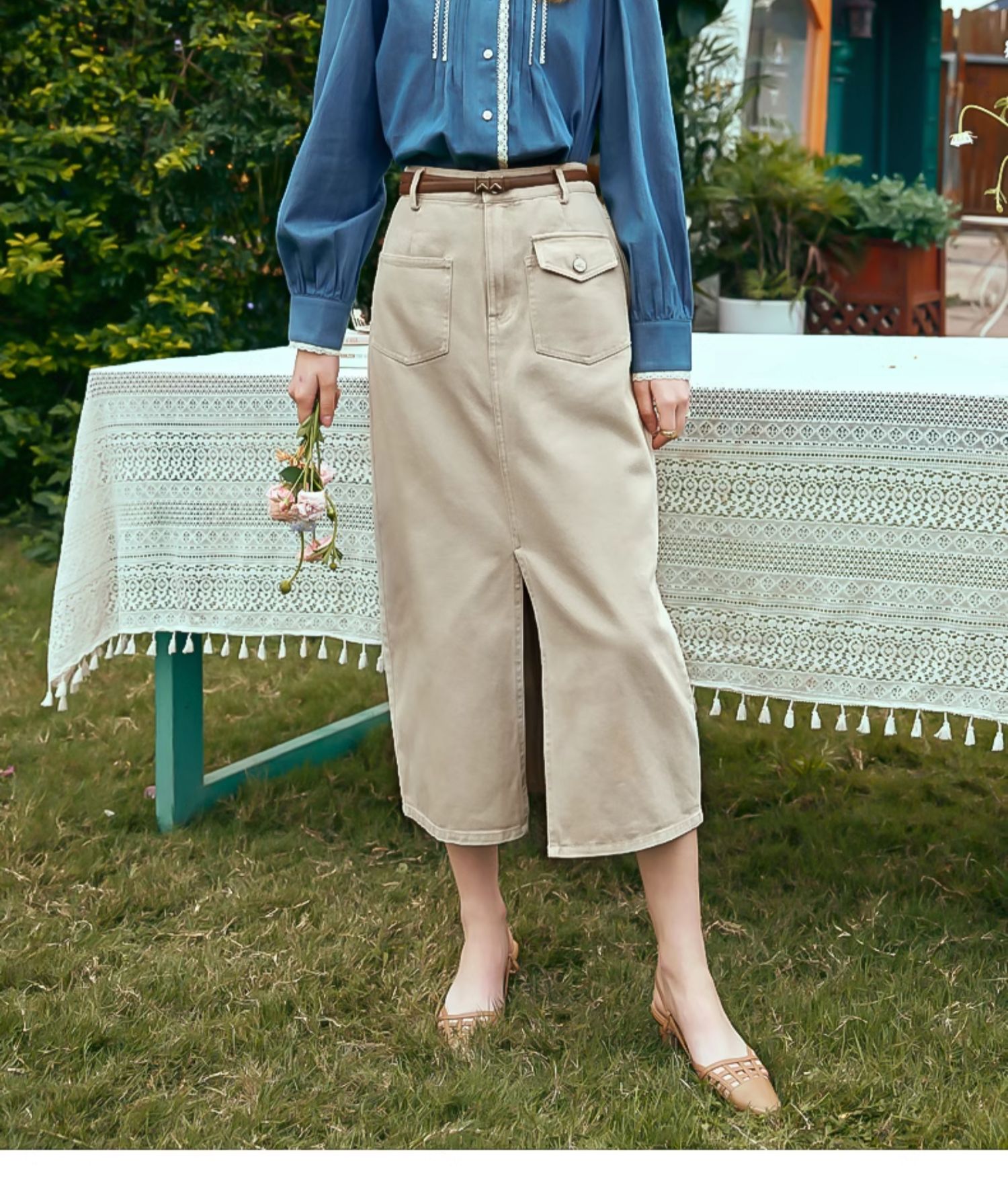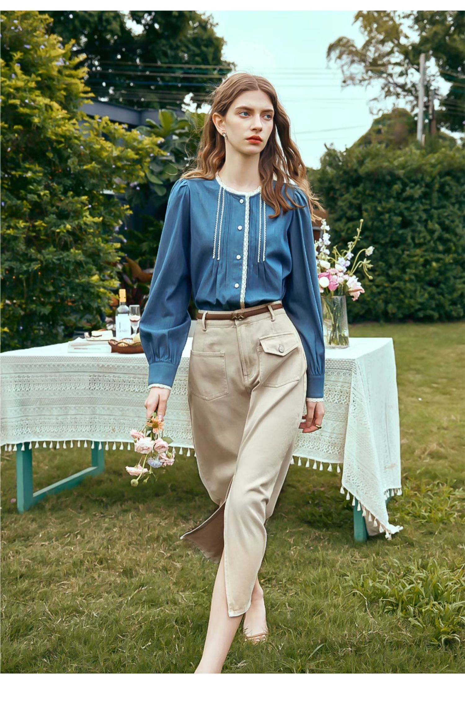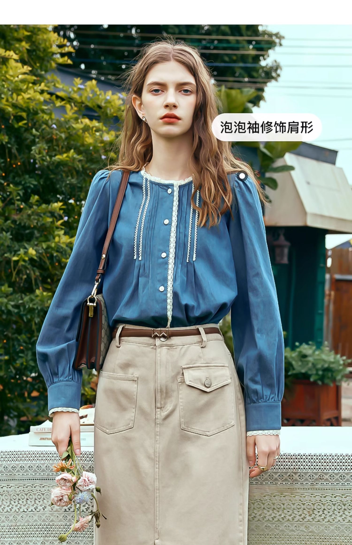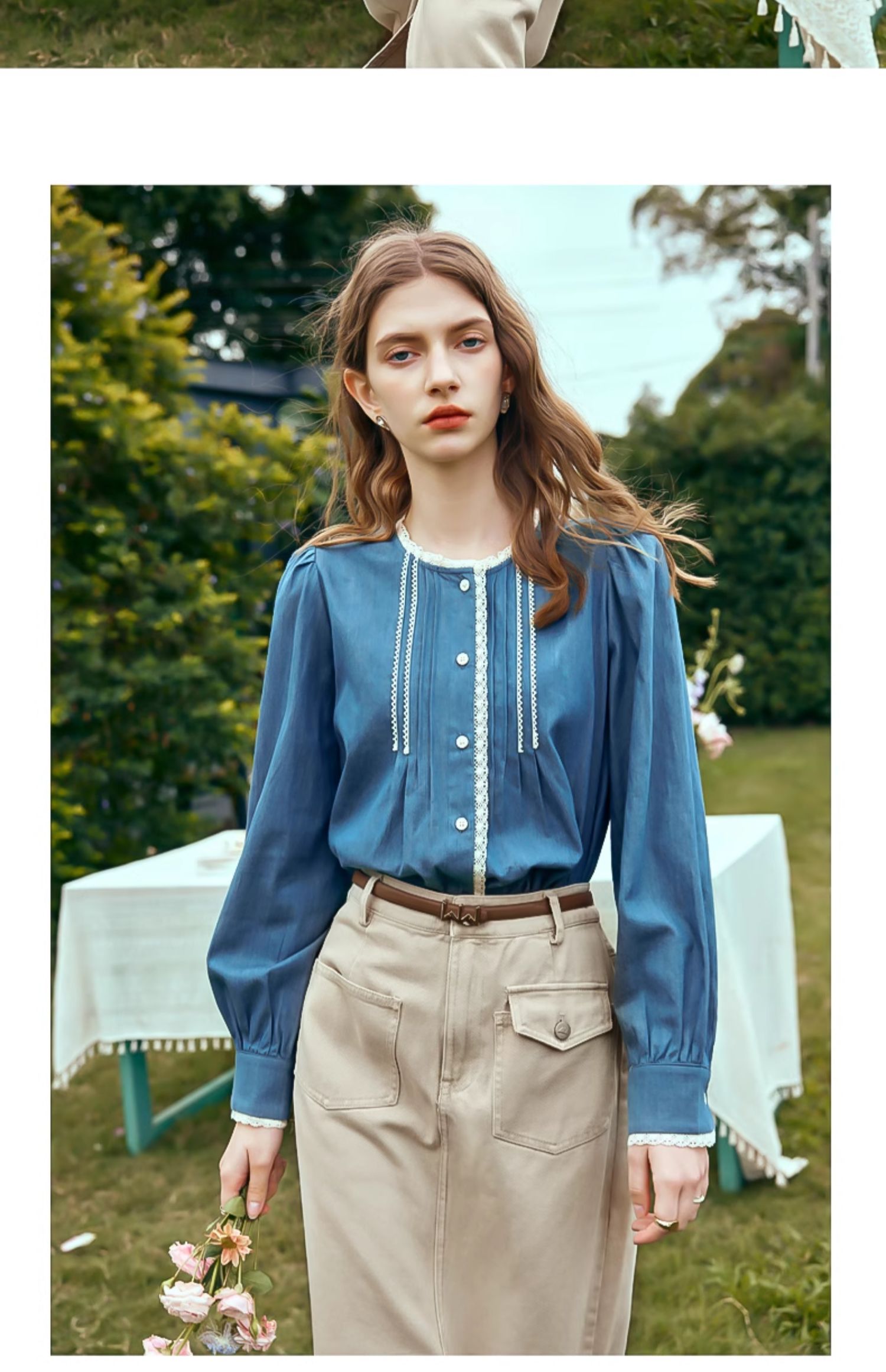 OLrain欧芮儿蓝色衬衫女春季2024年新款蕾丝花边水洗牛仔衬衣上衣