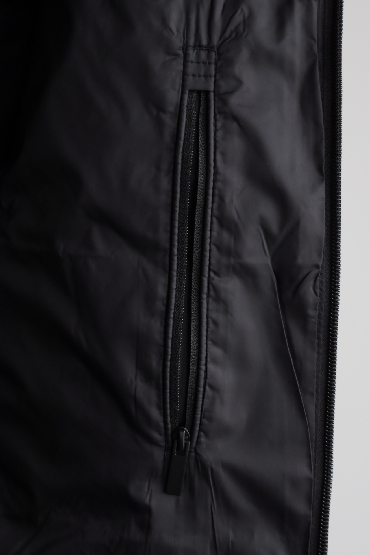 尼龙衬里,可拆卸双层聚酯纤维兜帽,拉链开合,拉链口袋