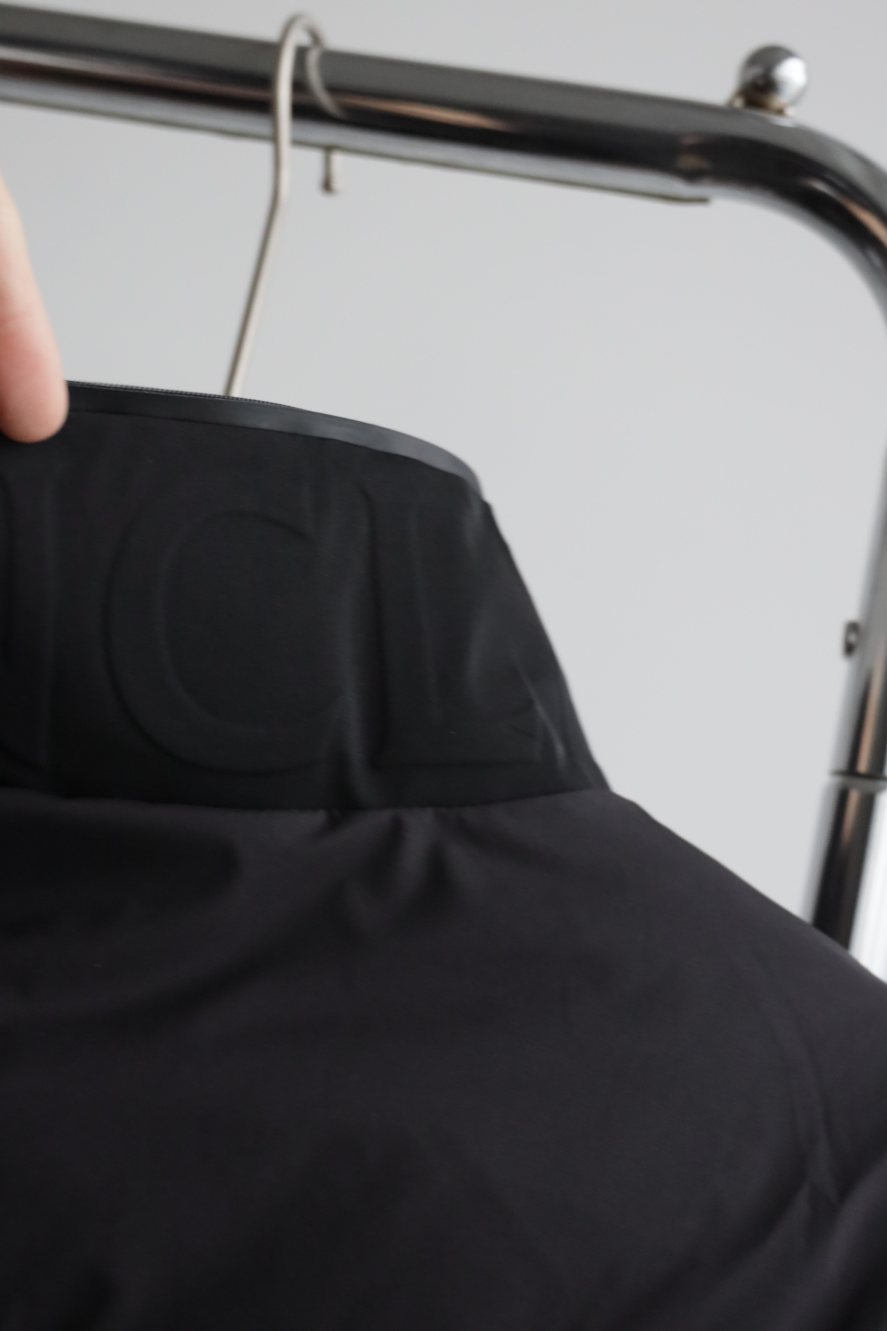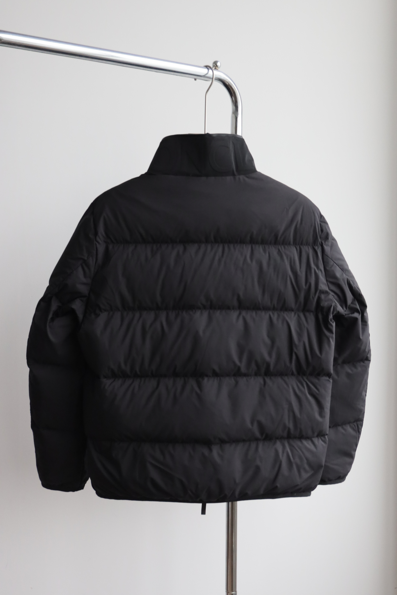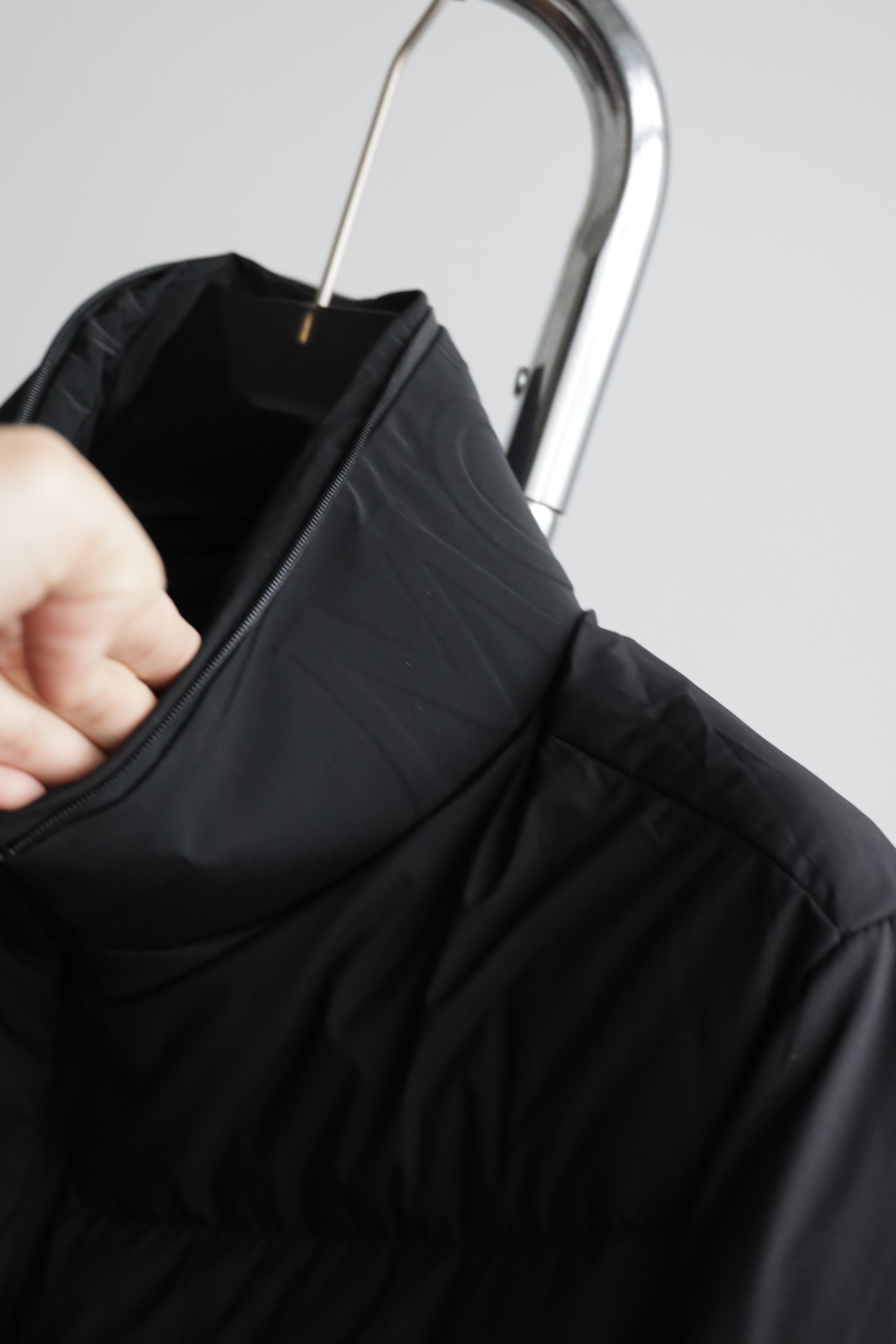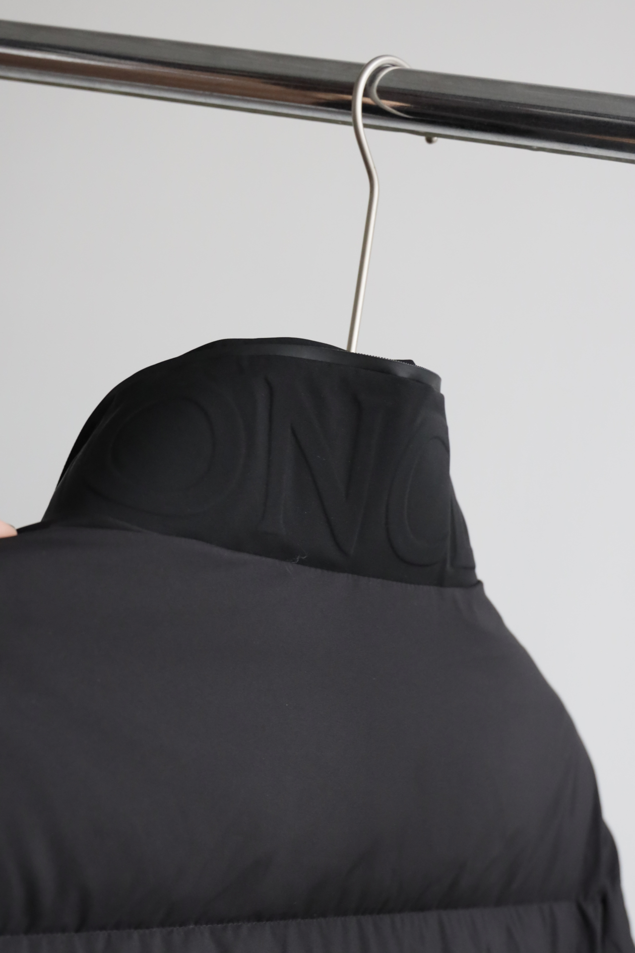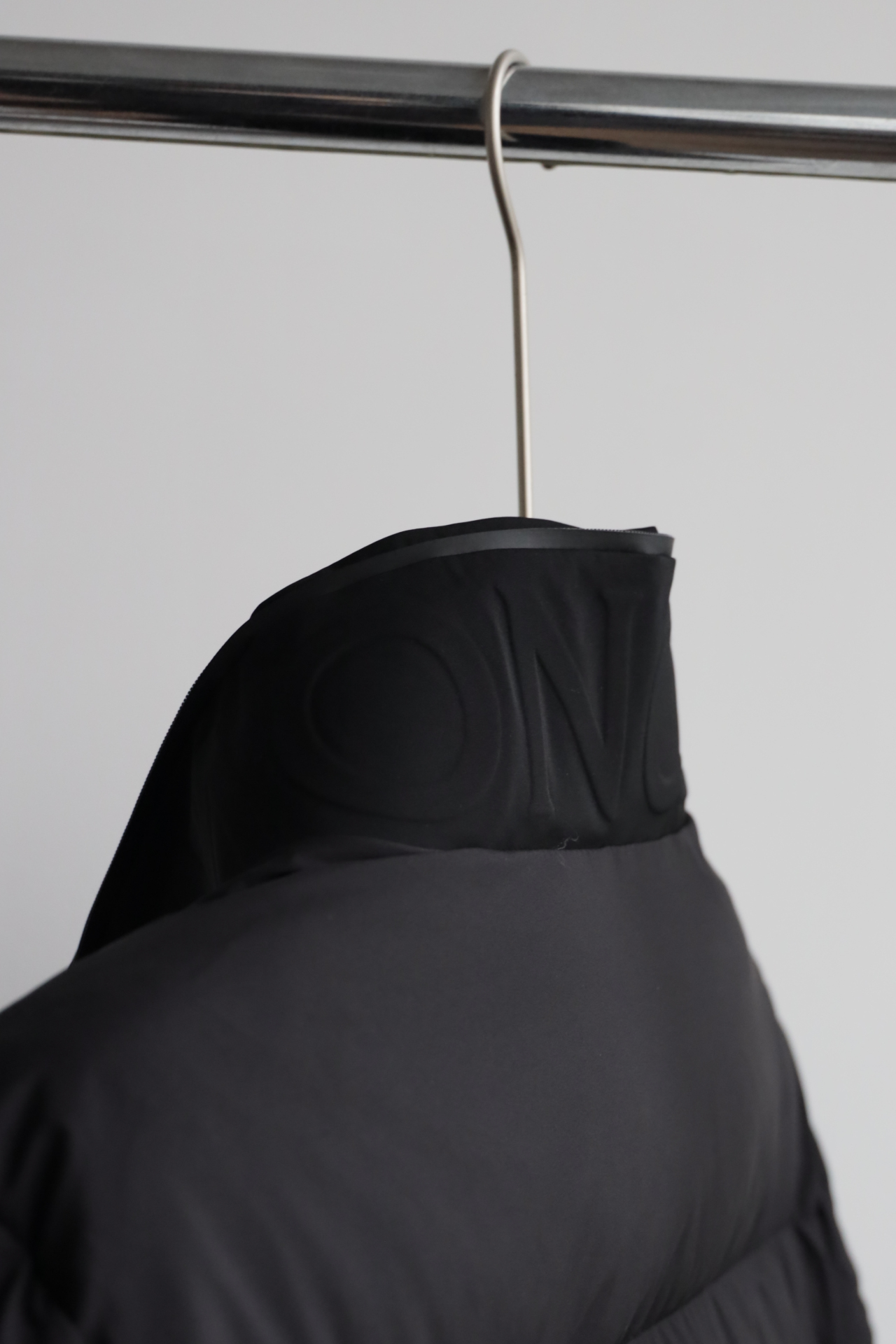 兜帽拆卸后,立领呈现压纹同色系标识,增添别致的视觉体验和触觉细节。