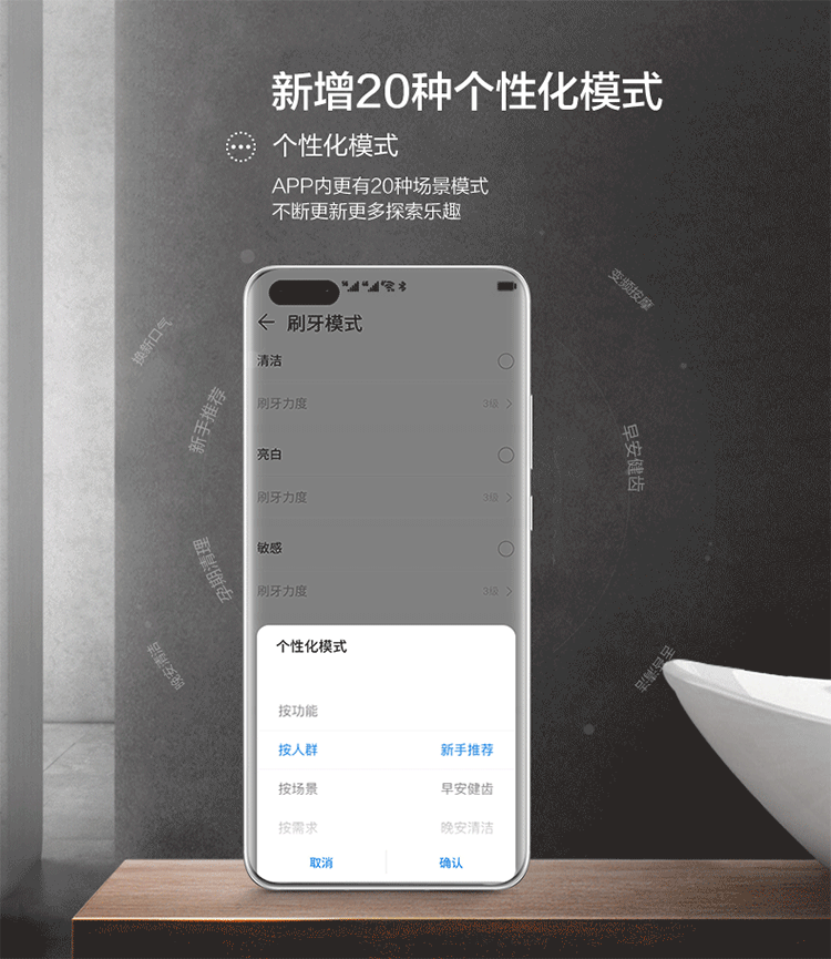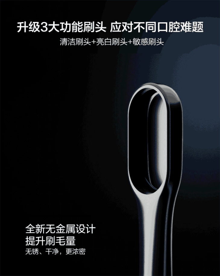 主机X 1、无铜刷头(清洁)X 1、无铜刷头(亮白)X 1、敏感刷头X 1、刷毛盖X 3、感应充电座X 1、输出轴套X 1、说明书X 1