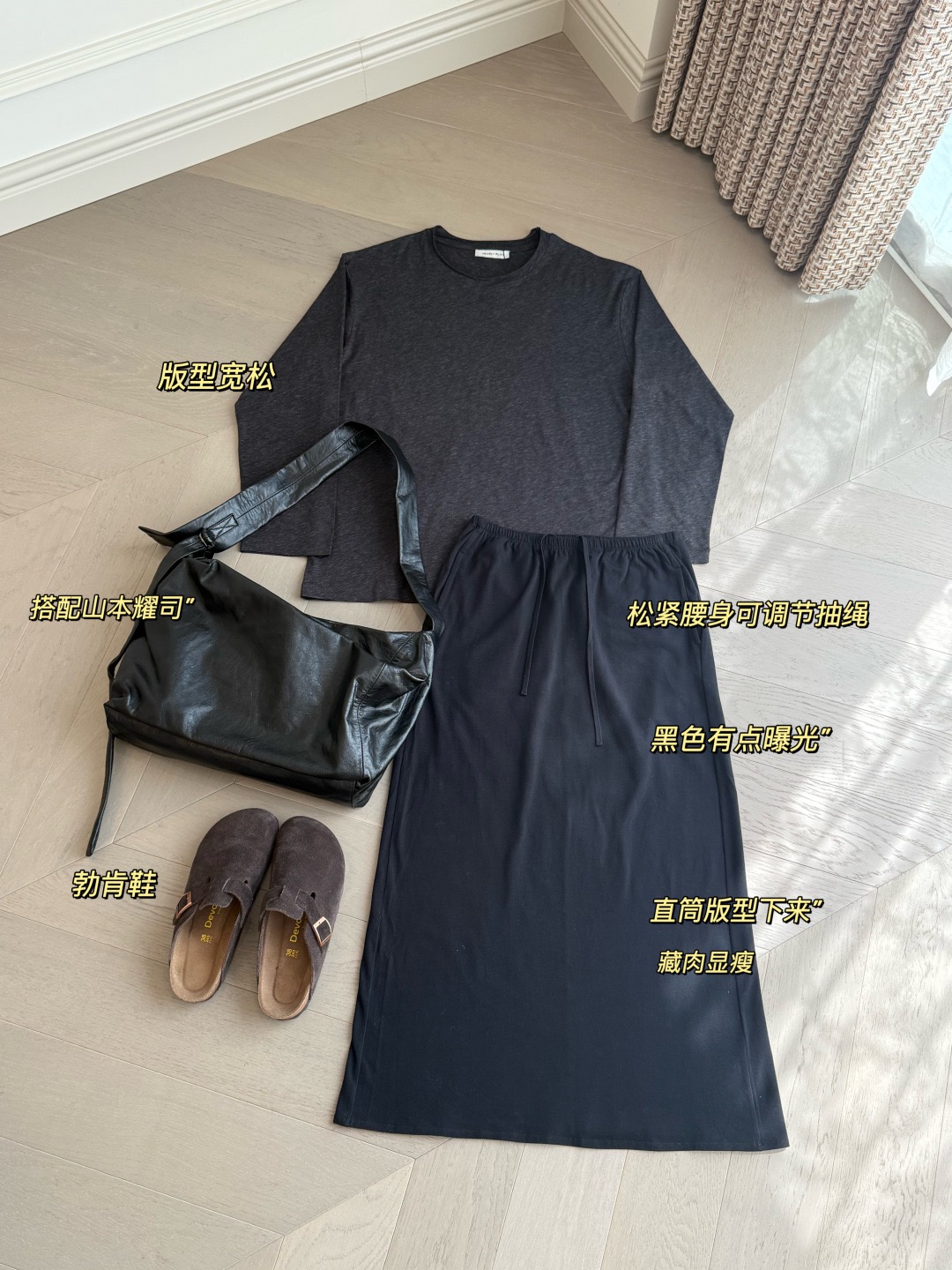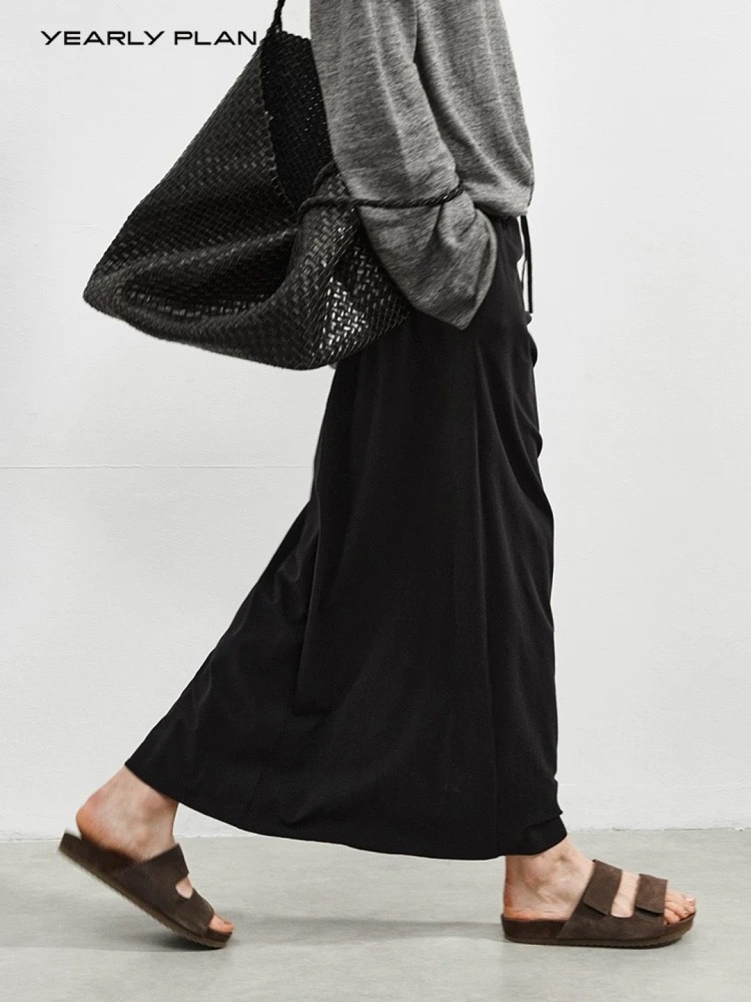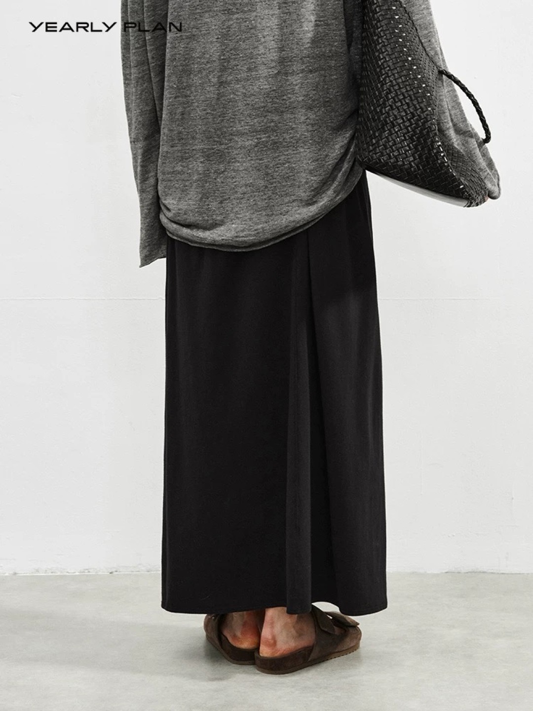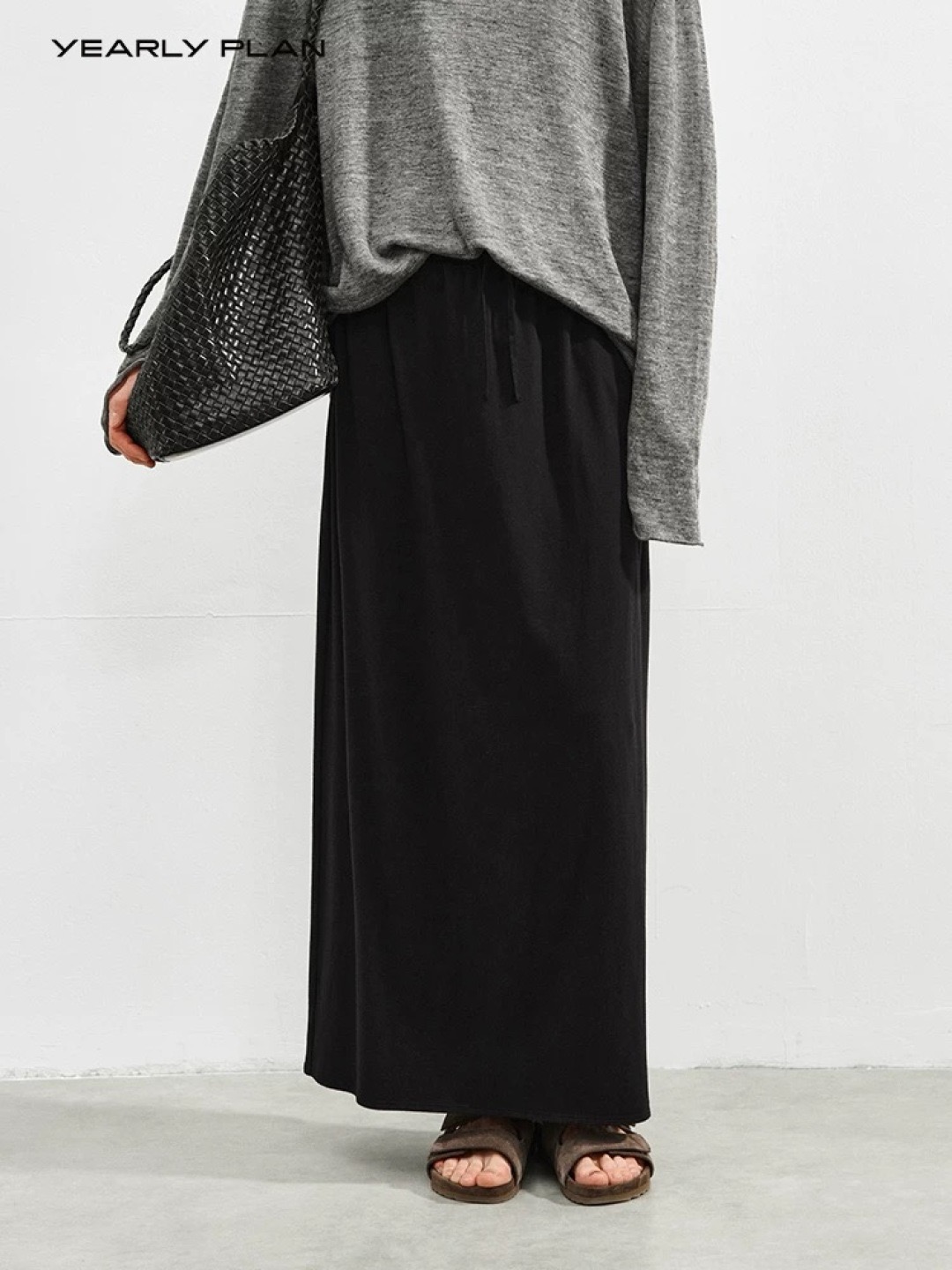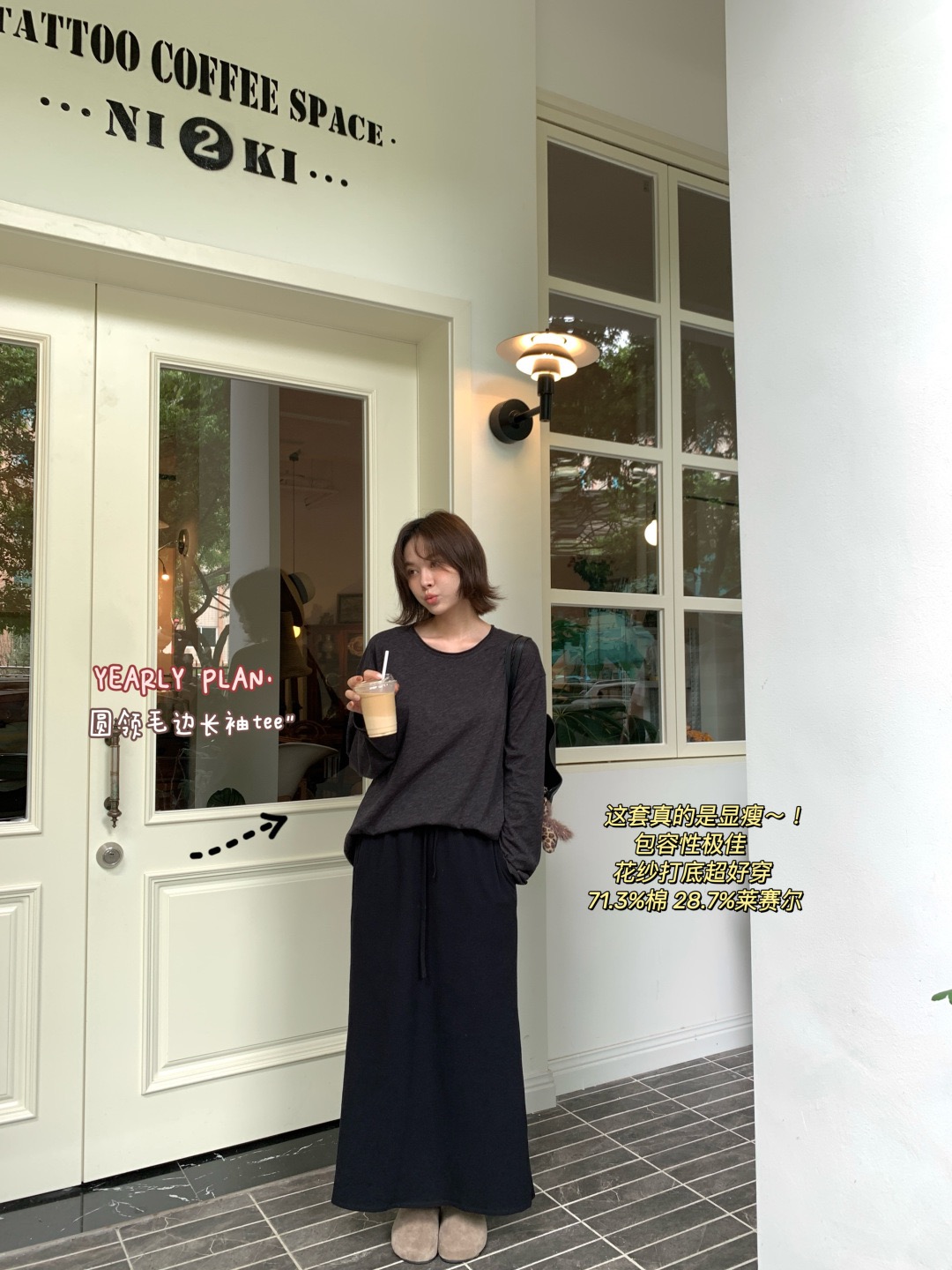 韩国进口面料,💪YEARLY PLAN混纺毛边圆领长袖tee打底➕垂感针织抽绳半身裙