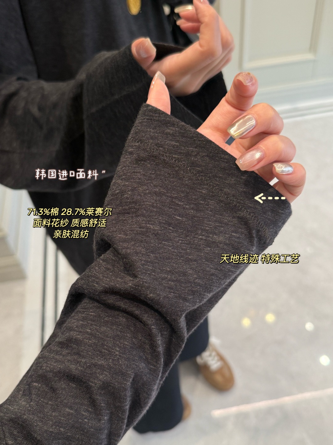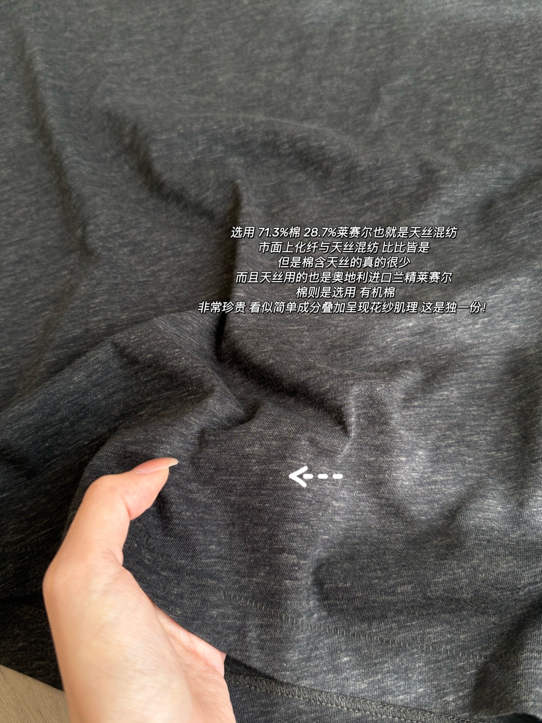 💪上衣长袖选用71.3%棉、28.7%莱赛尔,也就是天丝混纺,天丝是奥地利进口兰精莱赛尔,棉则是选用有机棉。