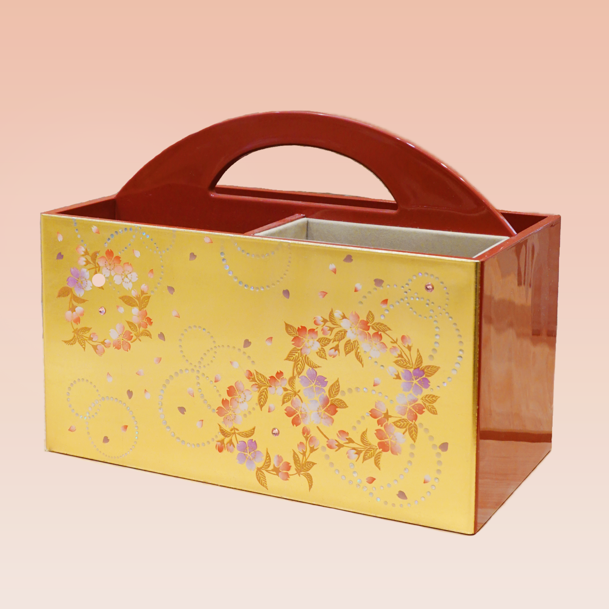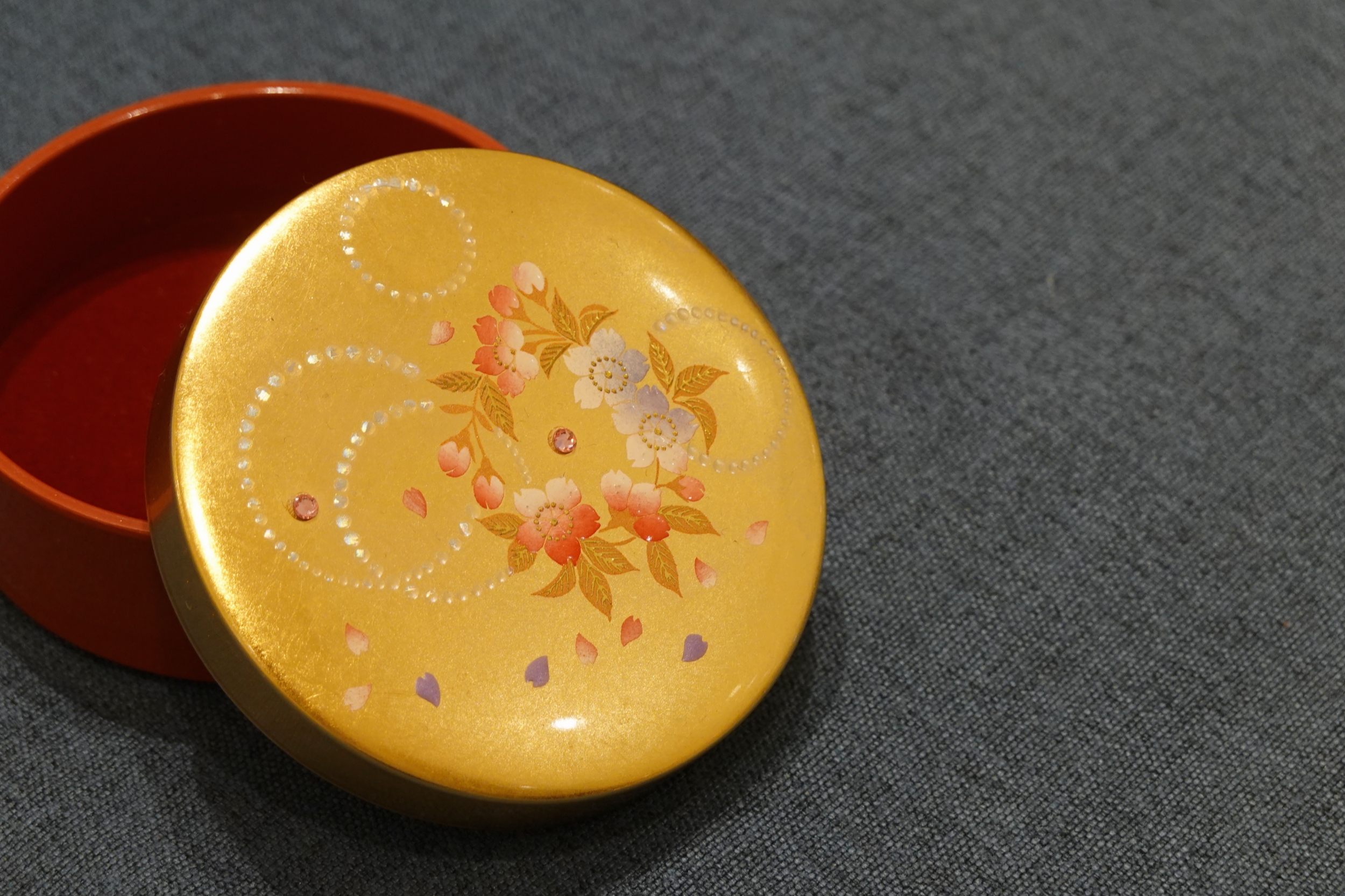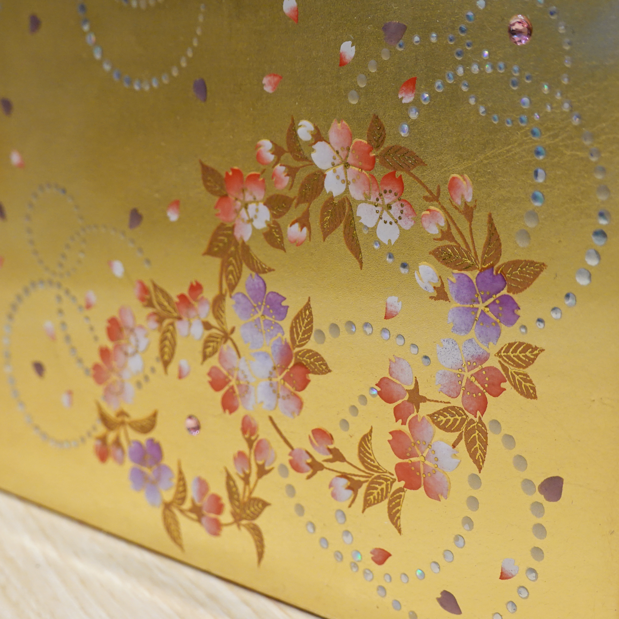 自古以来流传下来的传统技术,在首饰盒上贴上金箔,再用笔逐一勾勒细节,表面高低起伏,错落有致,花瓣的渐变色柔和典雅,整个画面中利用水钻点缀,可以说是画龙点睛,使得整个画面更加生动。