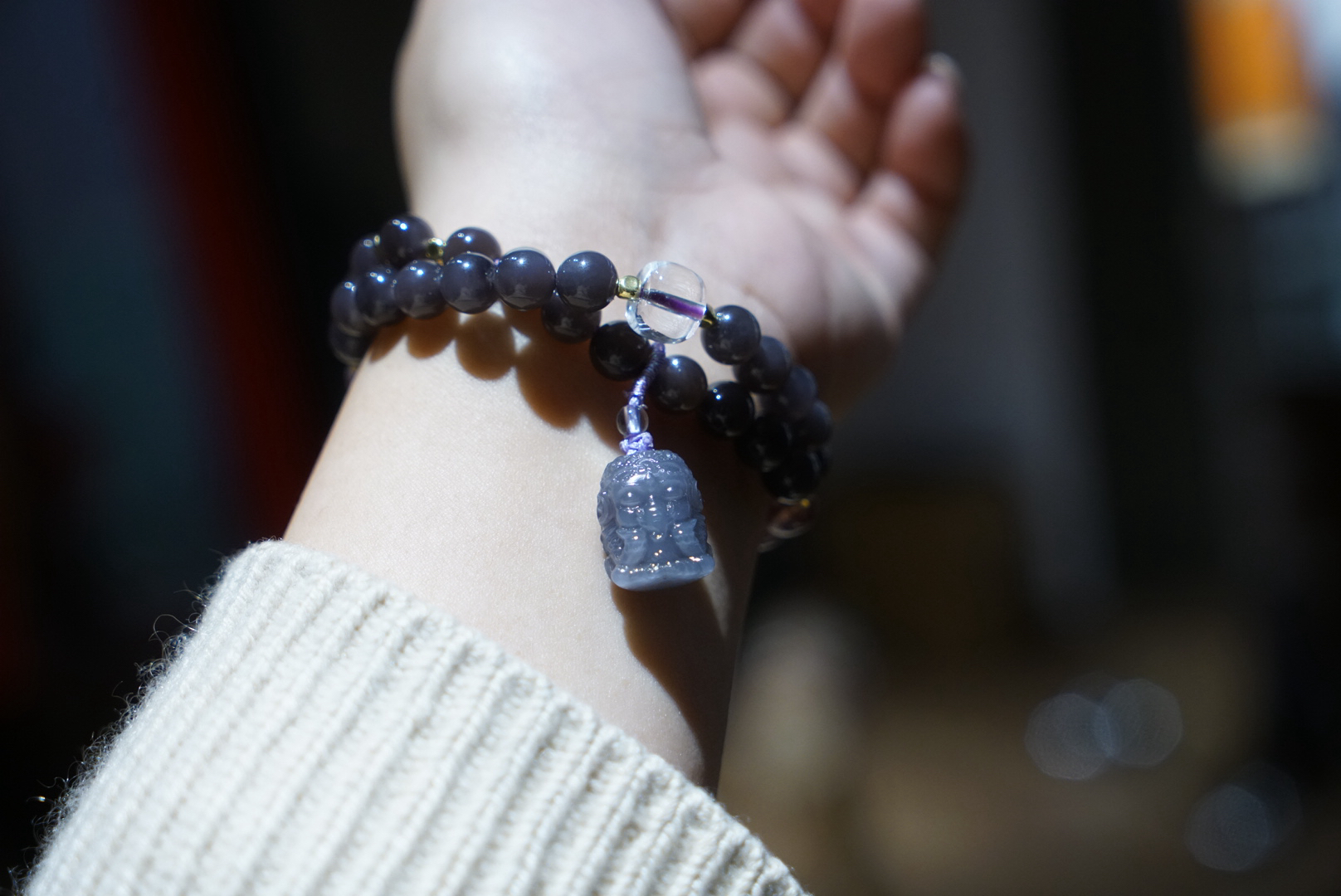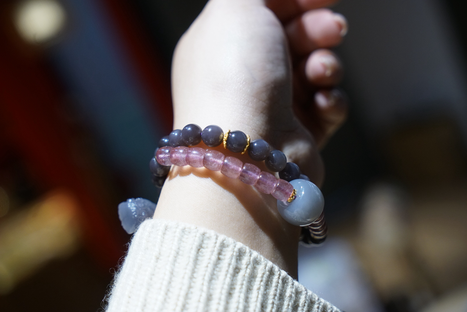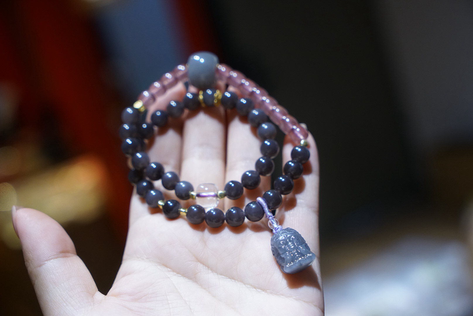 超级无敌美的一条8mm浓郁烟紫和田玉,吊坠是小象,颜色料子都很棒,顶珠大珠珠和吊坠小象都是烟紫和田玉哦,超萌的象!即使取下来也是可以单独当吊坠的品质!点缀草莓晶~显得更加少女俏皮~嘿嘿!十年实体一线市场品控,只卖精品品质。