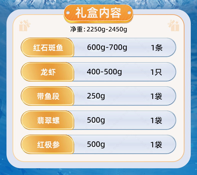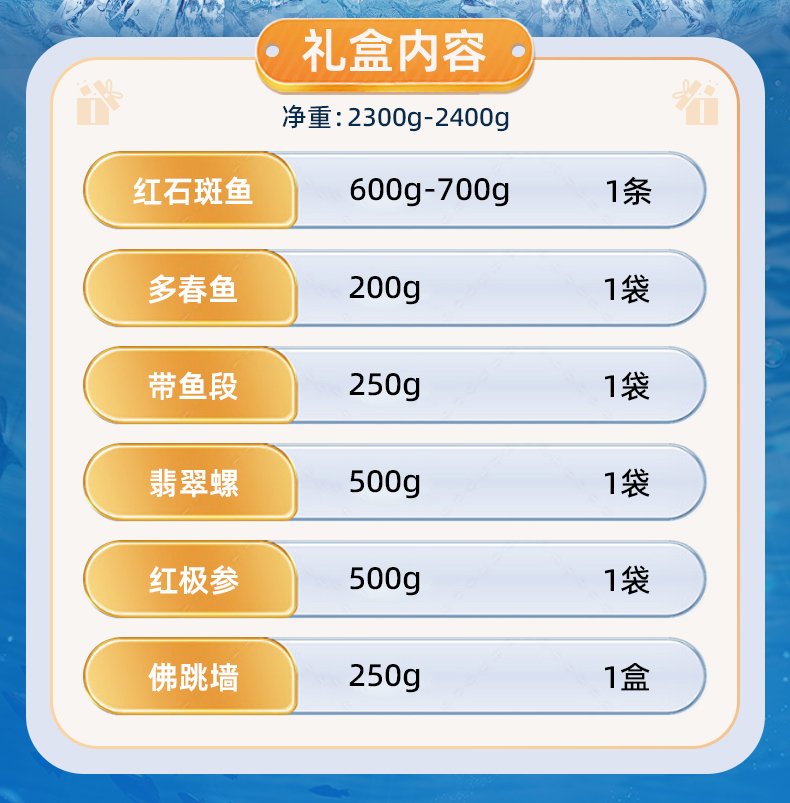 | 【品名】海朴海鲜礼盒 【规格】 有鱼(余)有福1300g-1400g(红石斑鱼600-700g*1+多春鱼200g*1+带鱼段250g*2) 鱼乐无穷1800g-1900g](翡翠螺500g*1+红石斑鱼600-700g*1+多春鱼200g*1+红极参500g*1) 吉庆有鱼2300g-2400g(翡翠螺500g*1+红石斑鱼600-700g*1+多春鱼200g*1+红极参500g*1+带鱼段250g*1+佛跳墙250g*1) 鱼跃龙门2250g-2450g(龙虾400-500g*1+翡翠螺500g*1+红石斑鱼600-700g*1+带鱼段250g*1+红极参500g*1) 【包装】礼盒+泡沫箱+冰袋 【产地】辽宁大连 【发货地】大连、武汉 【发货快递】顺丰、京东 【不发货区域】新疆、西藏、青海、甘肃、海南、港澳台、疫情地区不发货 【发货时效】48小时,周日节假日顺延 |