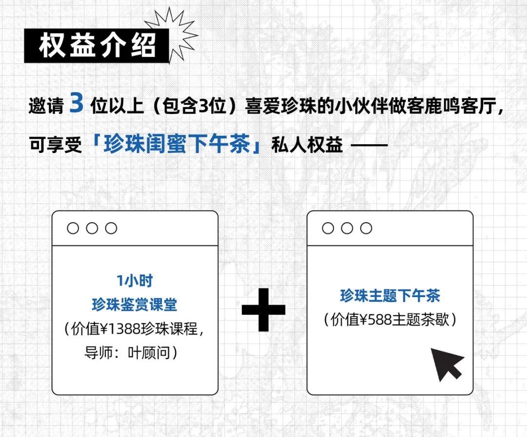 值此秋月佳期,诚邀各位鹿鸣VIP作为发起人,与闺中密友相约鹿鸣客厅,鉴赏珍珠、品茶雅叙,共度一个轻松愉悦的下午茶时间,同时听完一场一小时的专业实用的珍珠常识科普。