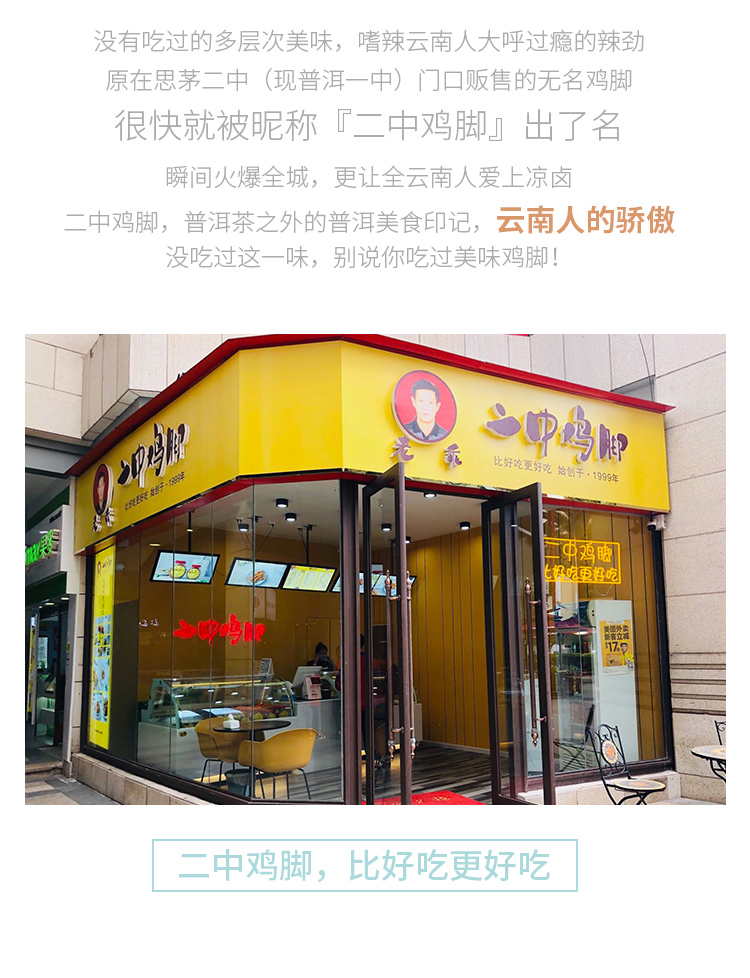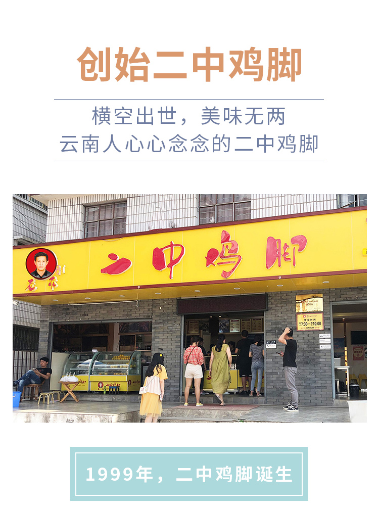 - “二中鸡脚’’是云南普洱的苏建云&金建华夫妇于1999年在思茅二中(现普洱一中)门口售卖自家精心制作的私房鸡脚,因为美味独特让人食指大动而名声大噪,从而得名“二中鸡脚”(意为二中门口售卖的鸡脚)
