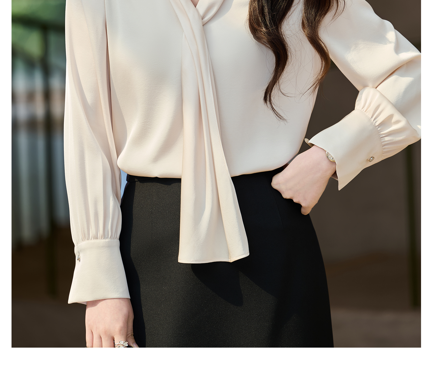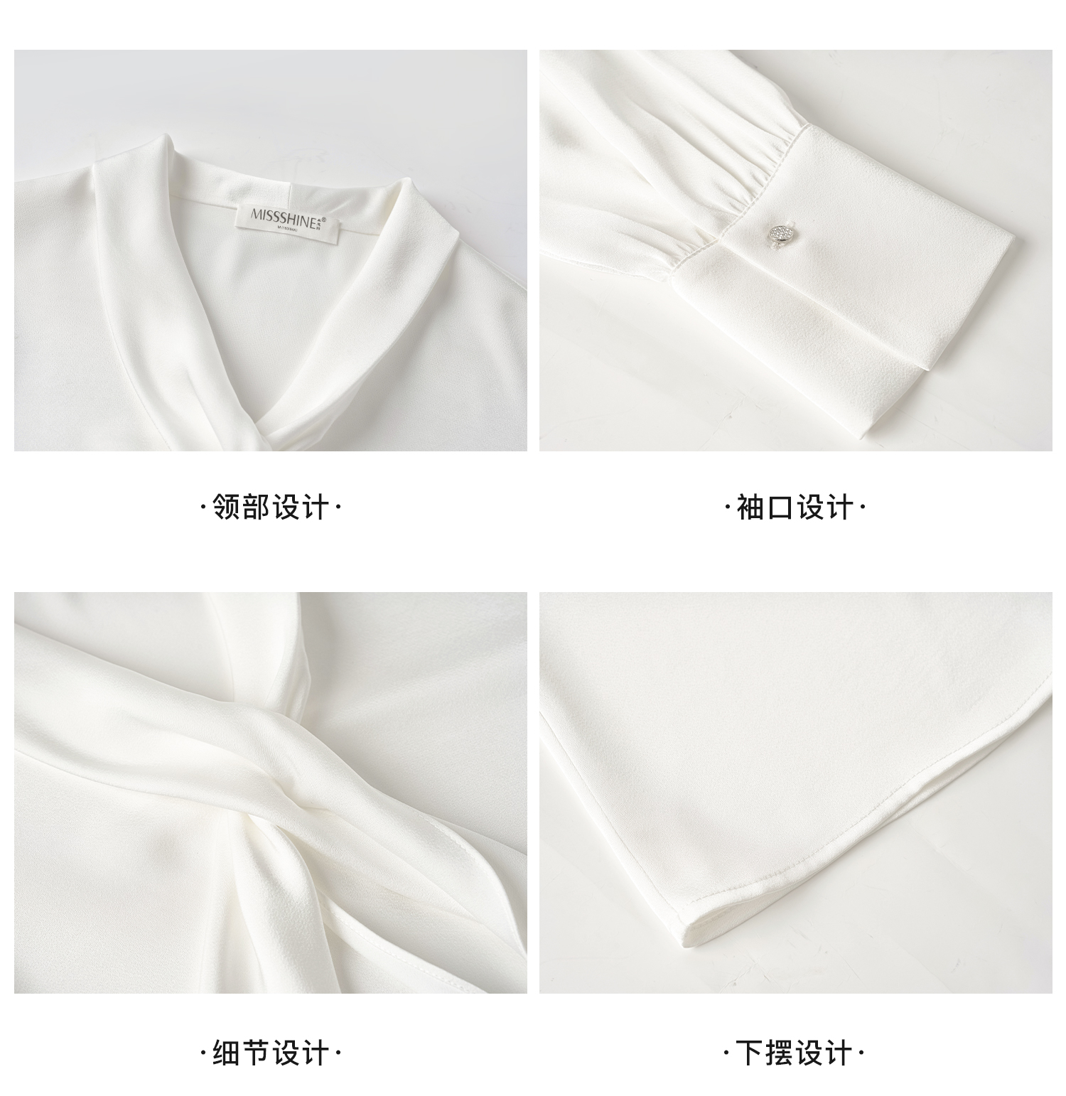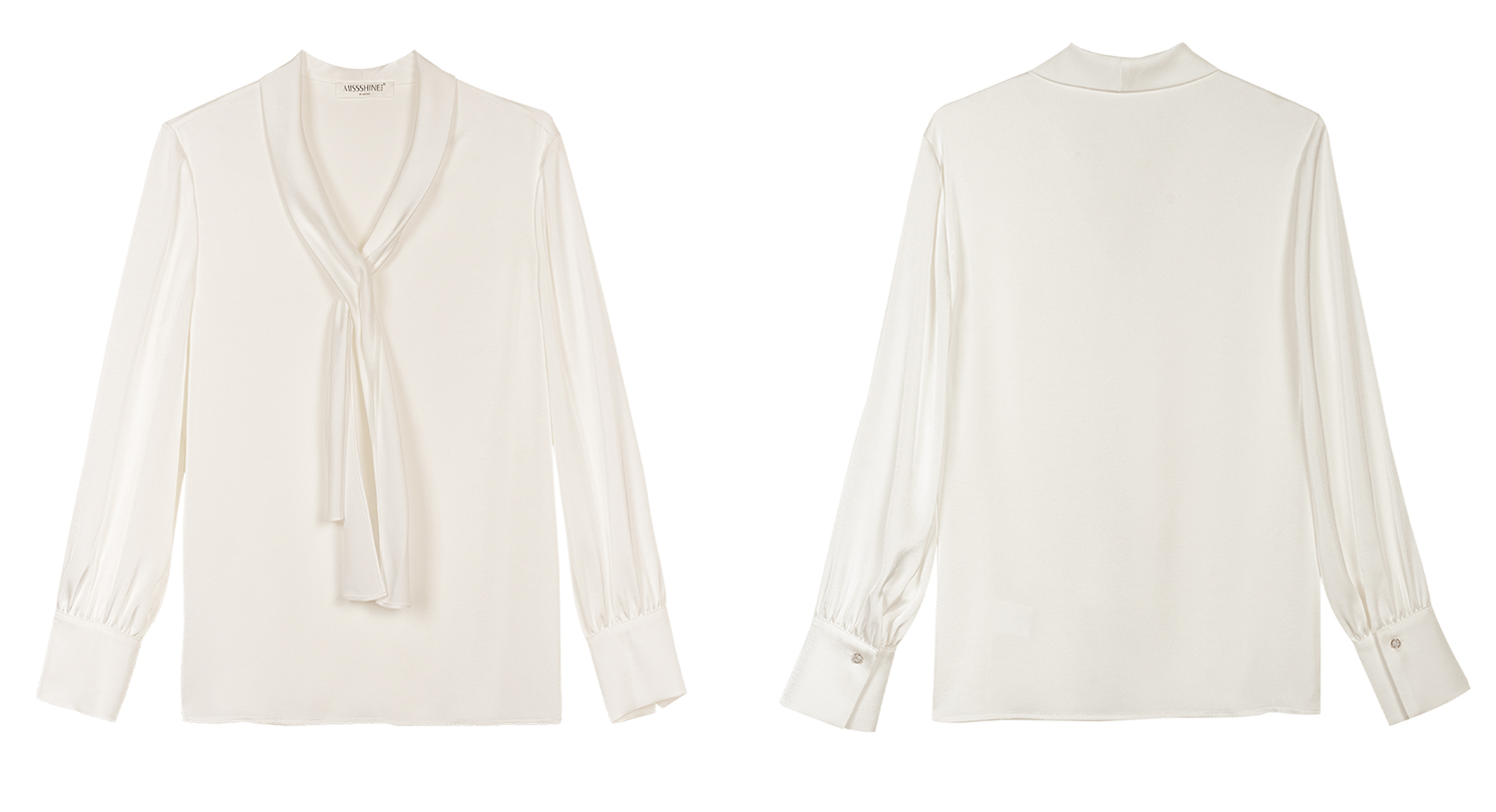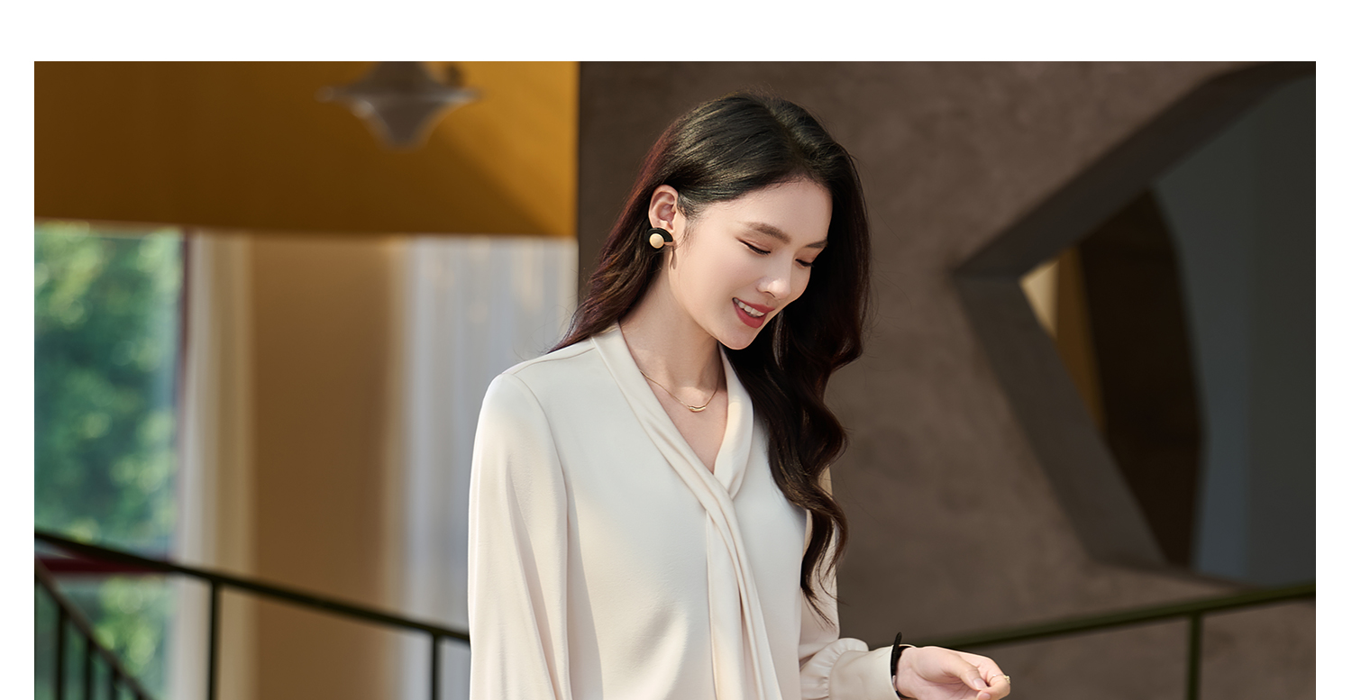 细腻柔光缎面飘带衬衫 经典黑白杏三色 通勤配西装、约会配半裙、开会配西裤皆可!米思阳2026春新款设计感通勤V领飘带领衬衫女5305
